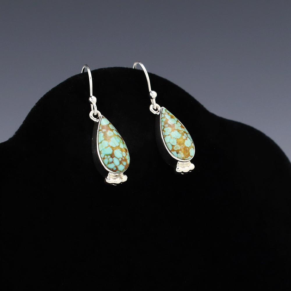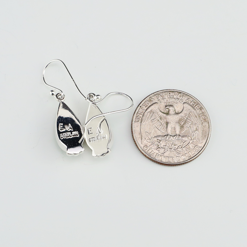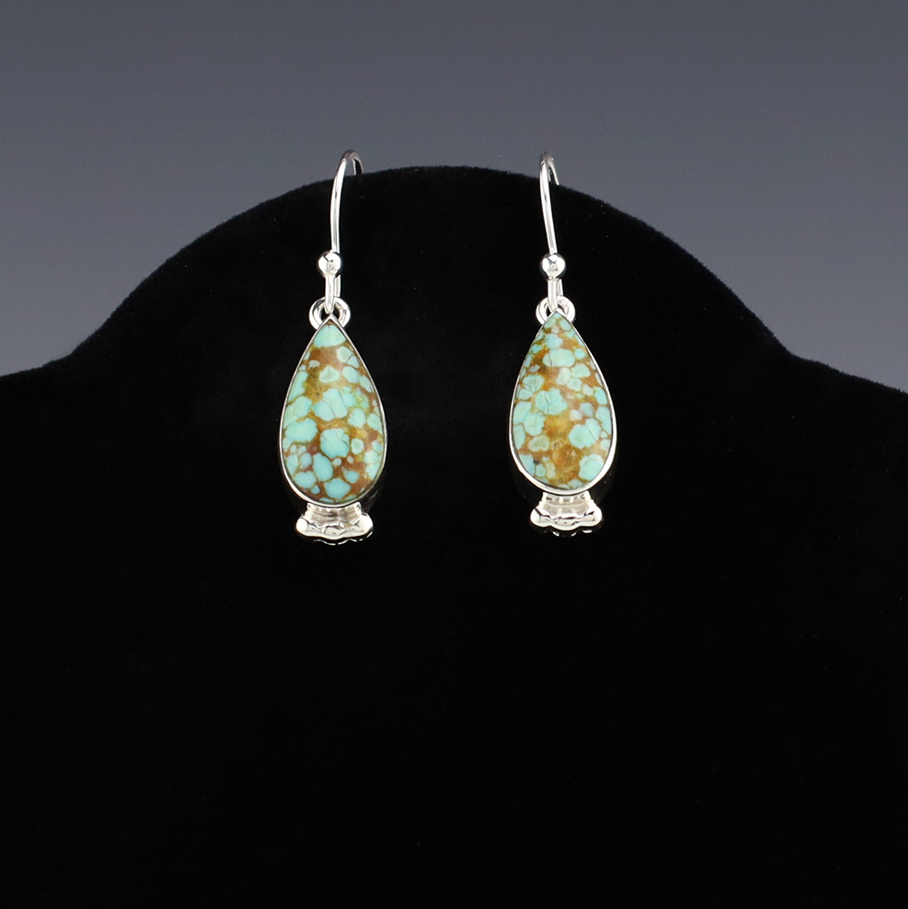 Gorgeous dangle earrings made out of sterling silver and set with Turquoise stones. Hand made by Navajo artist Erma Arviso. These fabulous earrings will become a versatile accessory in your jewelry collection. Weighs 4 grams. Signed