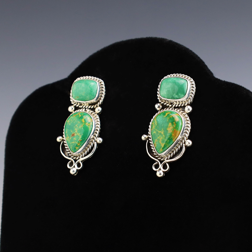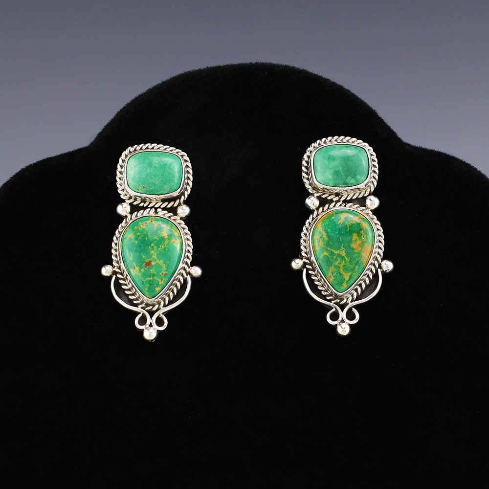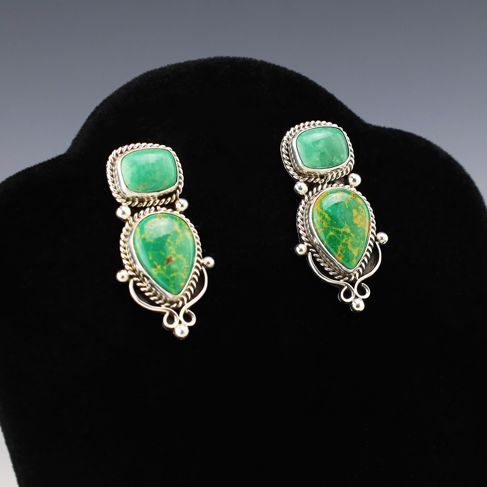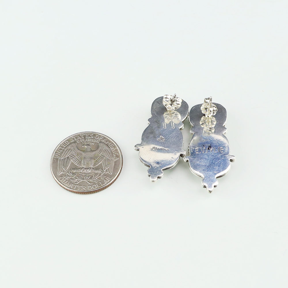 Lovely earrings hand made by Navajo silversmith Eula Wylie. The earrings are sterling silver and set with Turquoise stones. These fabulous earrings will become a versatile accessory in your jewelry collection. Weighs 10 grams. Signed.