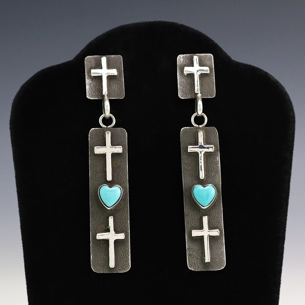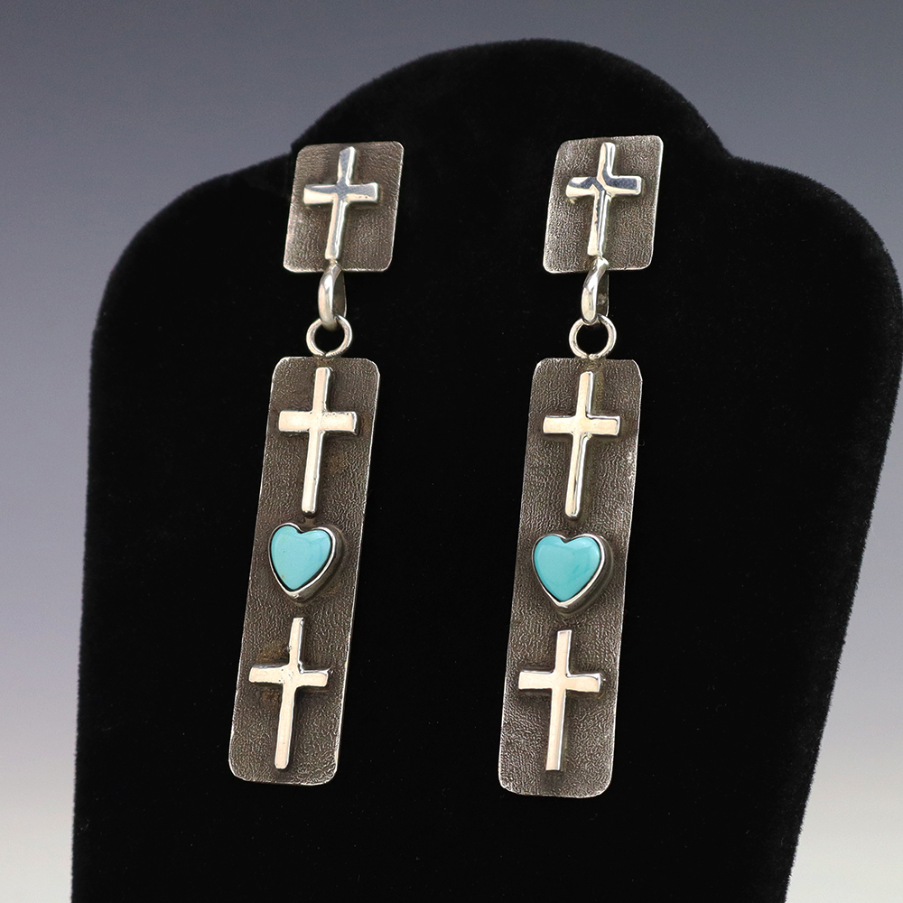 Gorgeous heart earrings hand made out of sterling silver and Turquoise by Navajo silversmith Ernest Rangel. These wonderful earrings will become a versatile accessory in your jewelry collection. Weighs 14 grams. Signed