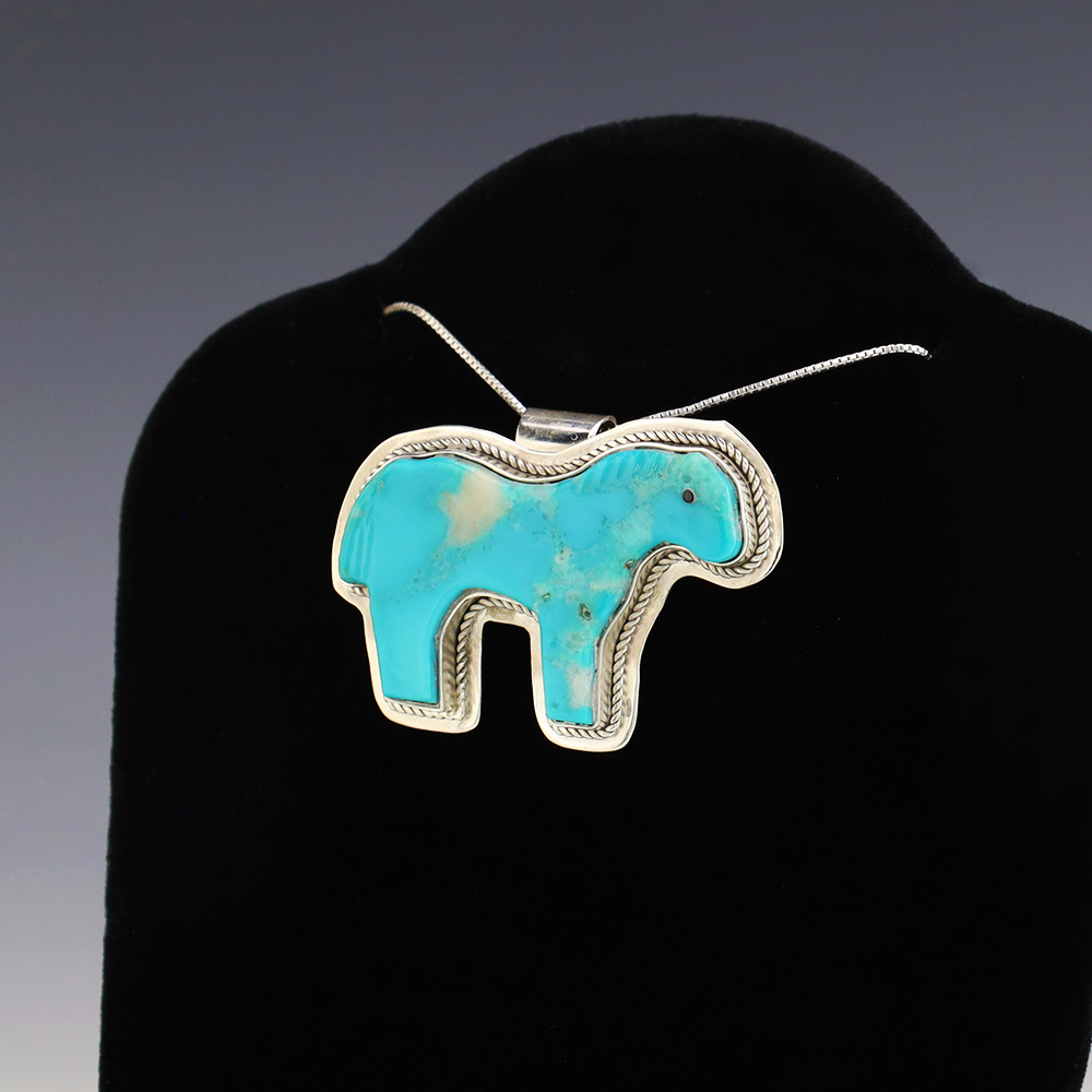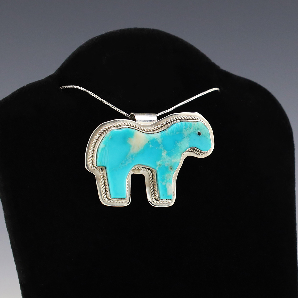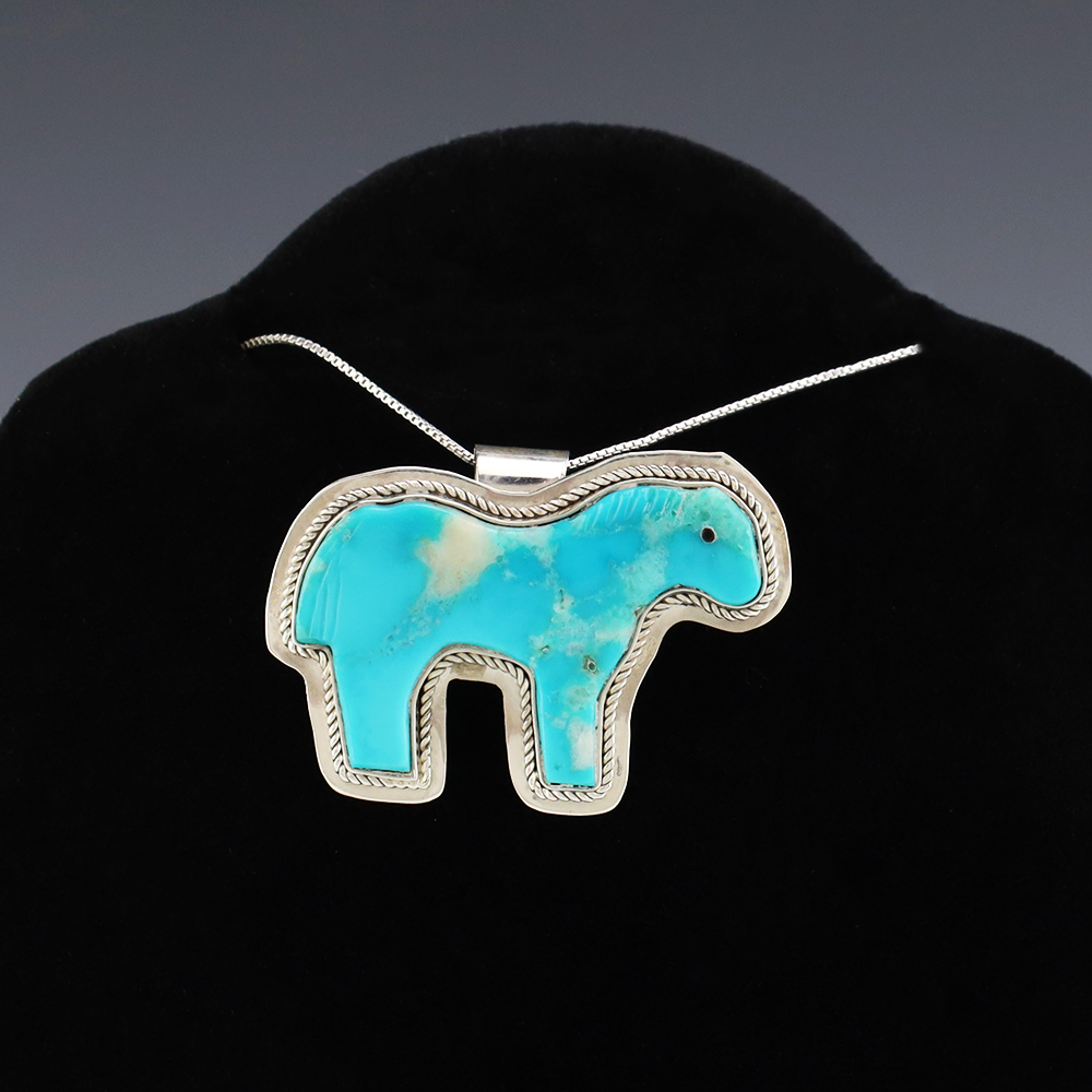 Stellar Horse pendant hand made out of sterling silver and Turquoise by Navajo artist Marvin Pinto. A timeless beauty that you will enjoy for years to come. Weighs 12 grams. Signed (Chain not included)