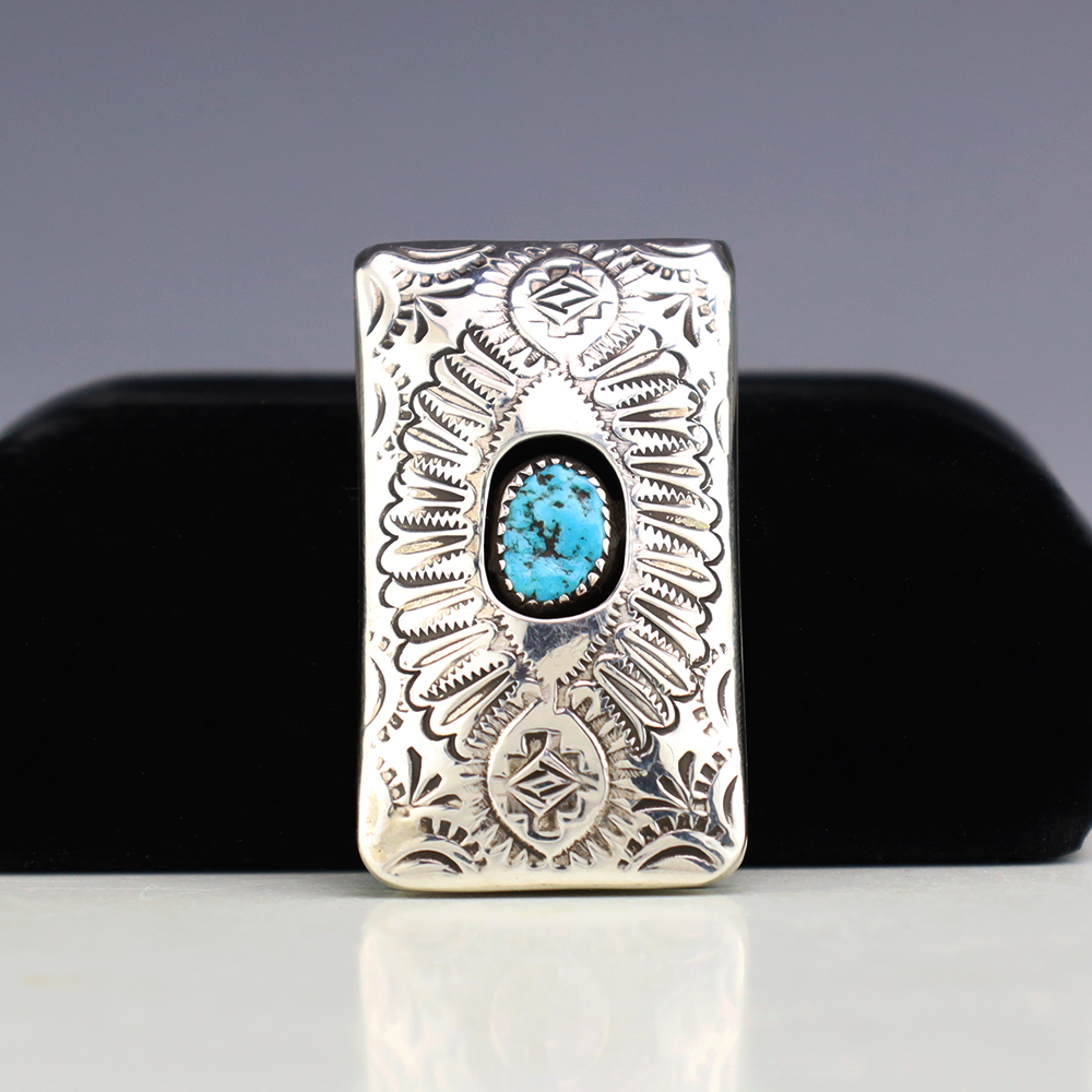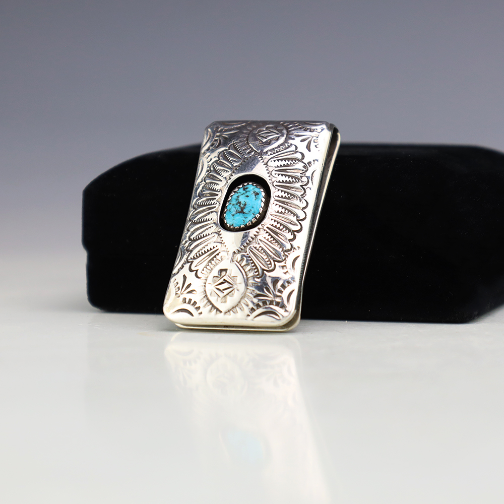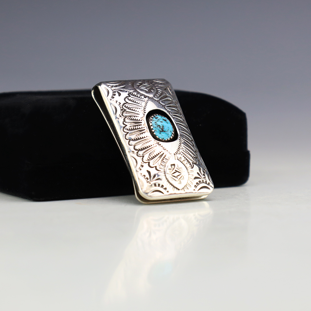 Take this money clip home for a wonderfully hand crafted accessory that show cases the craftsmanship of Navajo silversmithing. Hand made by Shirley Skeets. Backed with a nickle clip for stronger grip and durability. Weighs 24 grams.