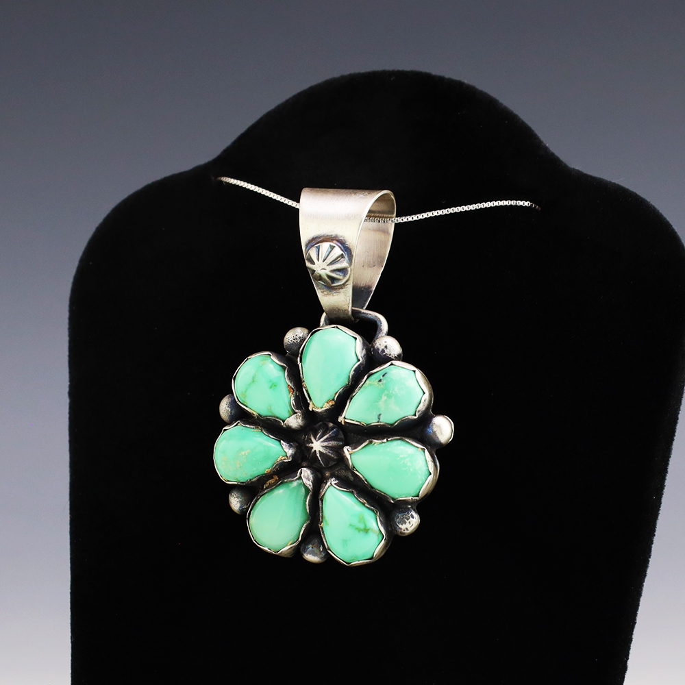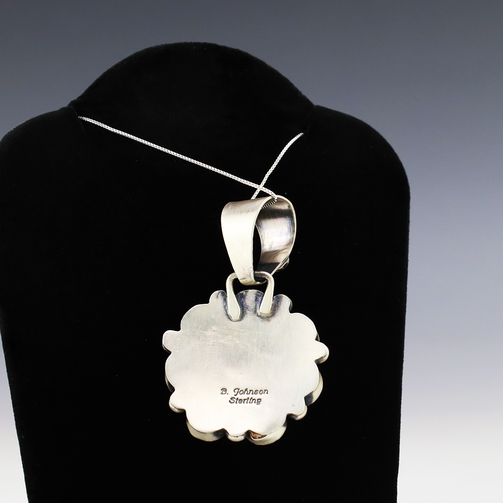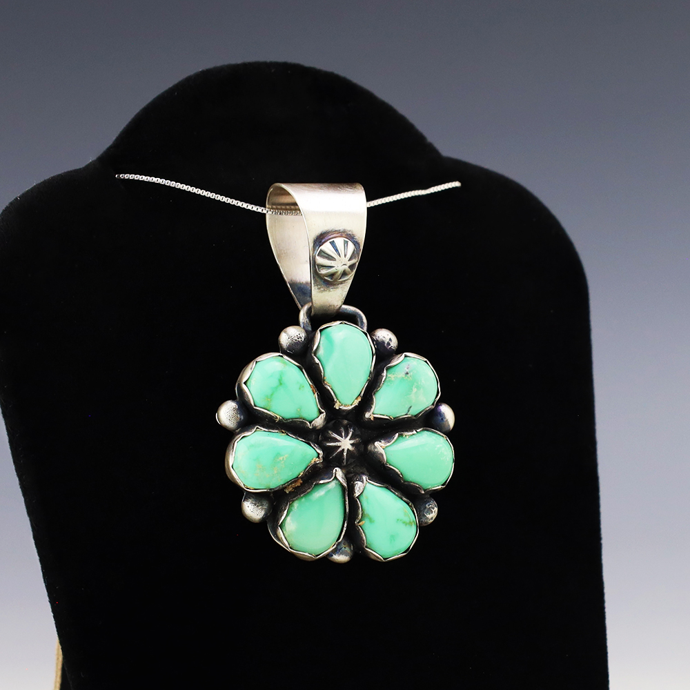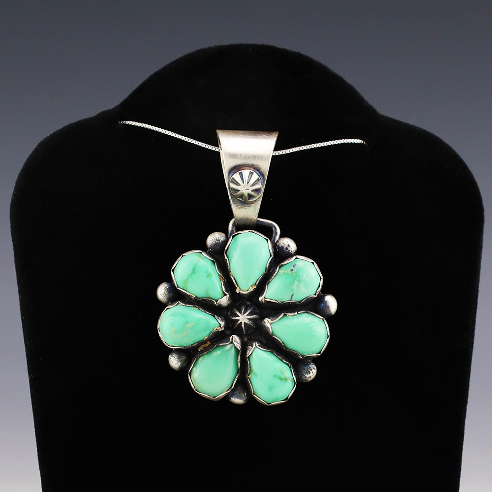 Lovely cluster pendant hand made out of sterling silver and Turquoise by Navajo artist Bobby Johnson. A timeless beauty that you will enjoy for years to come. Weighs 22 grams. Signed (Chain not included)