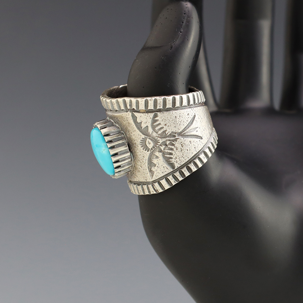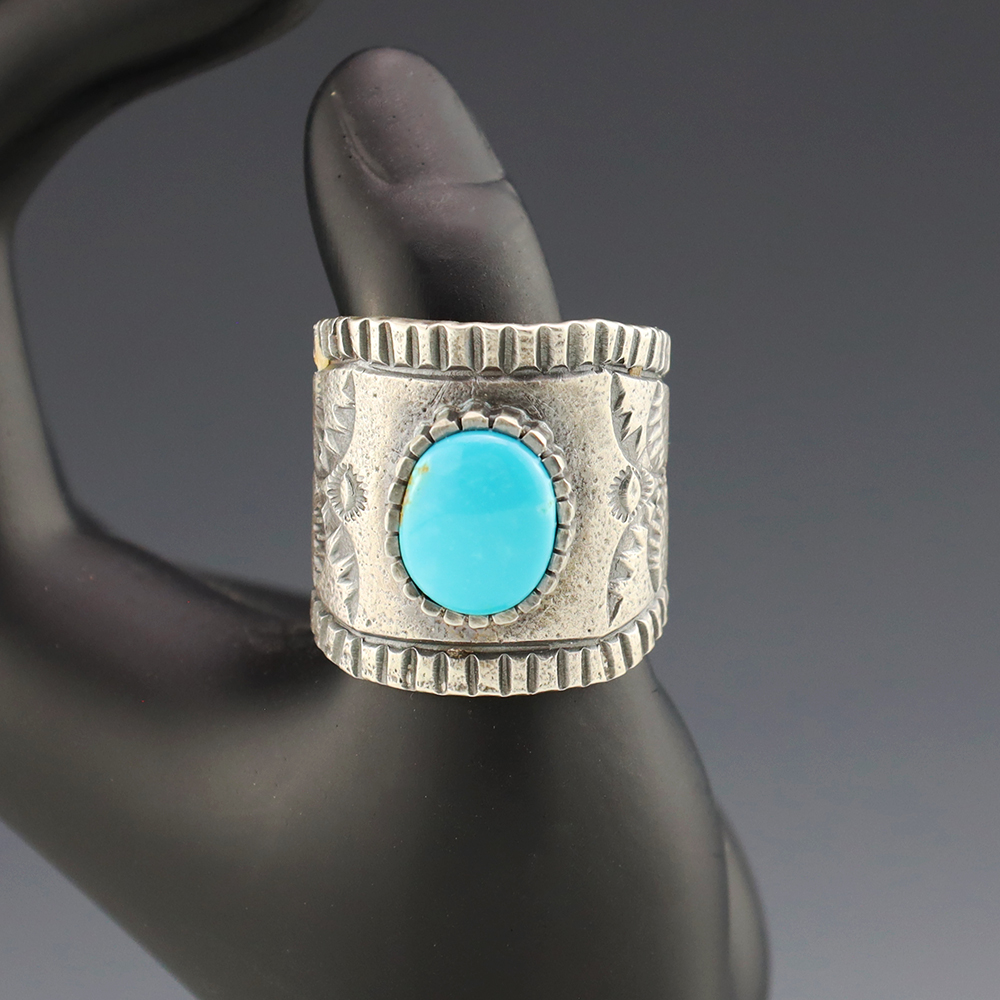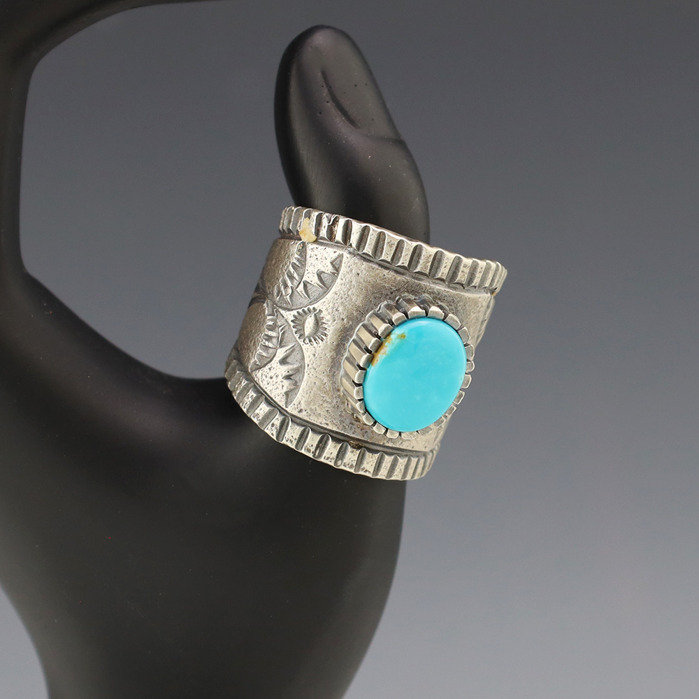 This ring is a great representation of hand made Navajo jewelry and will make a statement on your hand. A beautiful piece of Turquoise is set into a sterling silver setting. Weighs 28 grams. Size 13. Signed