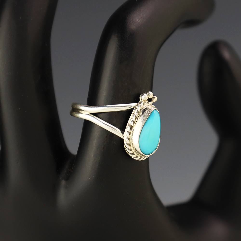 This ring is a great representation of hand made Navajo jewelry and will make a statement on your hand. A beautiful piece of Turquoise is set into a sterling silver setting. Weighs 4 grams. Size 8.