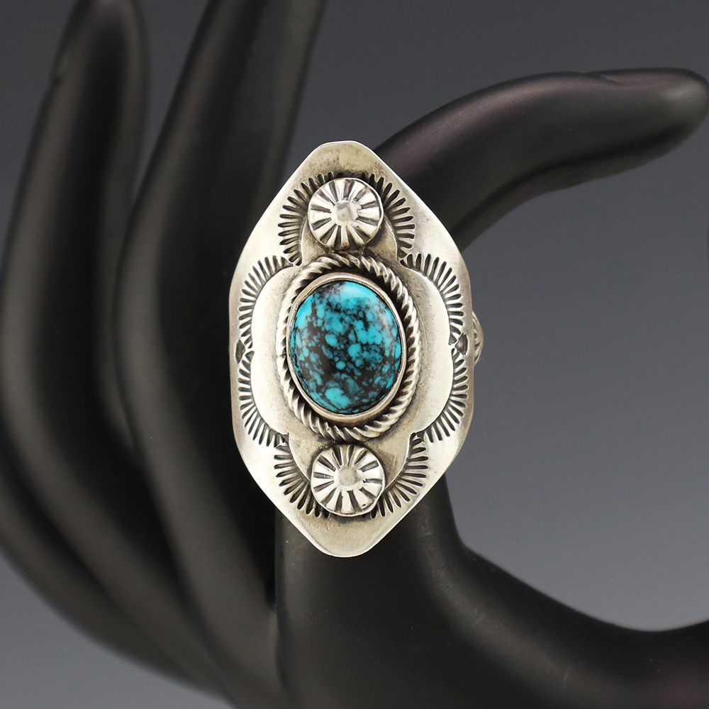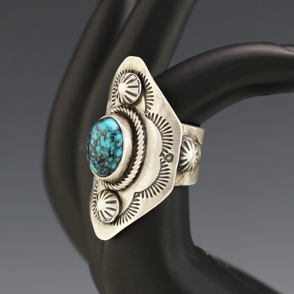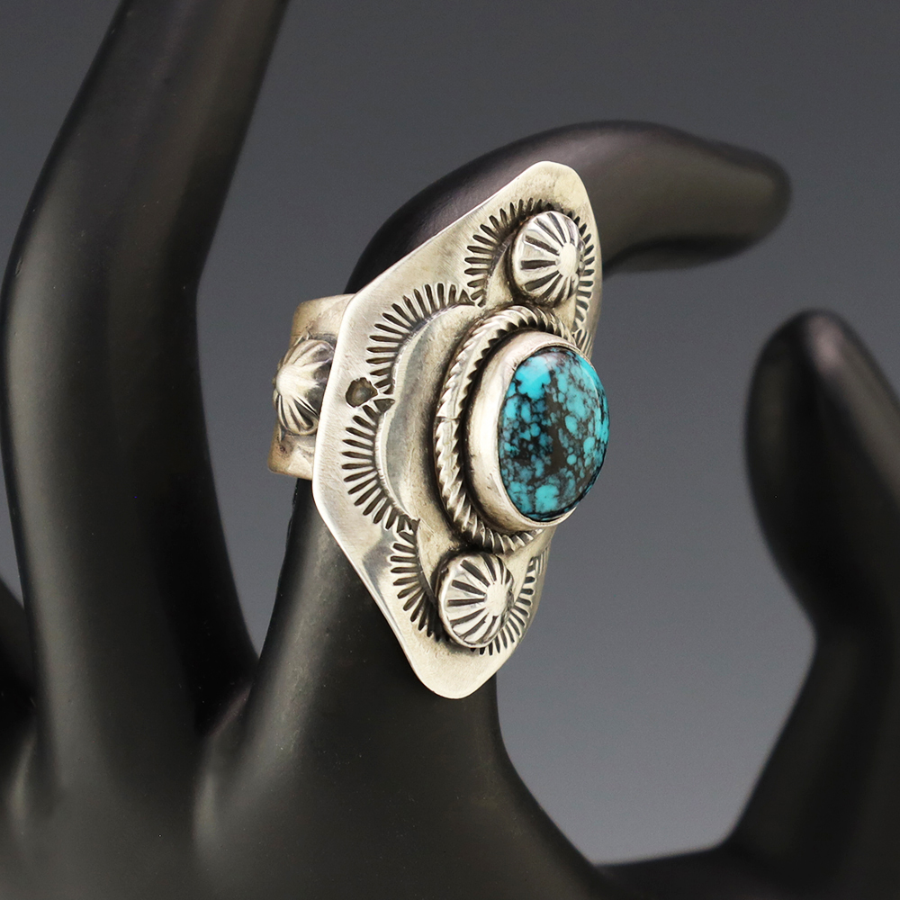 This ring is a great representation of hand made Navajo jewelry and will make a statement on your hand. A beautiful piece of Turquoise is set into a sterling silver setting. Hand made by Navajo silversmith Bobby Johnson. Weighs 16 grams. Size 6. Signed
