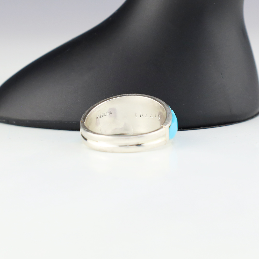 This ring is a great representation of hand made Navajo jewelry and will make a statement on your hand. Beautiful pieces of Turquoise is set into a sterling silver setting. Hand made by Navajo artist Edison Yazzie. Weighs 6 grams. Size 10 3/4. Signed