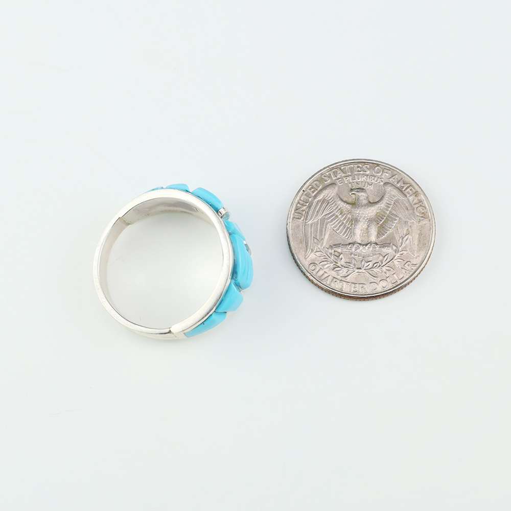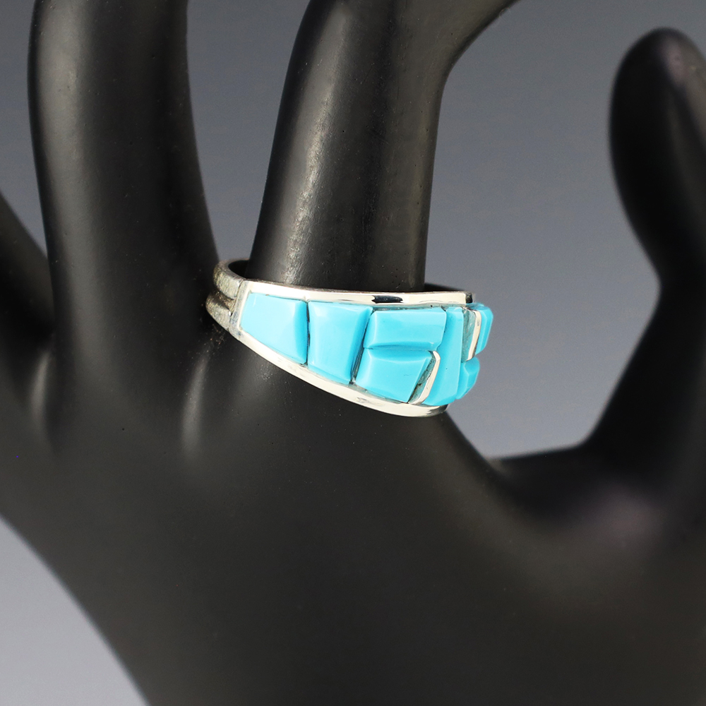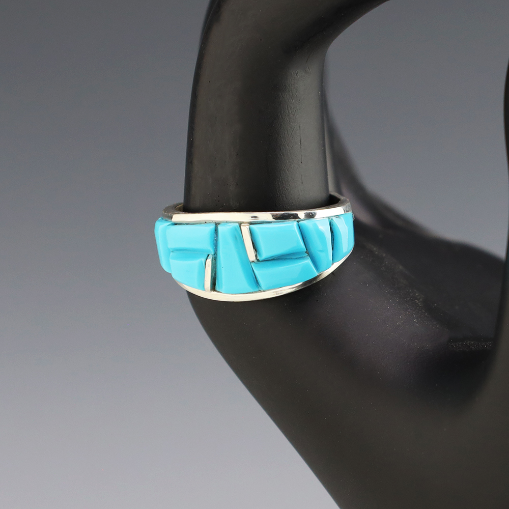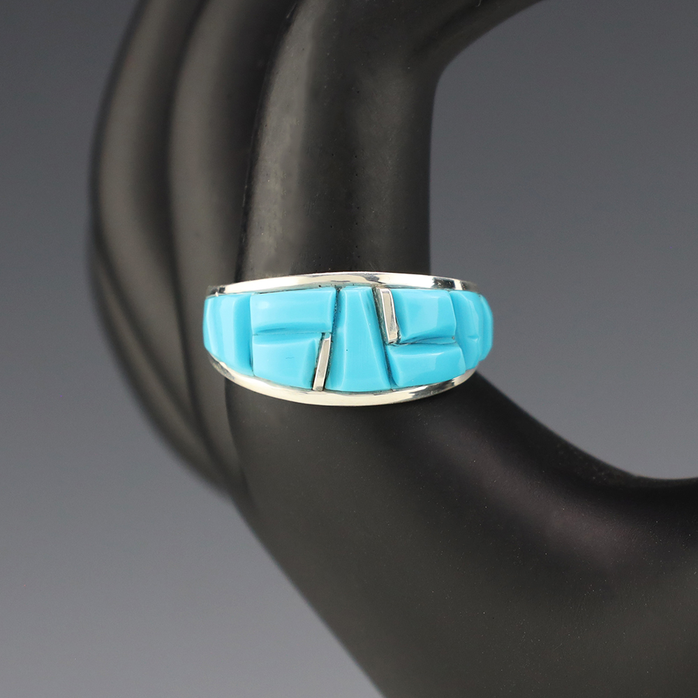 Zuni jewelry makers, Nancy and Sheldon Westika hand crafted this magnificent ring. Made out of sterling silver and inlaid with Kingman Turquoise and Jet. Zuni artists are known for their lapidary work. The Westikas have been making jewelry since the 1970’s and they are known for their fine inlay work. ...