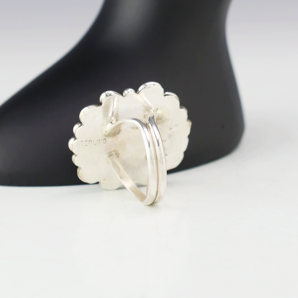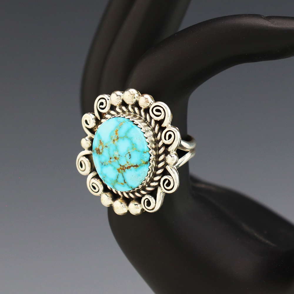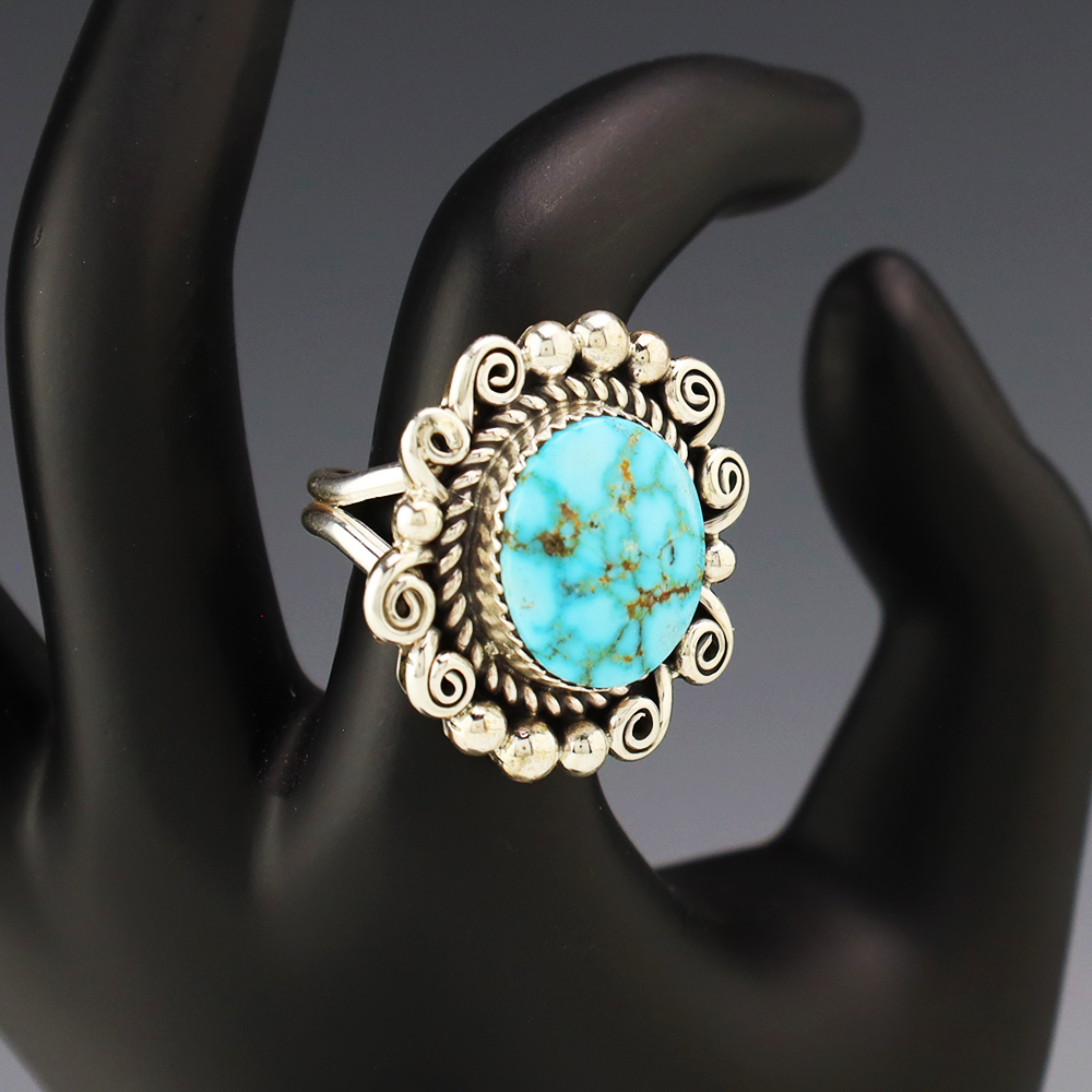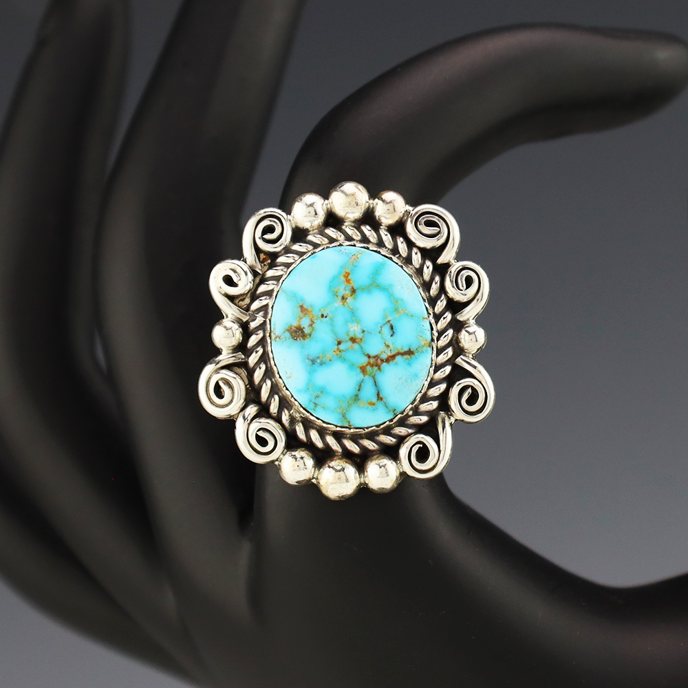 This wonderful ring was hand made by Navajo artist Julia Etsitty Sterling silver with a Turquoise stone. It is a great representation of hand made Navajo jewelry. Size 7 1/2. Weighs 12 grams. Signed
