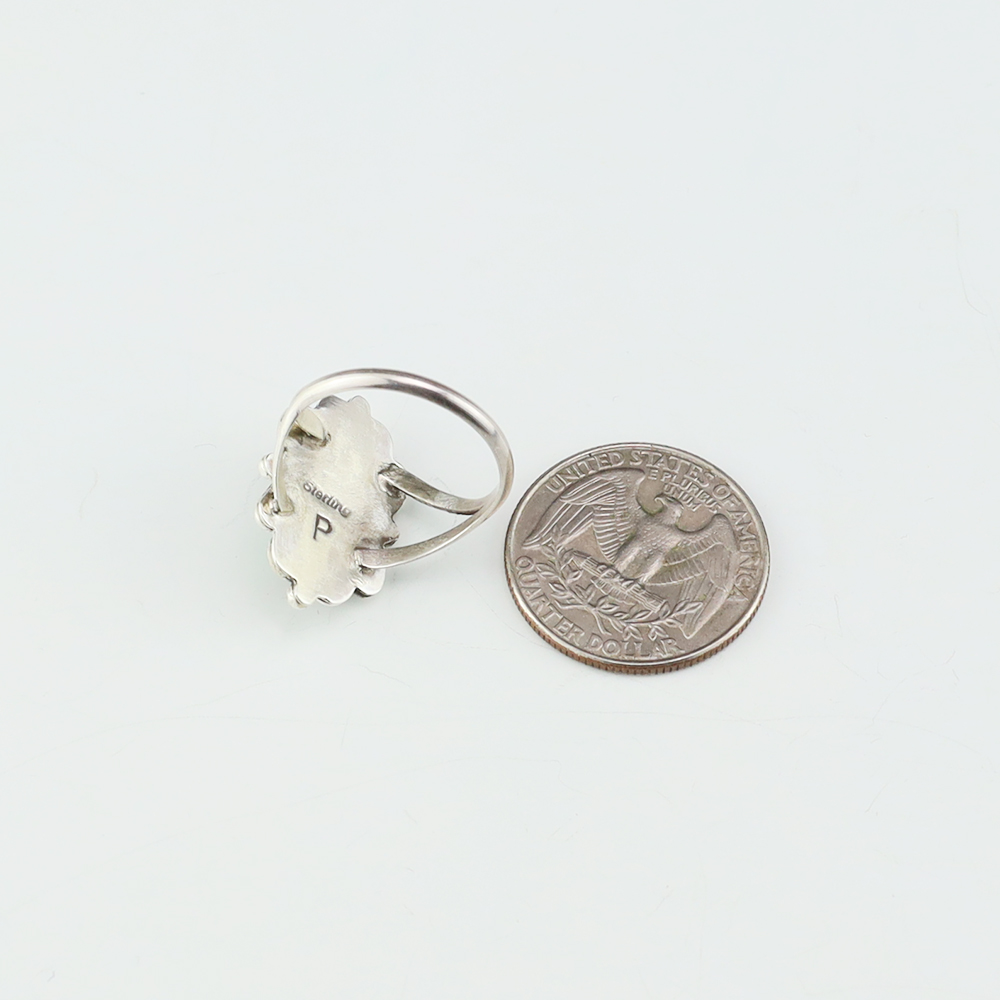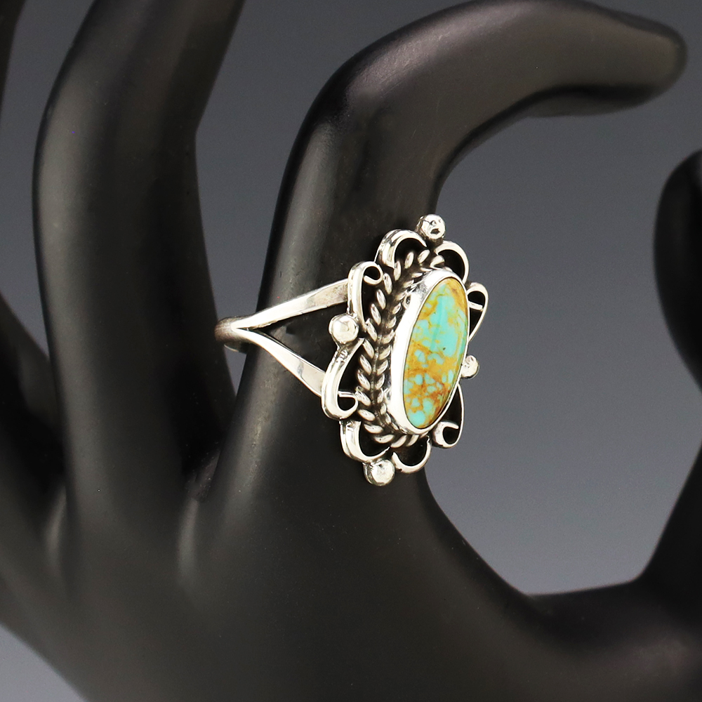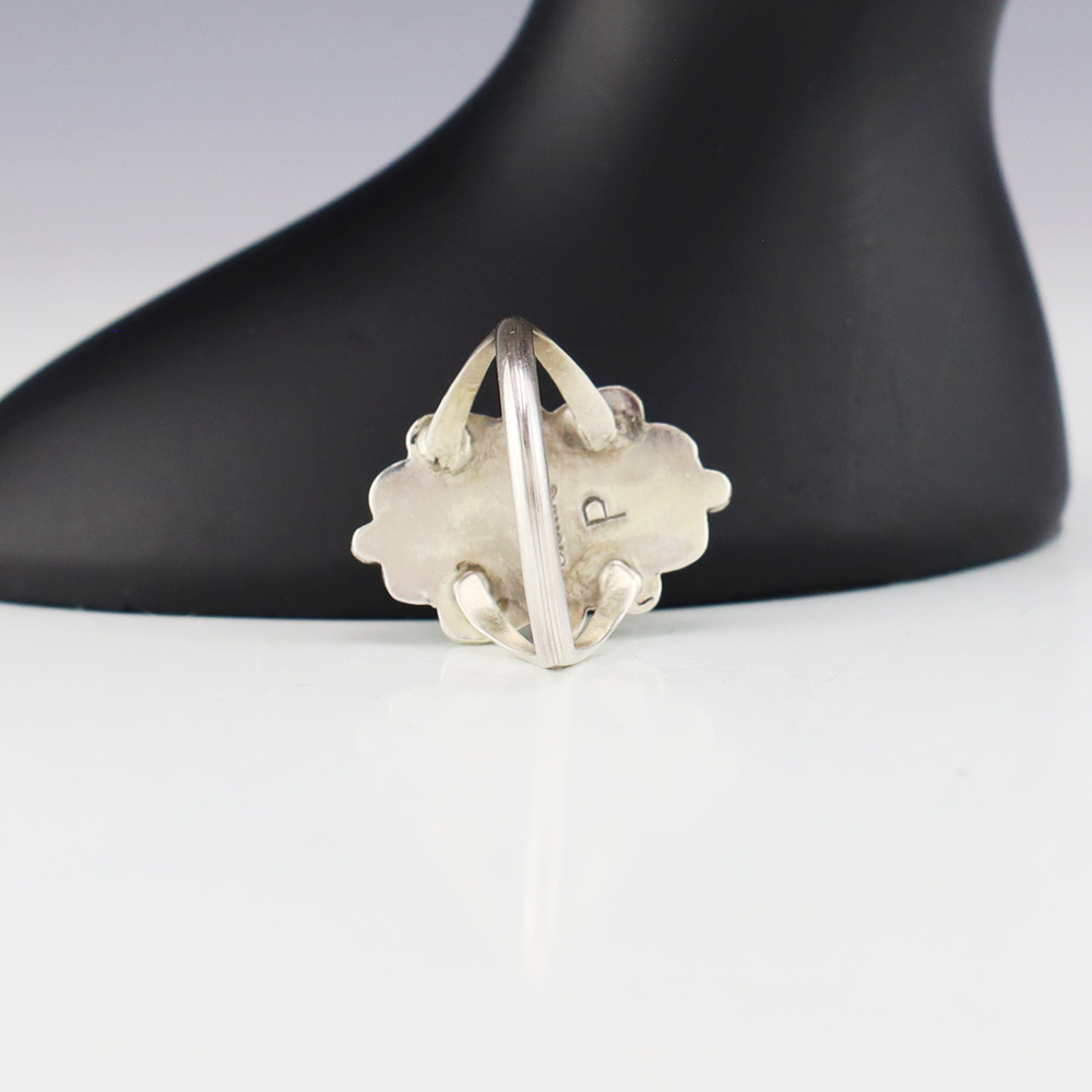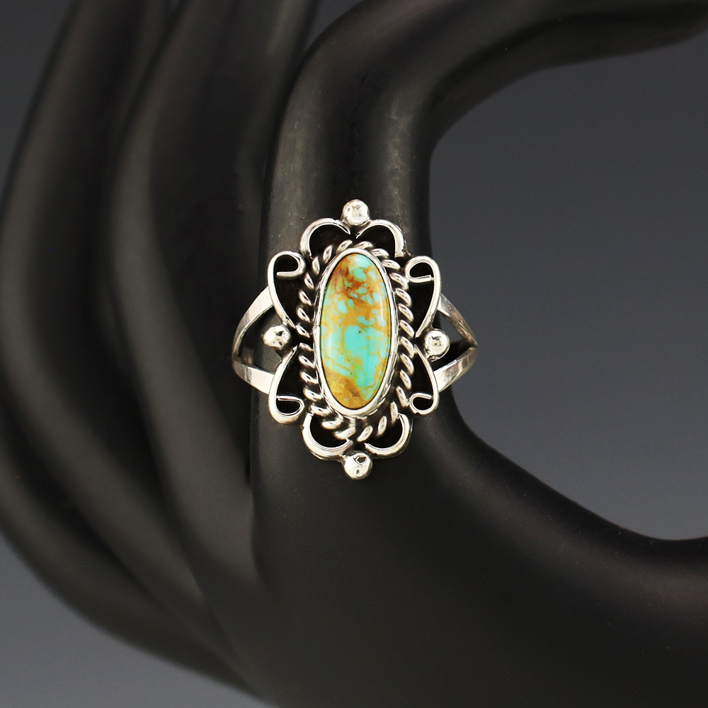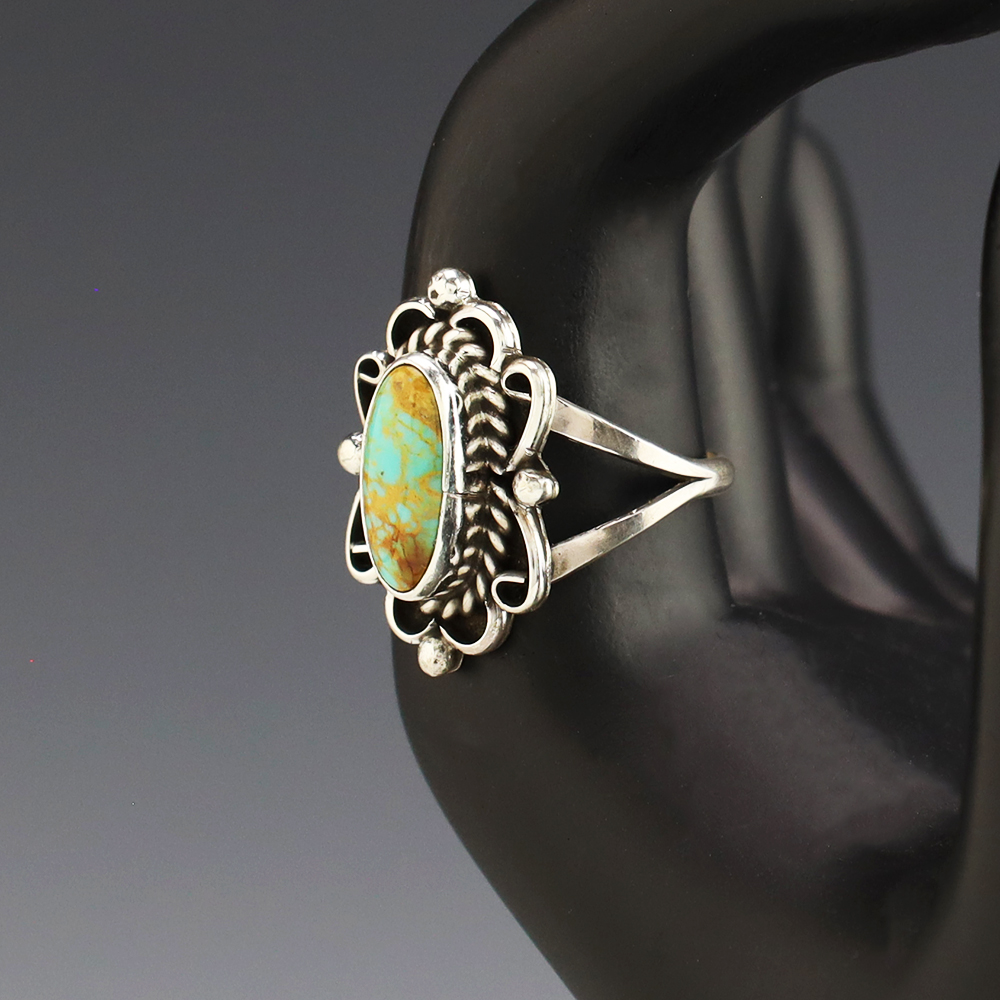 This ring is a great representation of hand made Navajo jewelry and will make a statement on your hand. Turquoise is set into a sterling silver setting. Made by Navajo artist Priscilla Smith. Weighs 6 grams. Size 8 3/4.