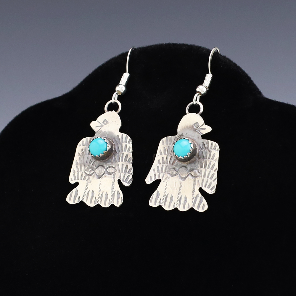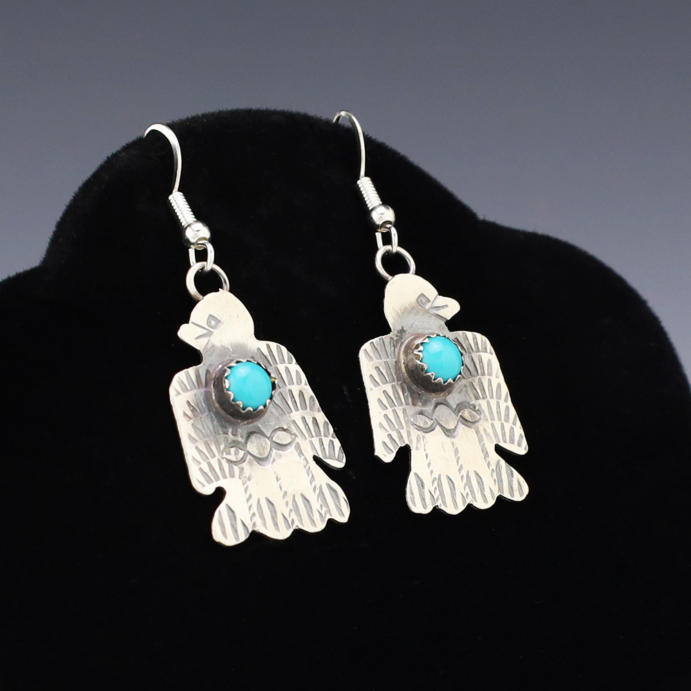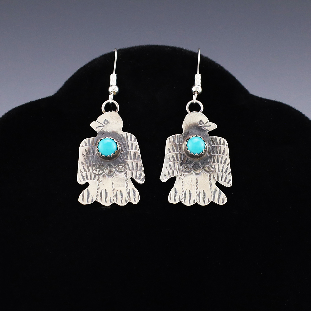 Stellar Thunderbird earrings hand made out of sterling silver and Turquoise by Navajo artist Tim Yazzie. A timeless beauty that you will enjoy for years to come. Weighs 4 grams. Signed (Chain not included)