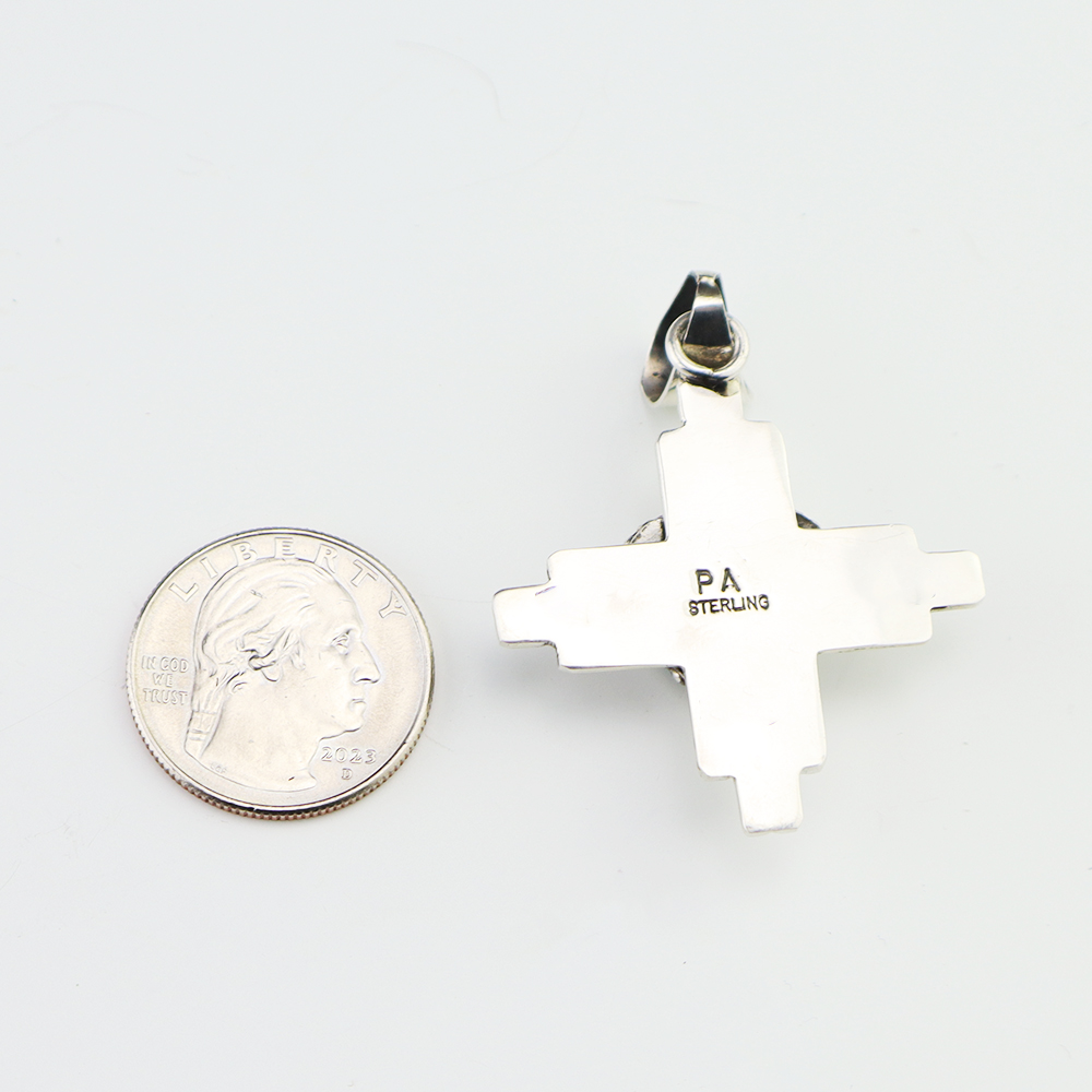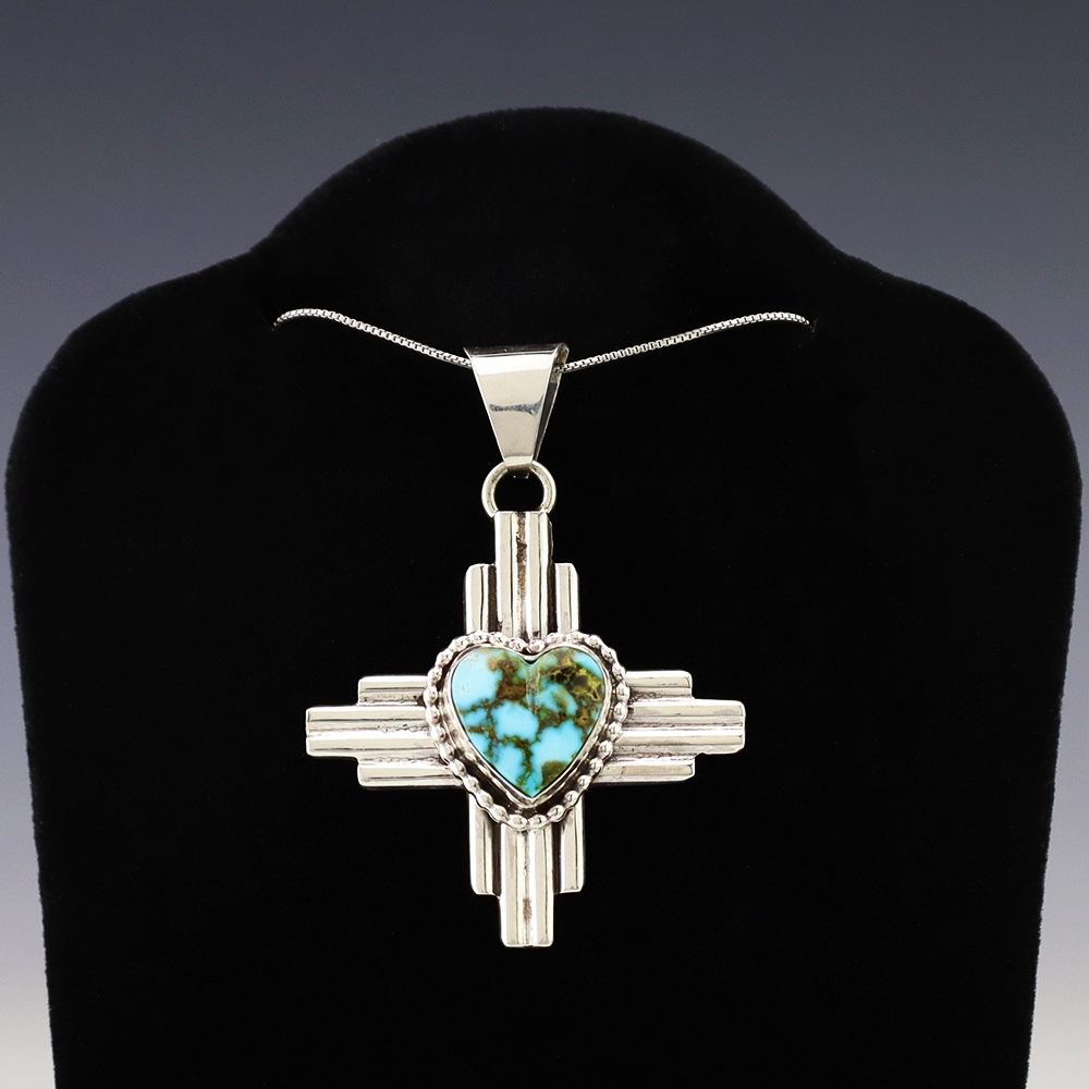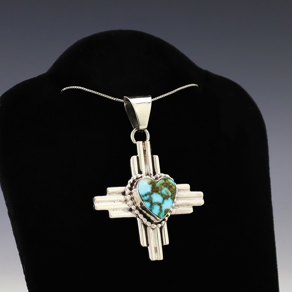 Navajo artist Priscilla Apache handcrafted this marvelous Zia symbol pendant out of sterling silver and Turquoise. For the Zia, the Zia sun symbol represents the Circle of Life: four winds, four seasons, four directions, and four sacred obligations. A timeless beauty that you will enjoy for years to come. Weighs 14 grams. Signed. (Chain not included)