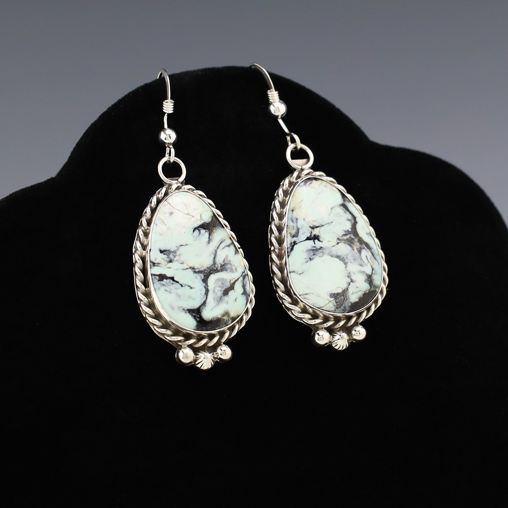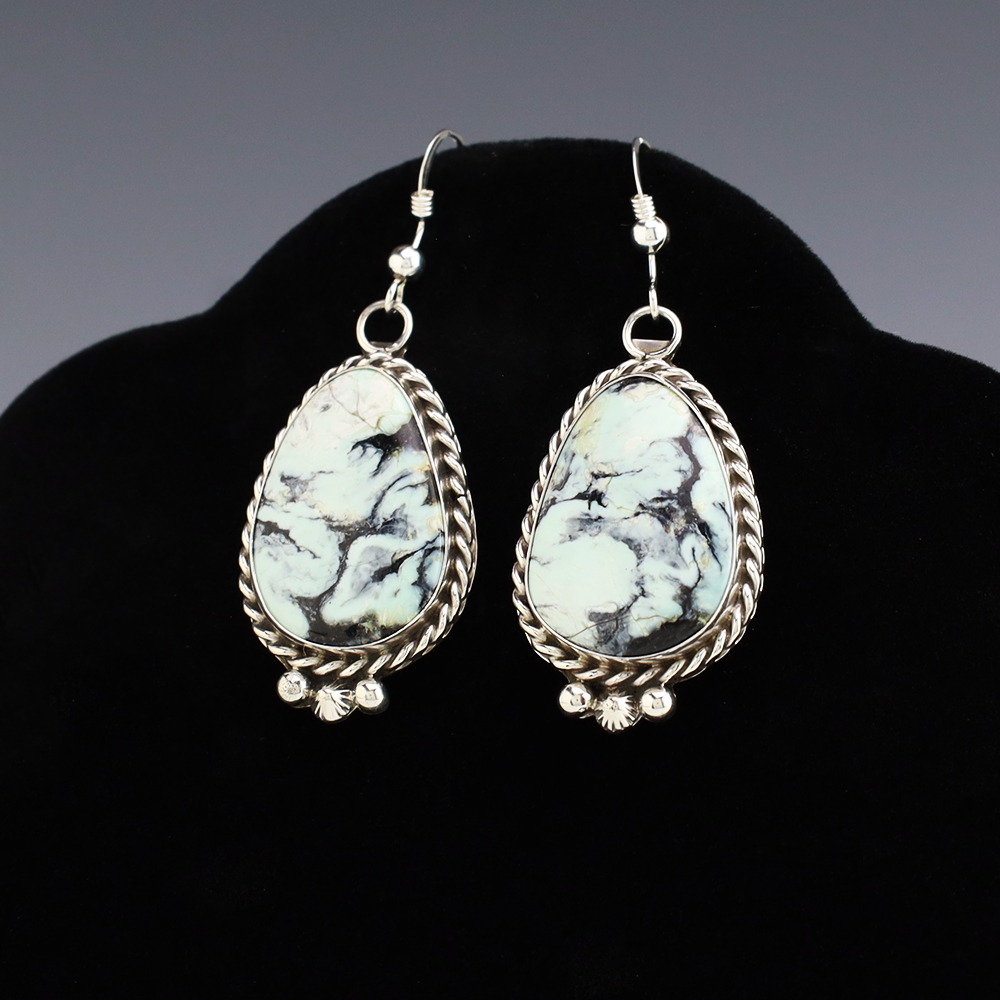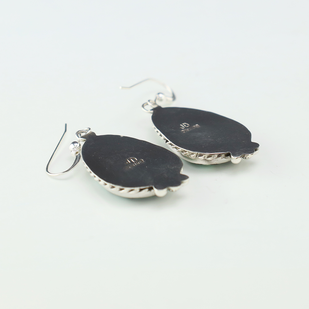 Beautiful earrings hand made out of sterling silver and New Lander Variscite by Navajo artist Jones Delgarito. These fabulous earrings will become a versatile accessory in your jewelry collection. Weighs 8 grams. Signed