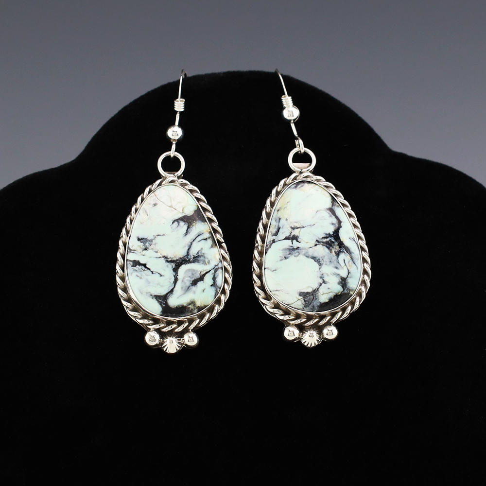Beautiful earrings hand made out of sterling silver and New Lander Variscite by Navajo artist Jones Delgarito. These fabulous earrings will become a versatile accessory in your jewelry collection. Weighs 8 grams. Signed