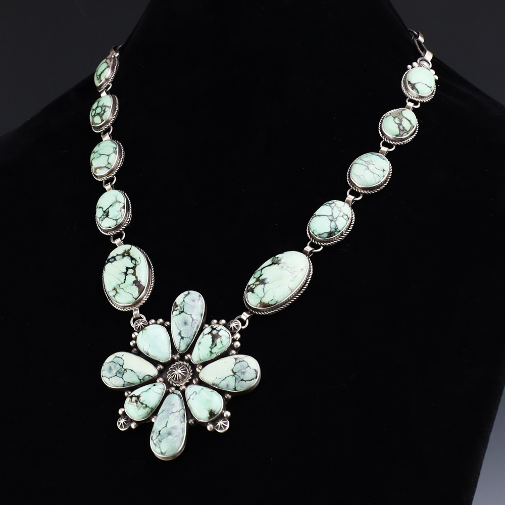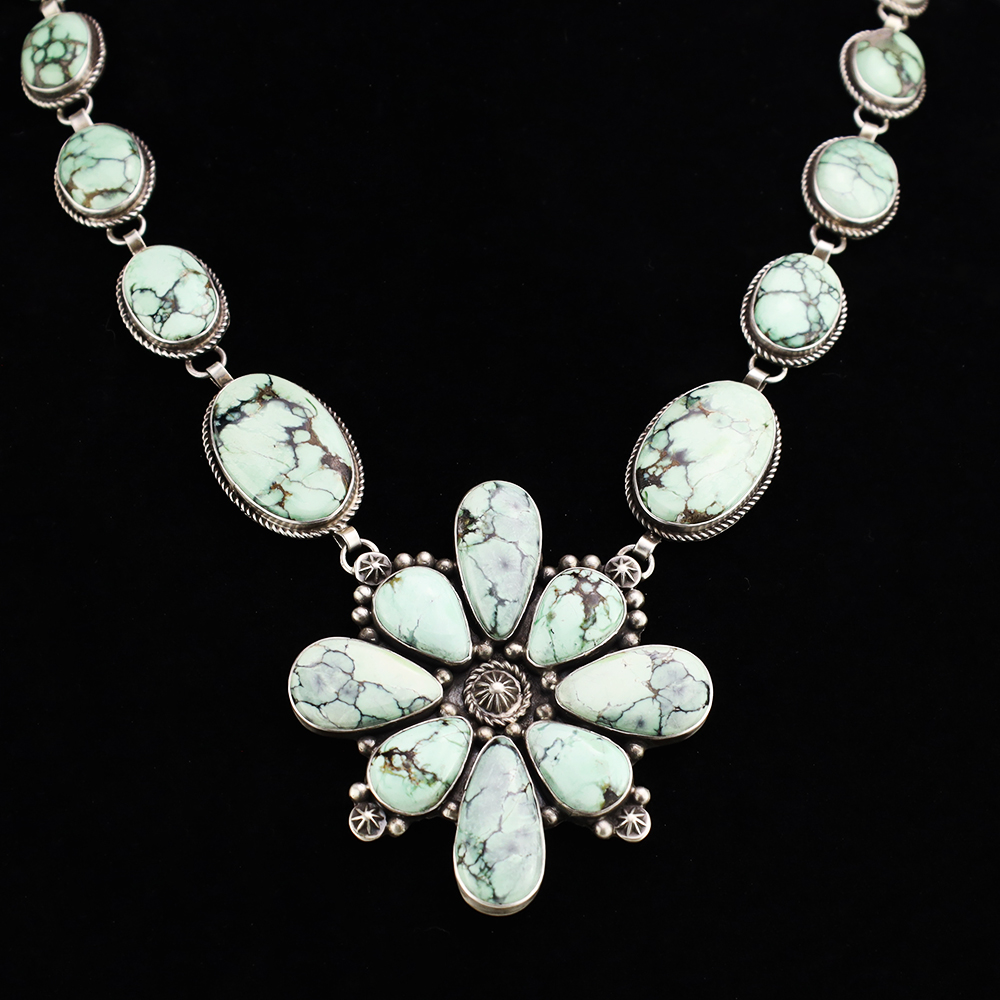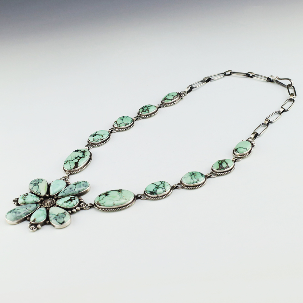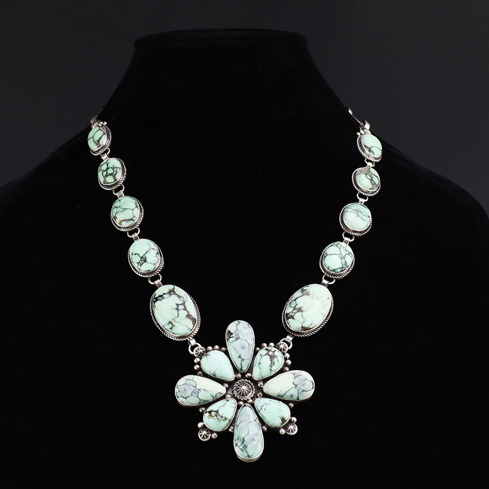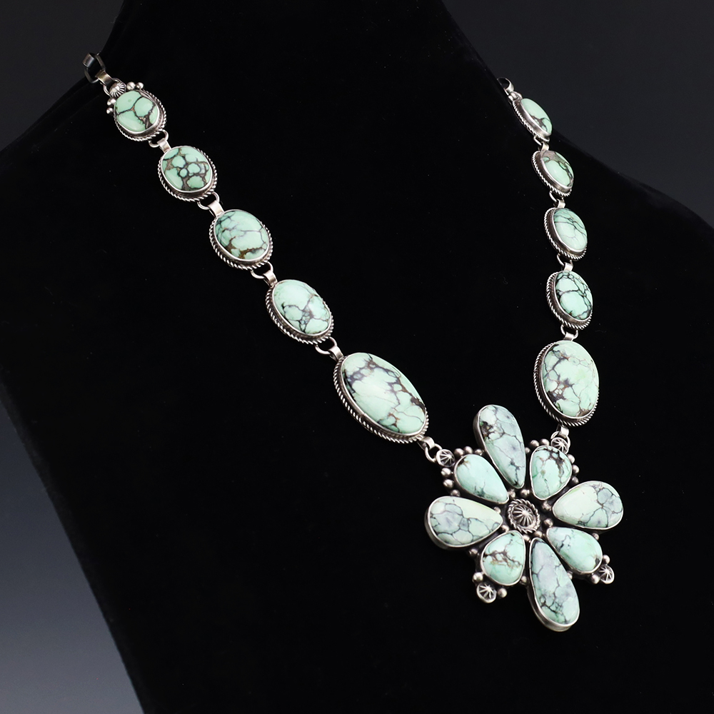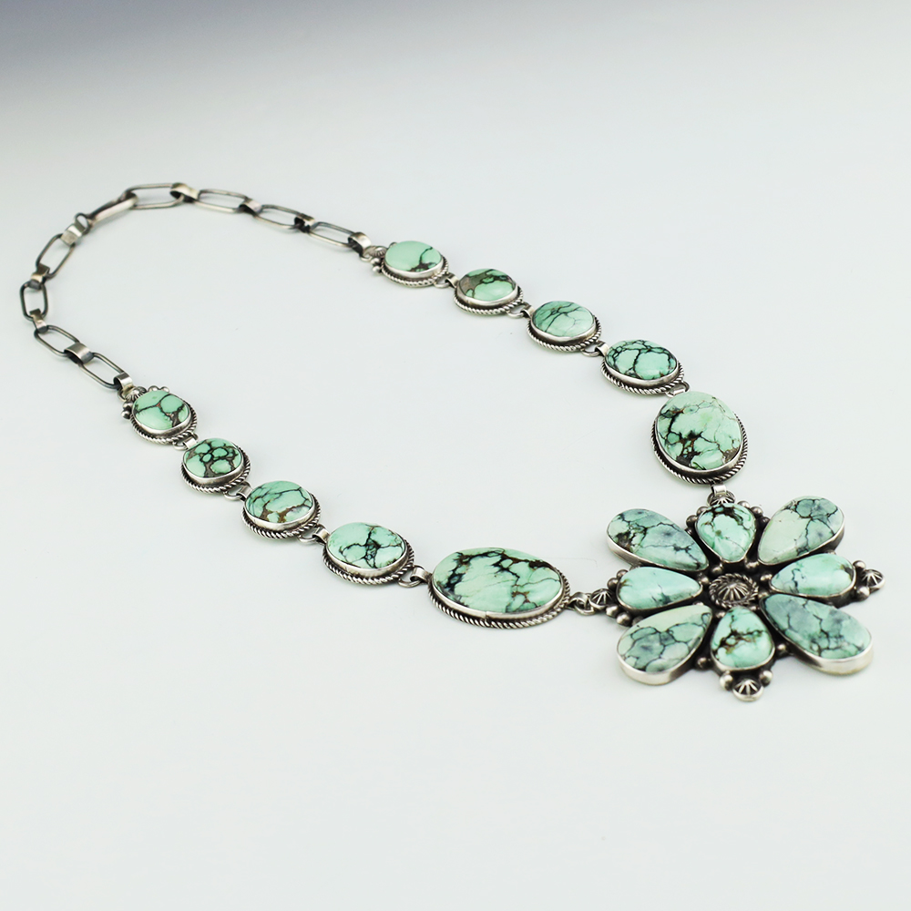 Navajo artist Randall Endito made this gorgeous necklace. Sterling silver with New Lander Variscite stones. This necklace will elevate your jewelry collection and is so versatile, it will look great with any outfit. Weighs 90 grams. Signed