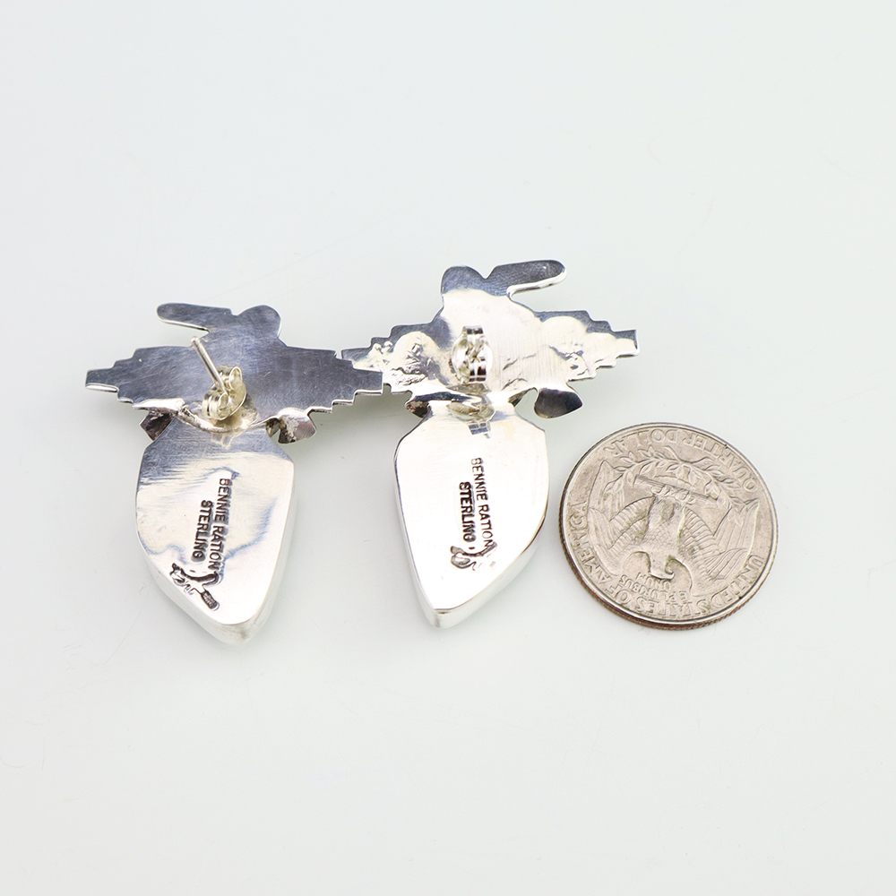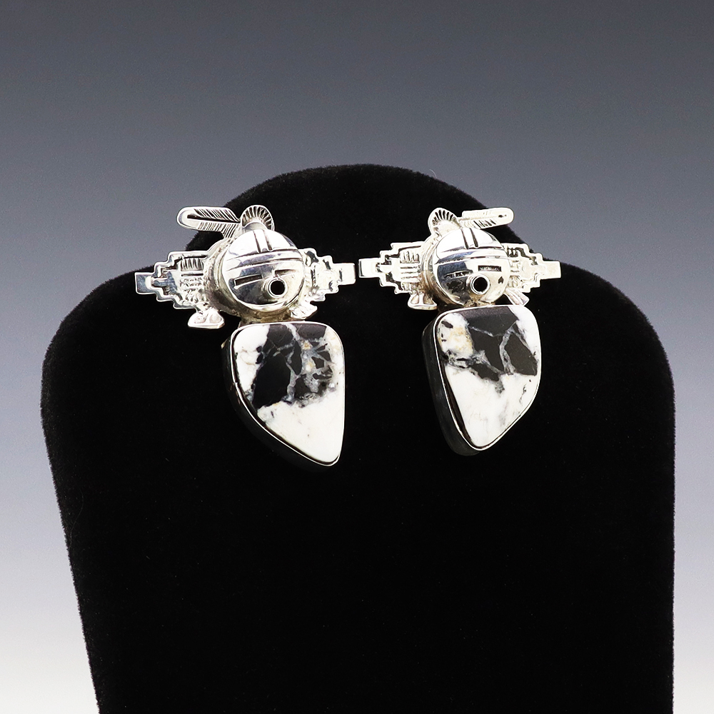 Outstanding sterling silver earrings with Mother of Pearl Shell and Turquoise inlay. Hand crafted by Zuni jewelry makers, Nancy and Sheldon Westika. The Westikas have been making jewelry since the 1970’s and they are known for their fine inlay work. Weighs 6 grams. Signed 7/8” wide x 7/8” tall 1 ...