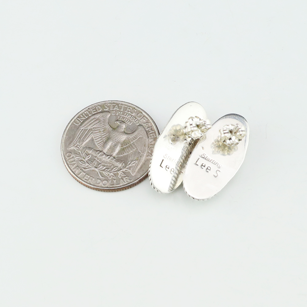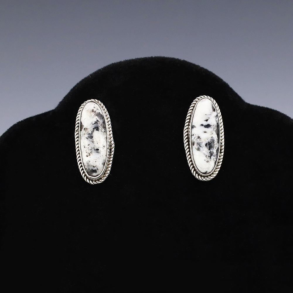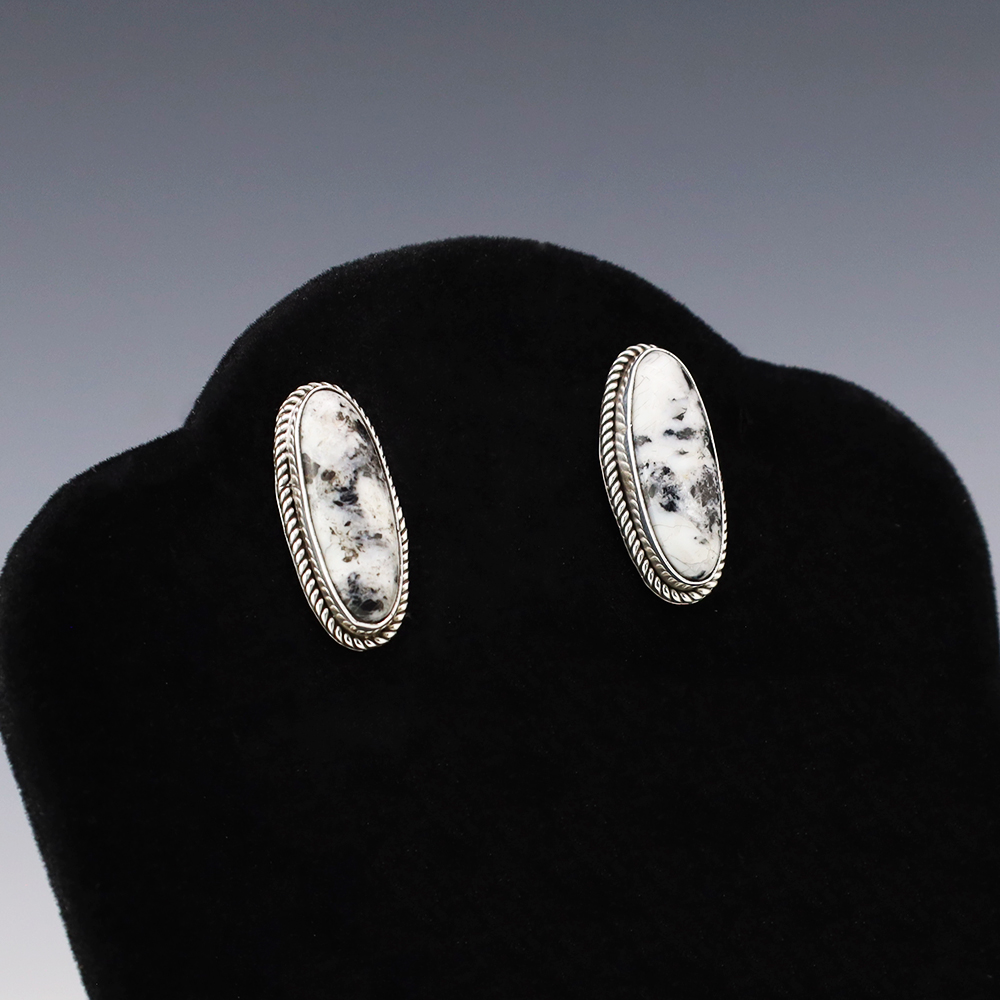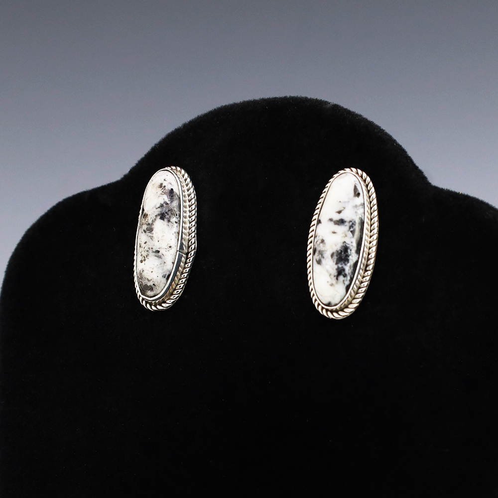 Lovely earrings hand made out of sterling silver and White Buffalo. Hand made by Navajo silversmith Lee Sandoval These fabulous earrings will become a versatile accessory in your jewelry collection. Weighs 4 grams. Signed.
