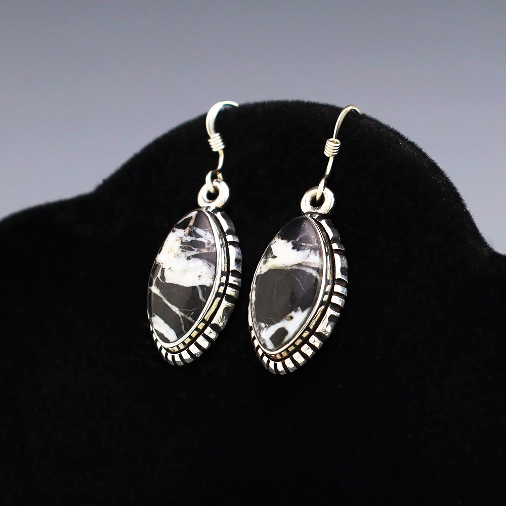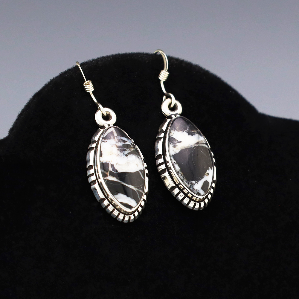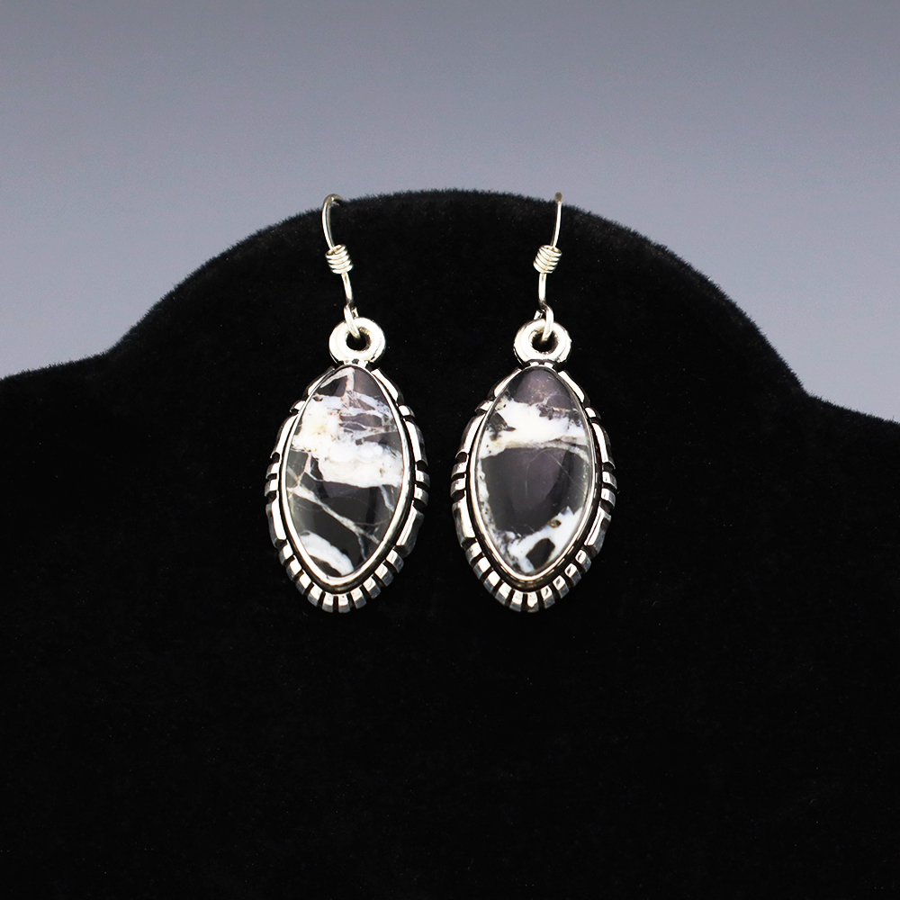Lovely earrings hand made out of sterling silver and White Buffalo. These wonderful earrings will become a versatile accessory in your jewelry collection. Weighs 6 grams. Signed