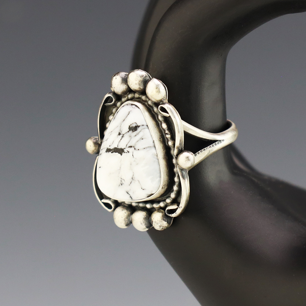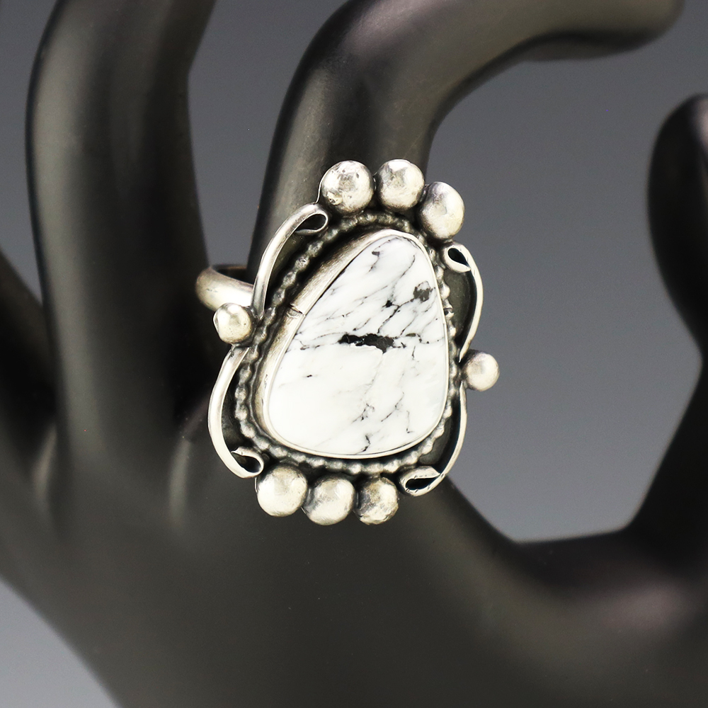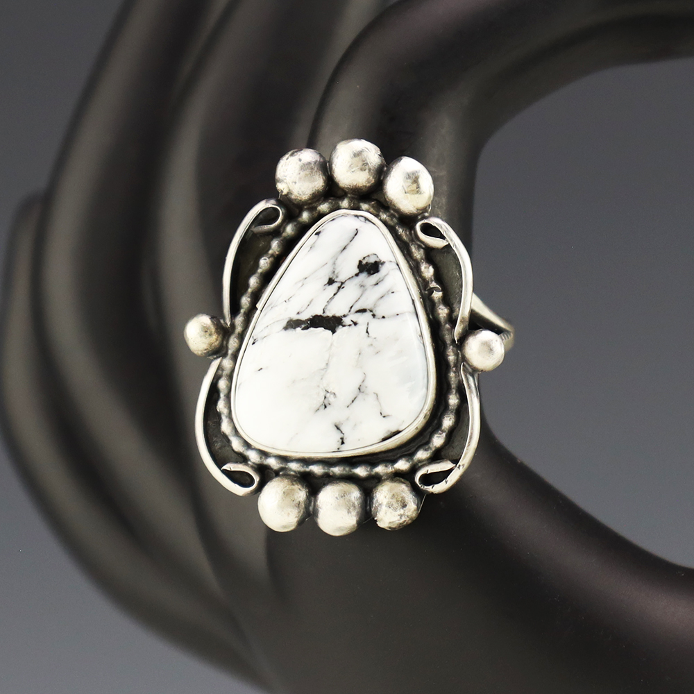 This ring is a great representation of hand made Navajo jewelry and will make a statement on your hand. A beautiful piece of White Buffalo is set into a sterling silver setting. Weighs 14 grams. Size 9 and slightly adjustable. Signed.