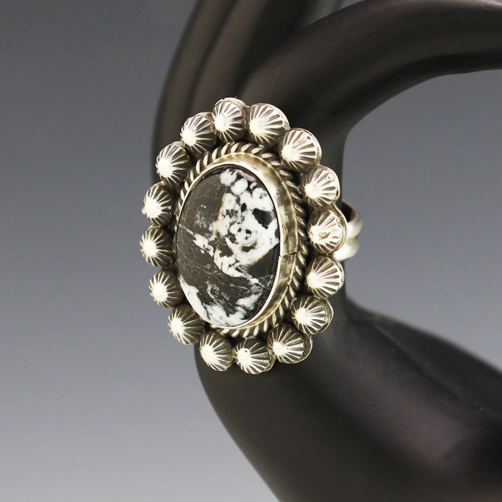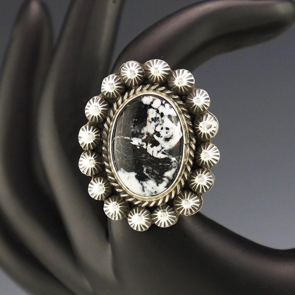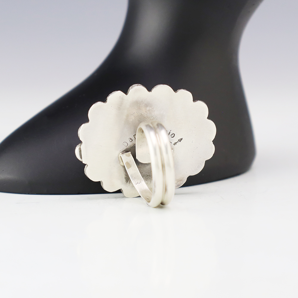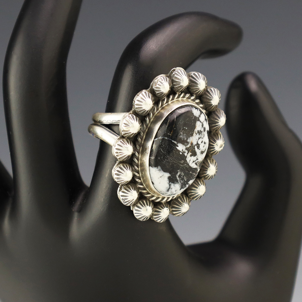 This ring is a great representation of hand made Navajo jewelry and will make a statement on your hand. A beautiful piece of White Buffalo is set into a sterling silver setting. Handmade by Navajo artist Danny Henio. Weighs 18 grams. Size 9 and slightly adjustable. Signed.