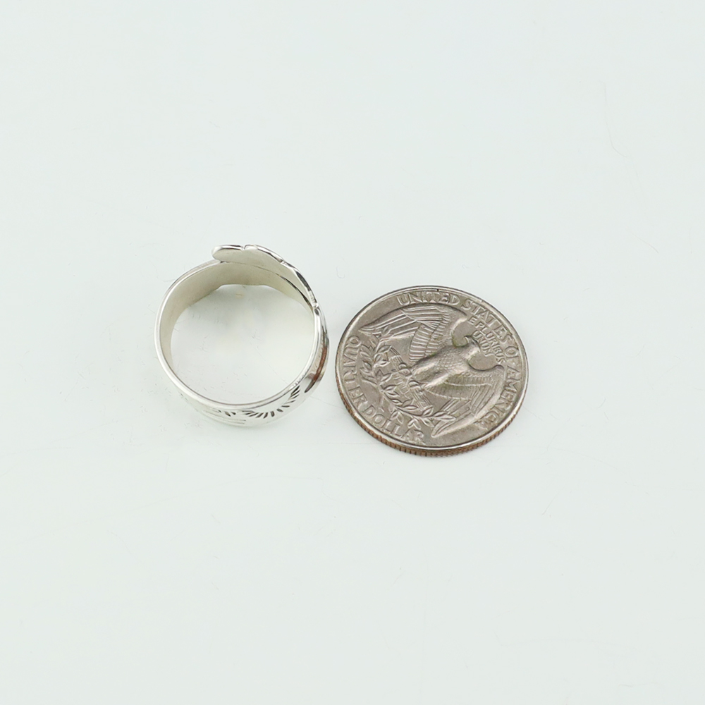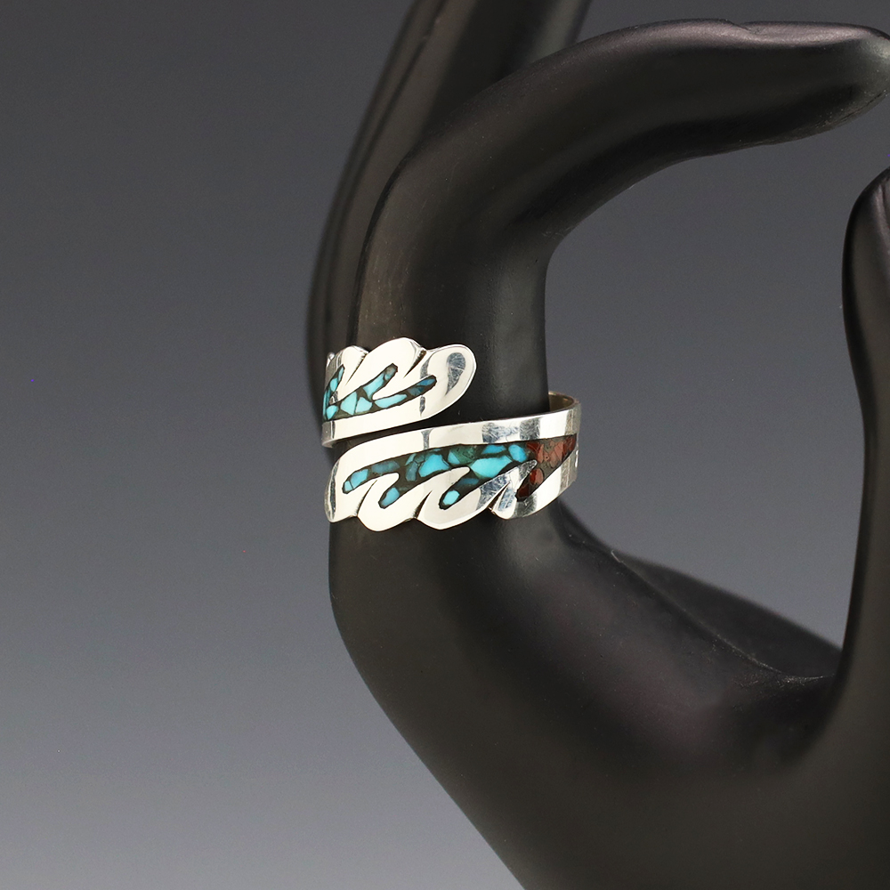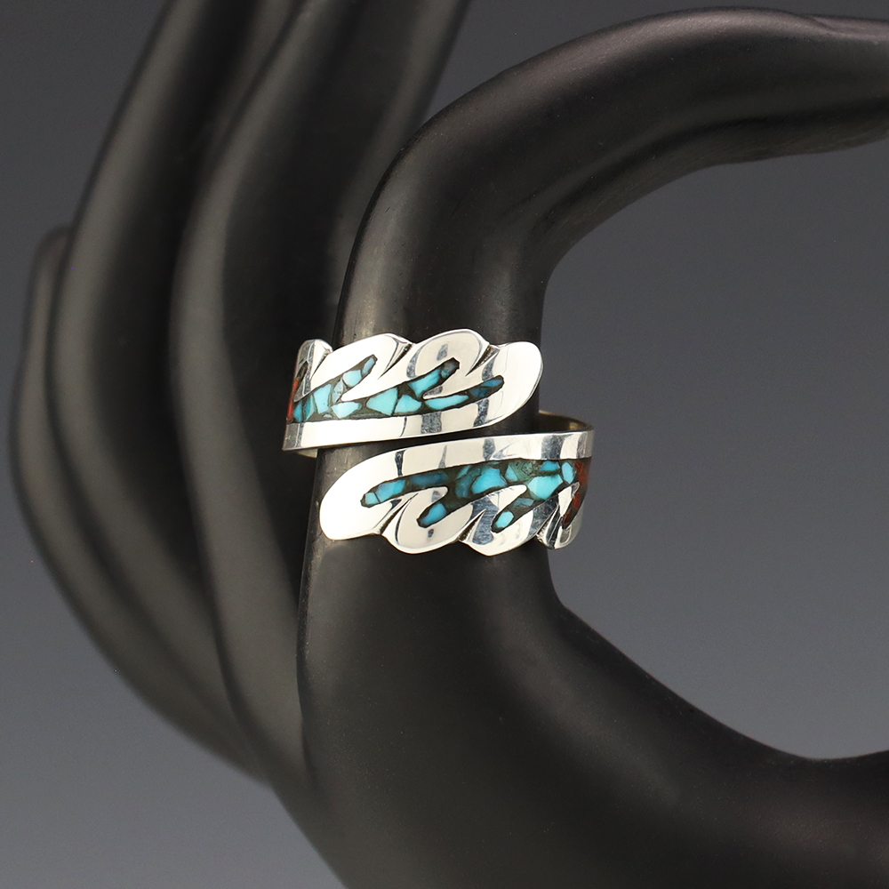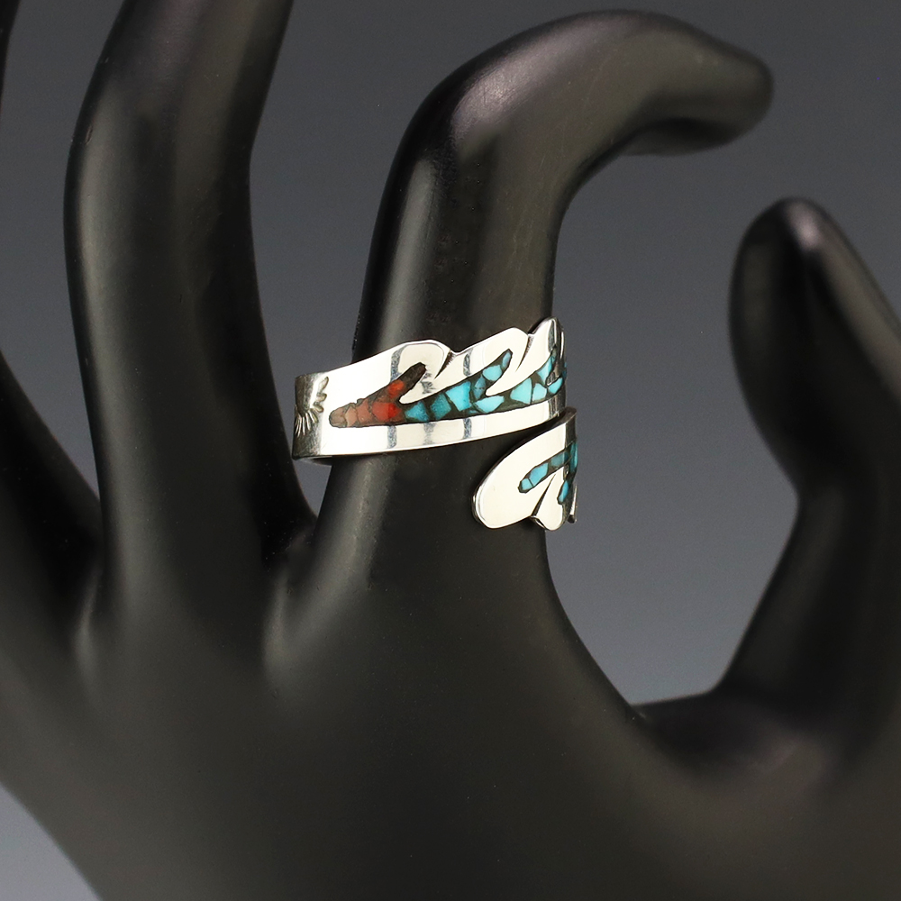 This beautiful ring was hand made by Navajo artist Jolene Yazzie. Sterling silver with Turquoise and Coral chip inlay. It is a great representation of hand made Navajo jewelry. Size 8 1/2 and is slightly adjustable. Weighs 4 grams. Signed