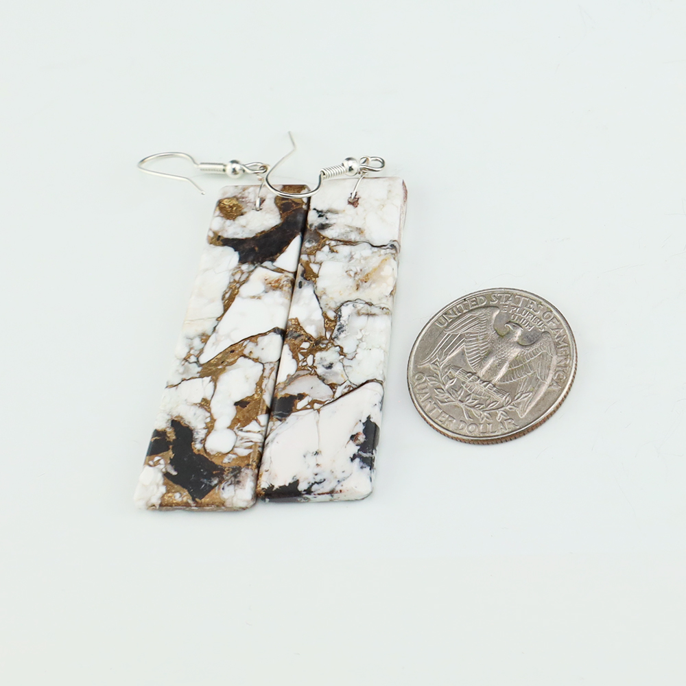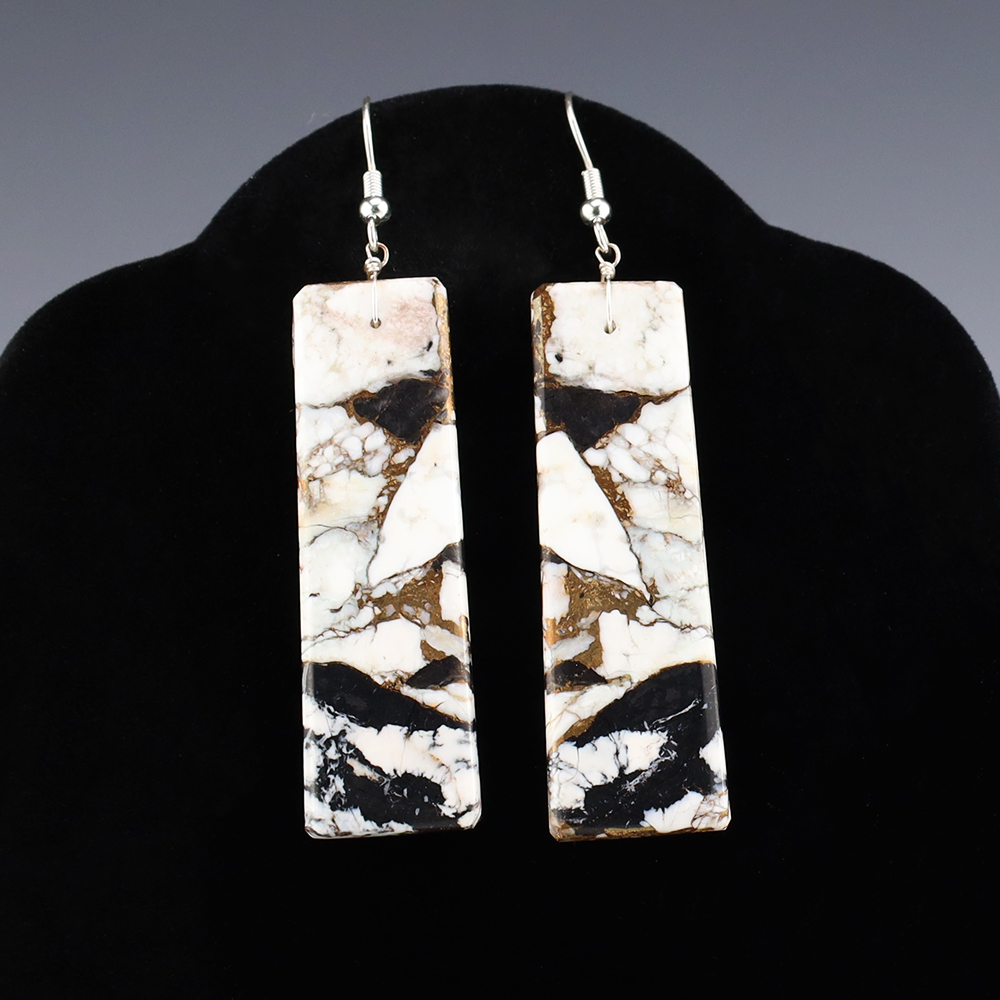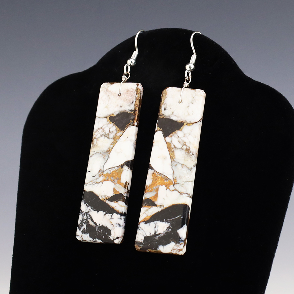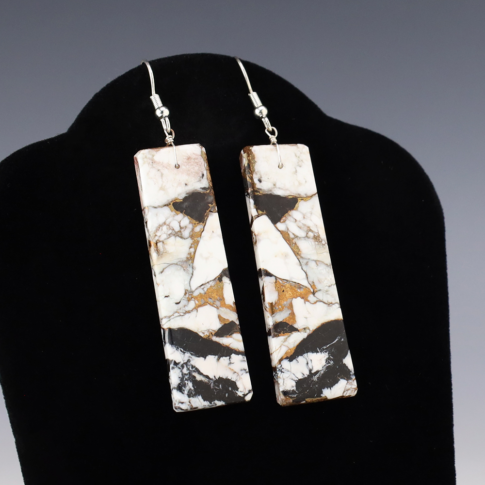 Lovely earrings hand made out of composite White Buffalo and bronze by Navajo artist Jameson Pete. These wonderful earrings will become a versatile accessory in your jewelry collection. Weighs 12 grams.