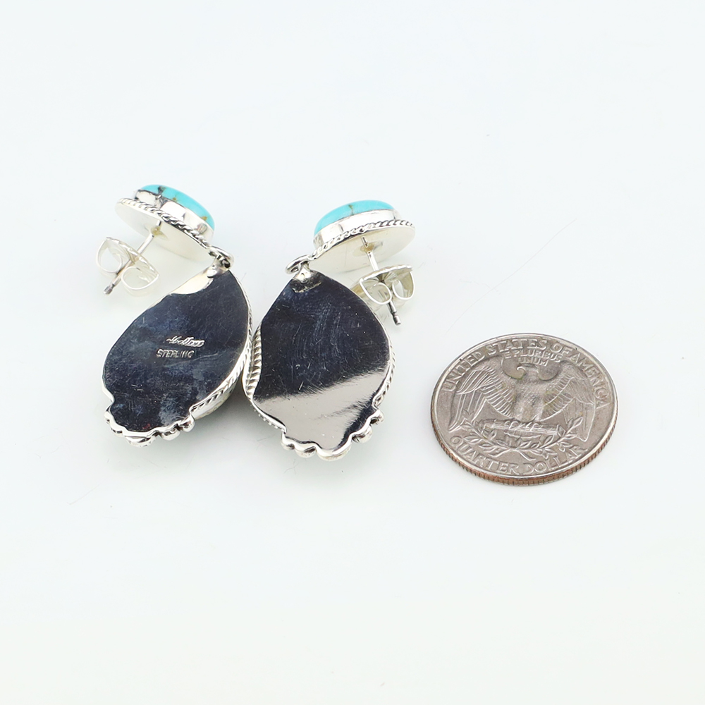 Gorgeous earrings hand made out of sterling silver and turquoise. Hand made by Navajo silversmiths Eva and Linberg Billah. These fabulous earrings will become a versatile accessory in your jewelry collection. Weighs 14 grams. Signed. 1 1/8″ x 1 3/4″ With ear wires are 2 1/4” in length. The Navajos...