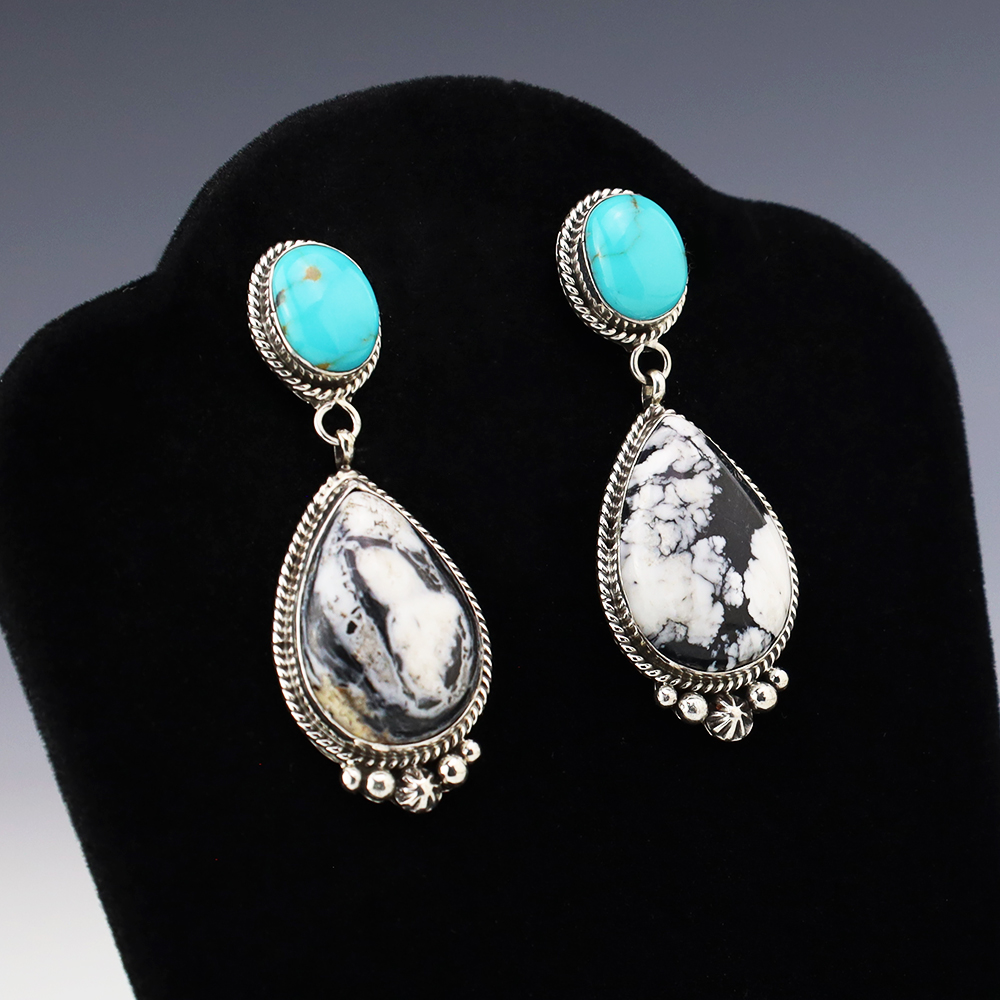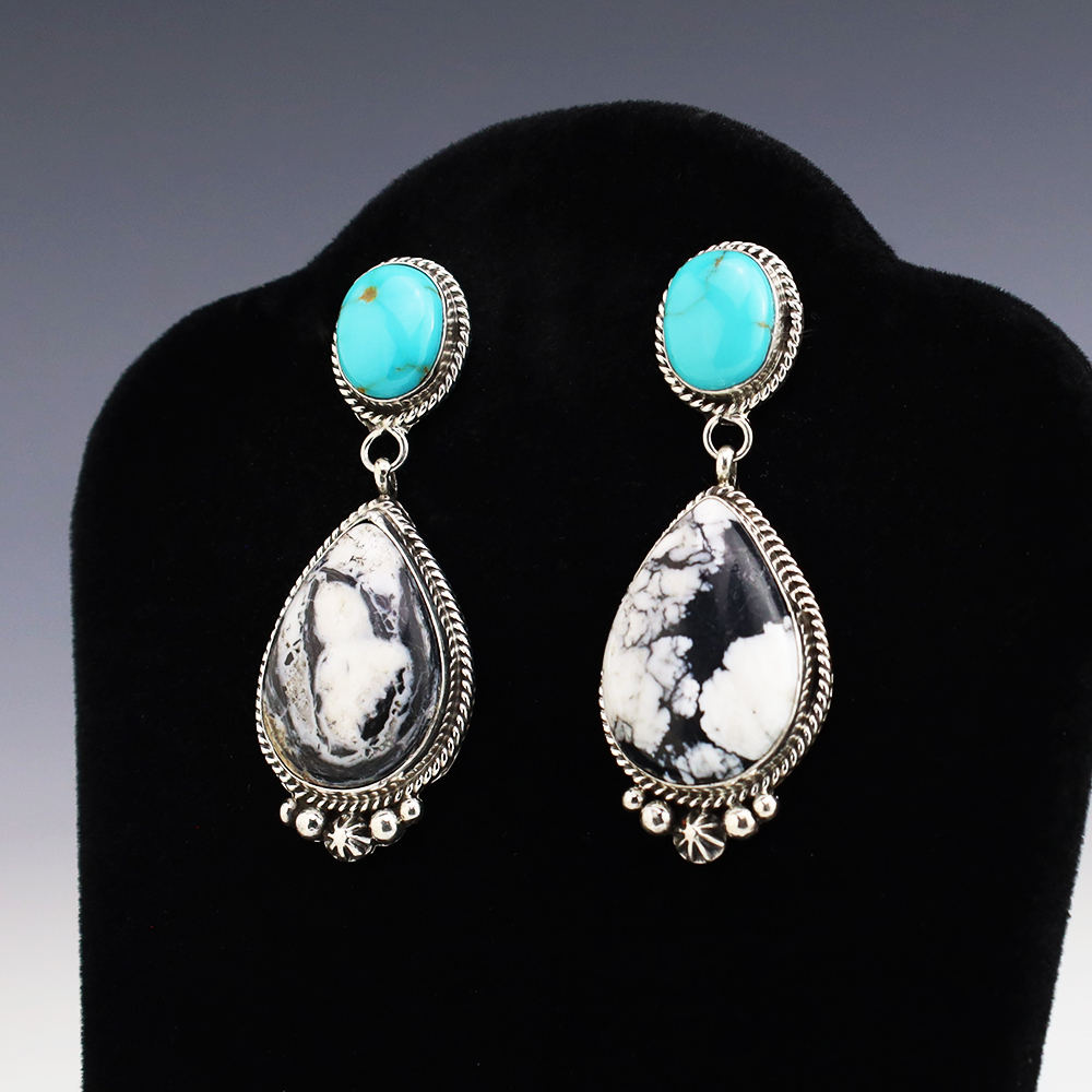 Lovely earrings hand made by Navajo silversmith Abellene Bahe. The earrings are sterling silver and set with White Buffalo and Turquoise stones. These fabulous earrings will become a versatile accessory in your jewelry collection. Weighs 16 grams. Signed.