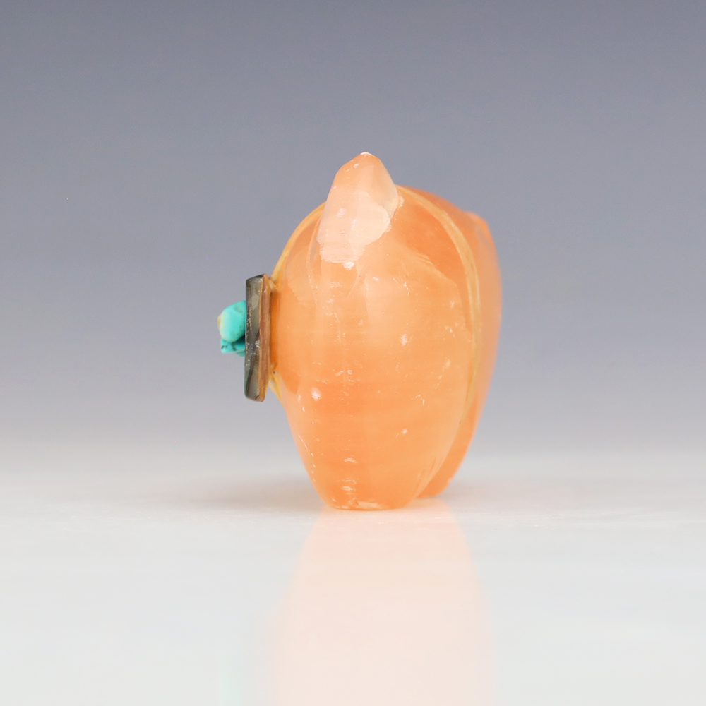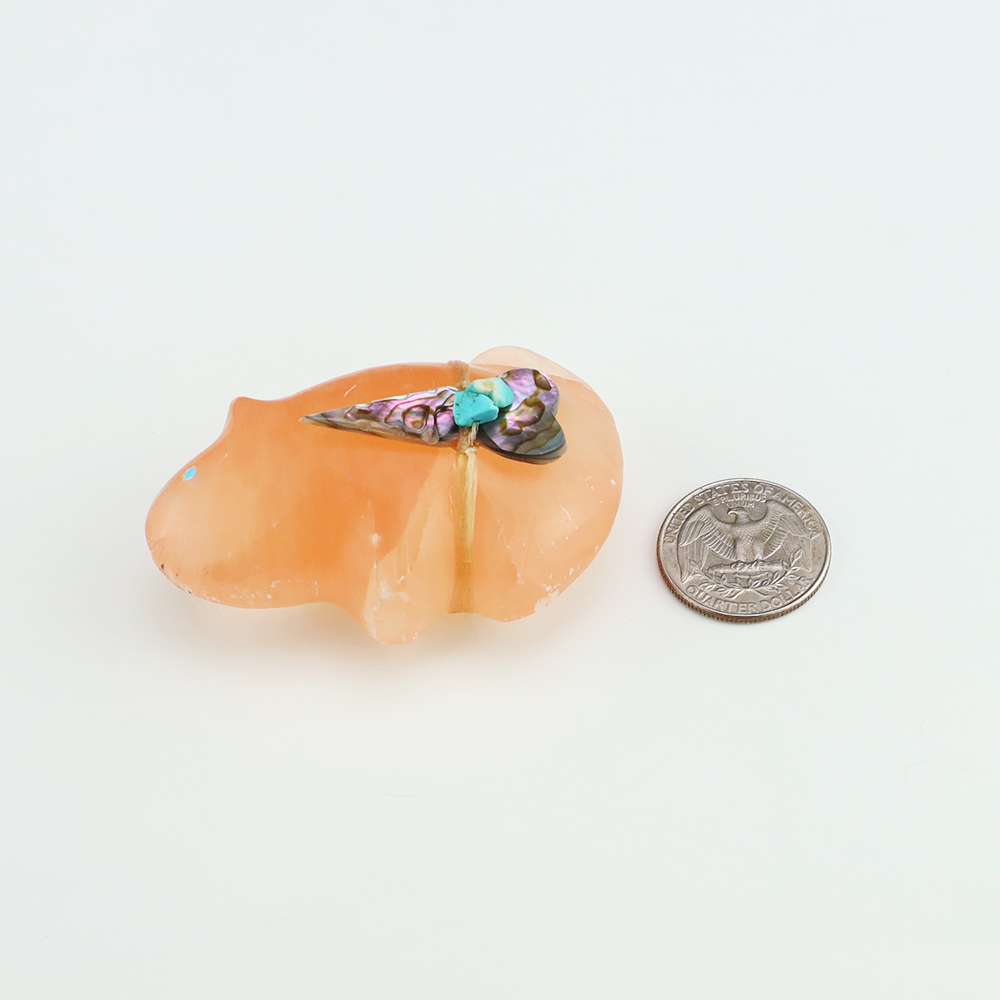 Zuni fetish artists Leland Boone and Daphne Quam made this outstanding Bobcat fetish. The carving is made out of Alabaster and is bundled with Turquoise and Abalone. This great carving would make a great addition to your Native American art or Zuni fetish collection. (note-there is natural fracturing in the stone)