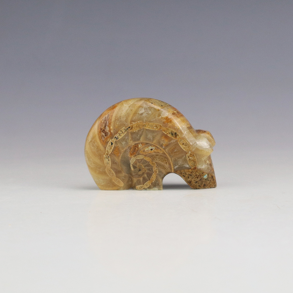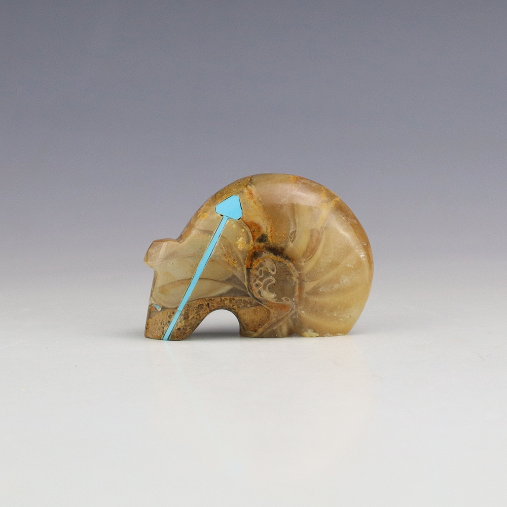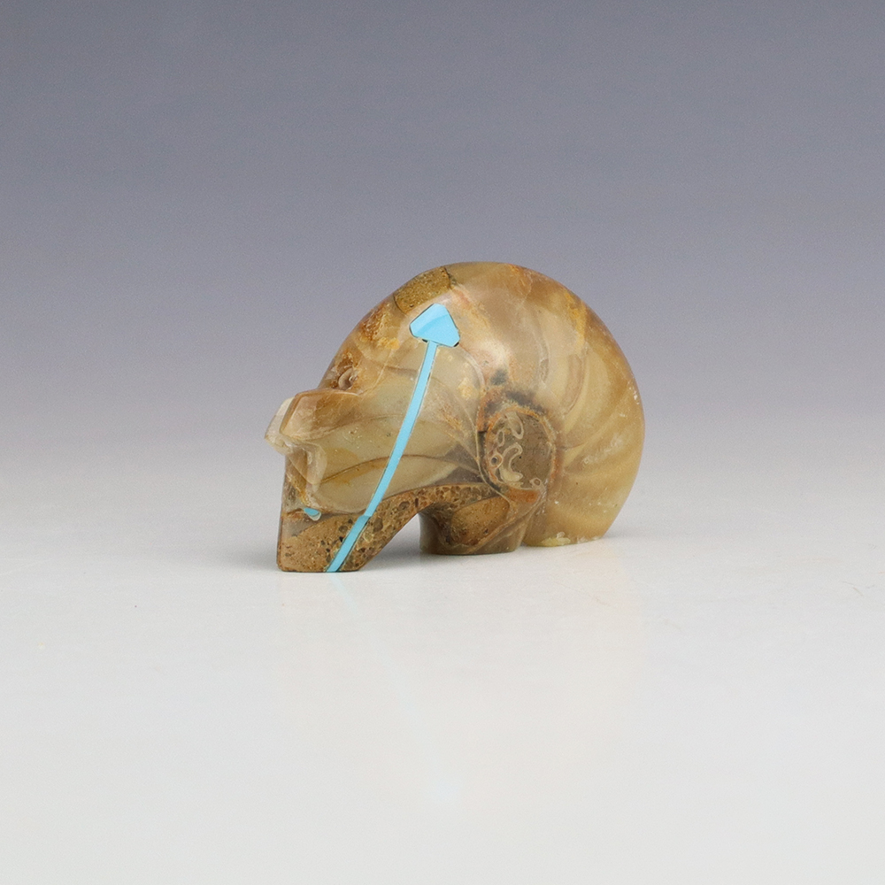 Zuni bear fetishes represent healing and strength. Zuni artist Kenric Laiwakete hand crafted this exquisite bear fetish. The bear carving is made out of an Ammonite. It has an inlaid Turquoise heartline. This great carving would make a great addition to your Native American art or Zuni fetish collection. Signed