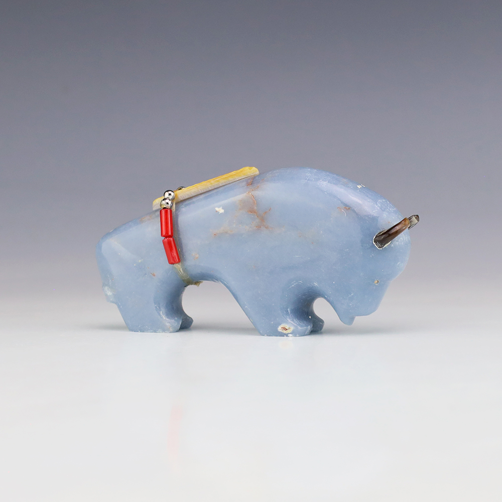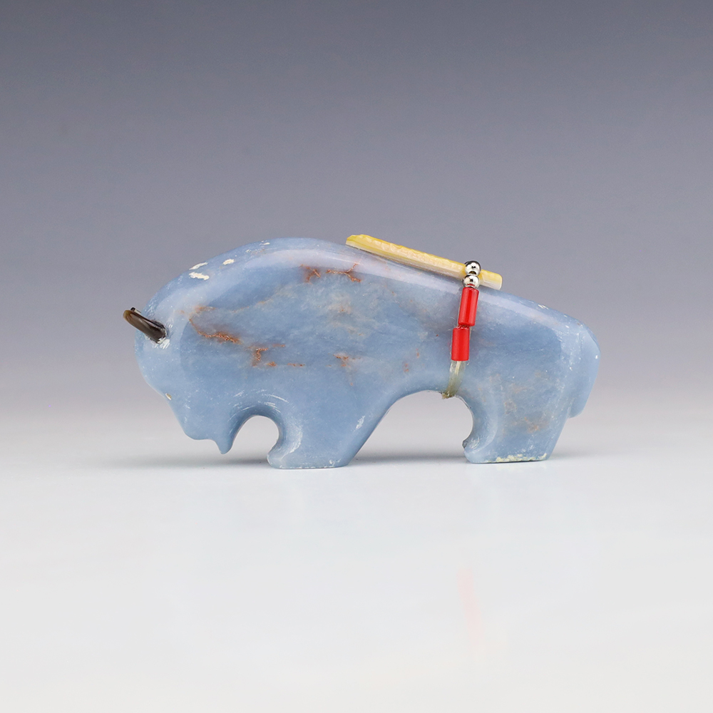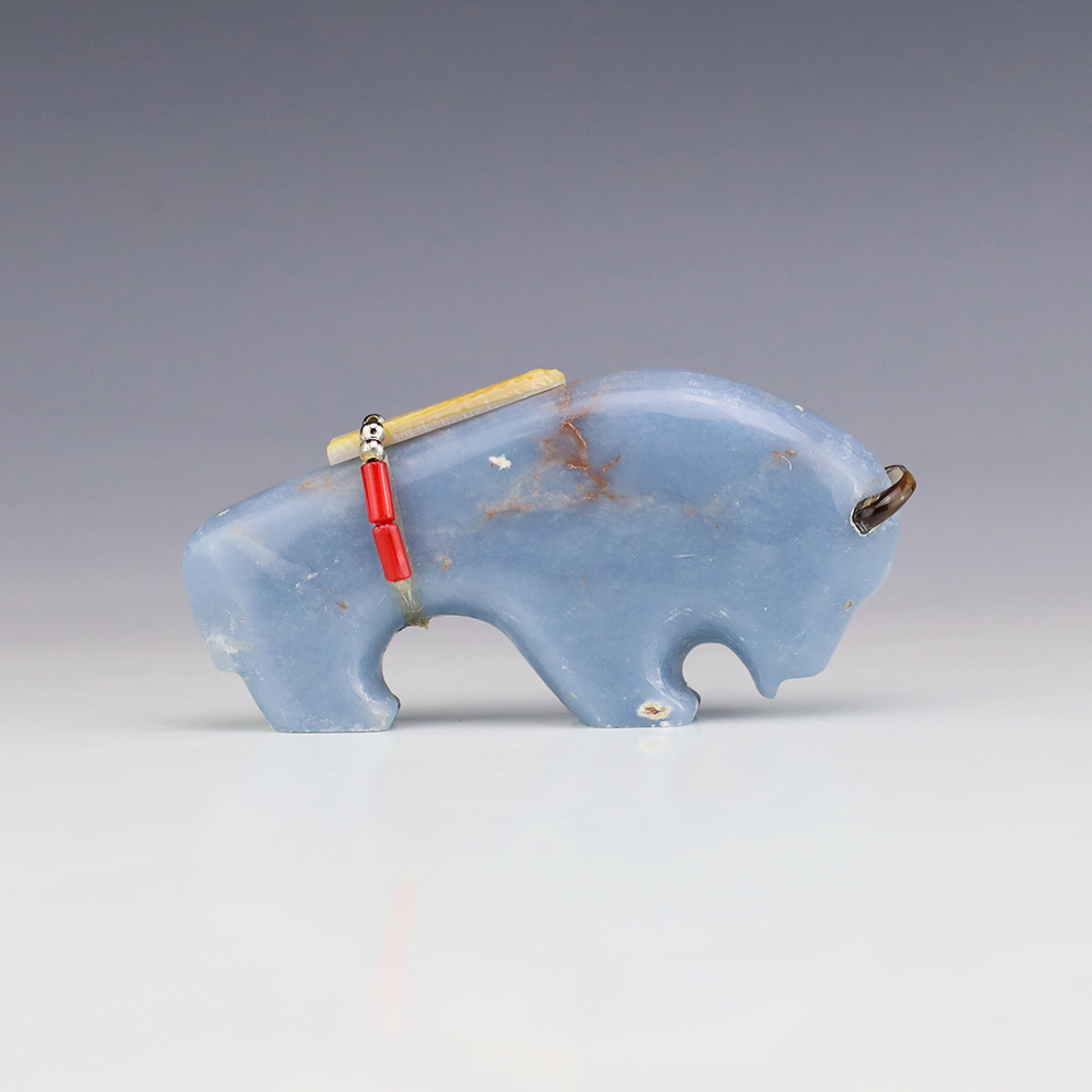 Zuni fetish artist Todd Westika hand carved this magnificent buffalo fetish out of Angelite and is bundled with Turquoise, Coral, and silver. Bold form that gives this buffalo fetish a sense of strength and endurance. Signed