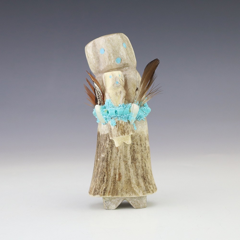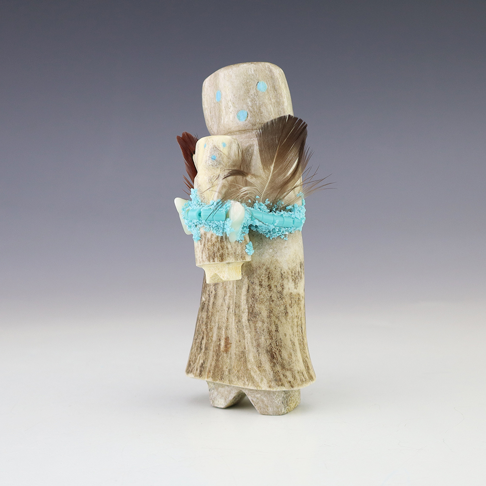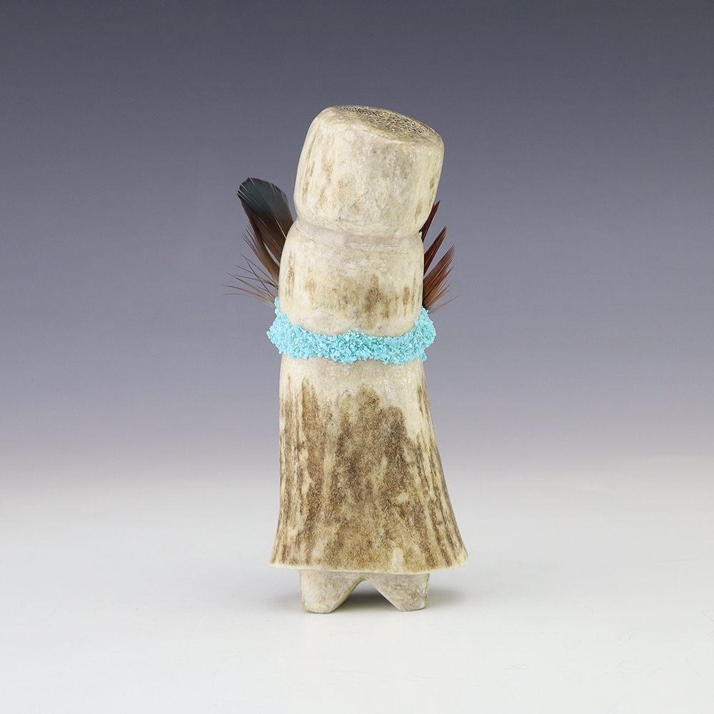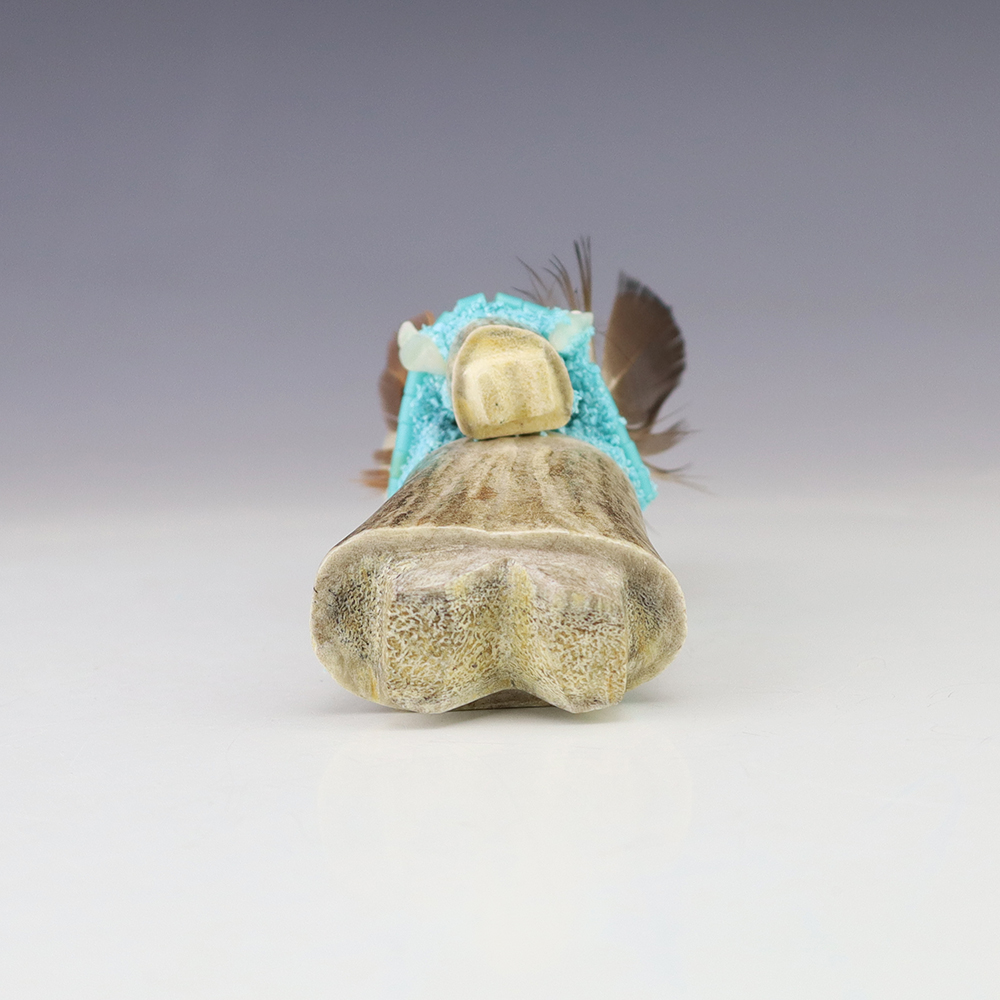 Zuni artist Marvelita Phillps hand carved this beautiful Alter Doll. Made out of antler and Turquoise. This carving would make a great addition to your Native American or Zuni fetish collection. Signed