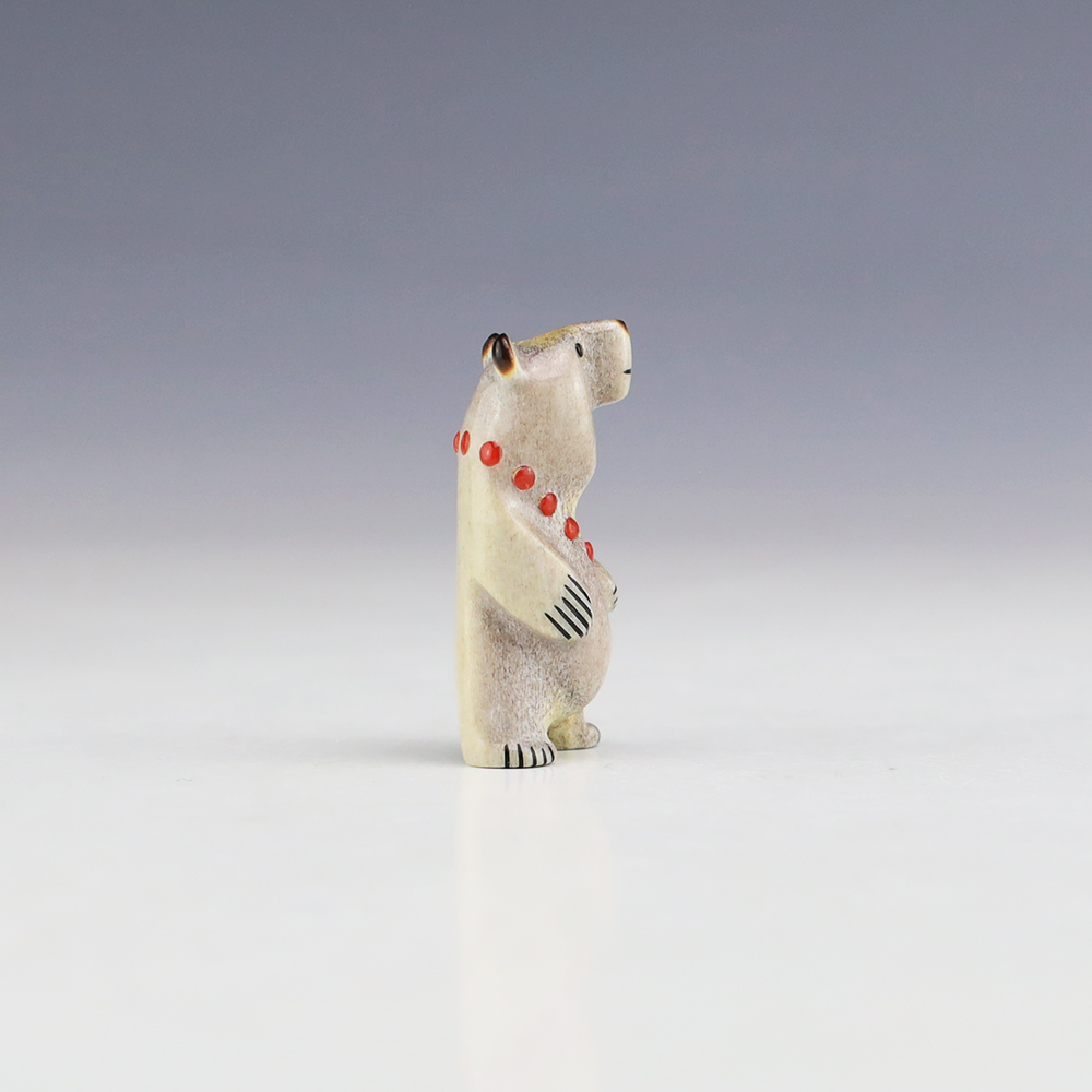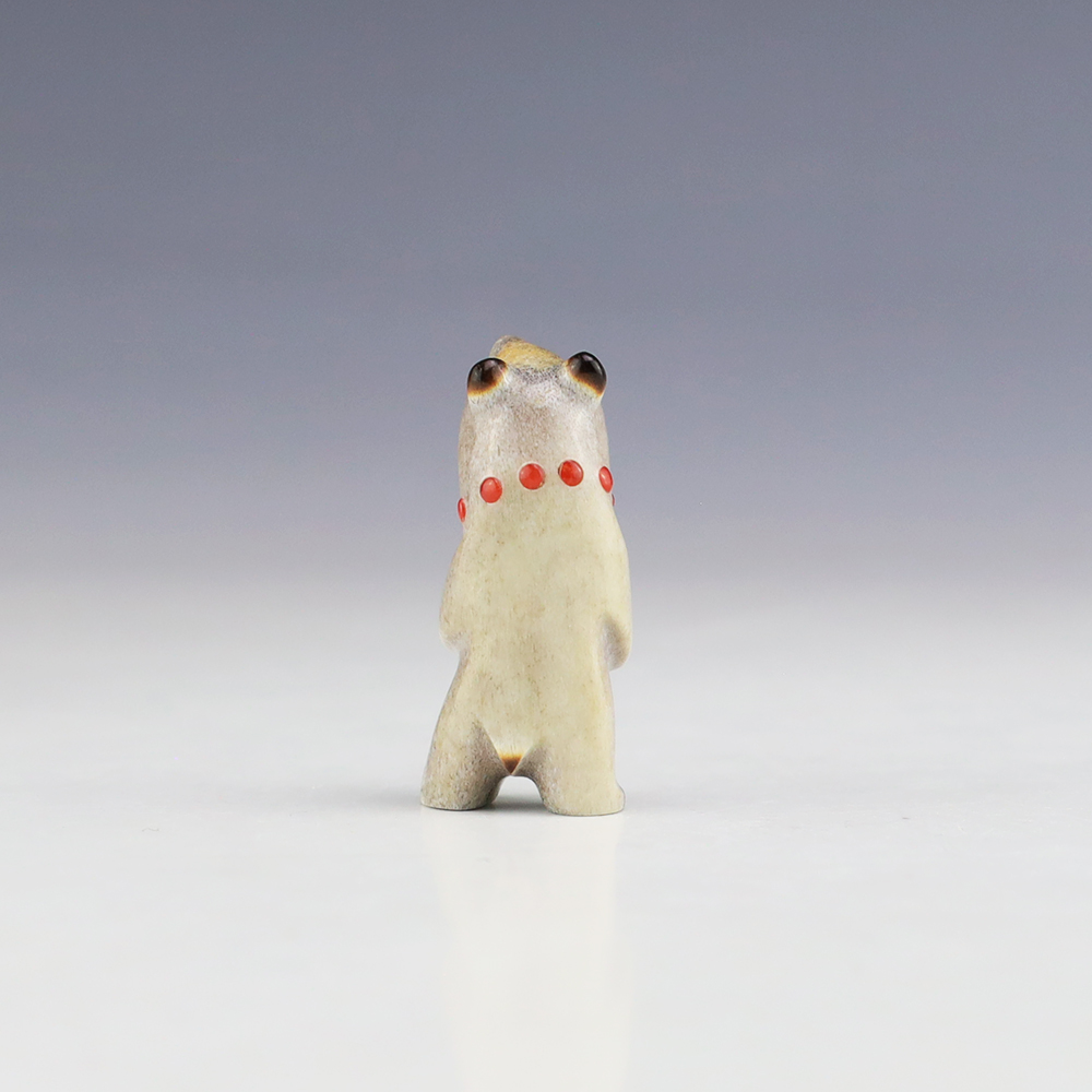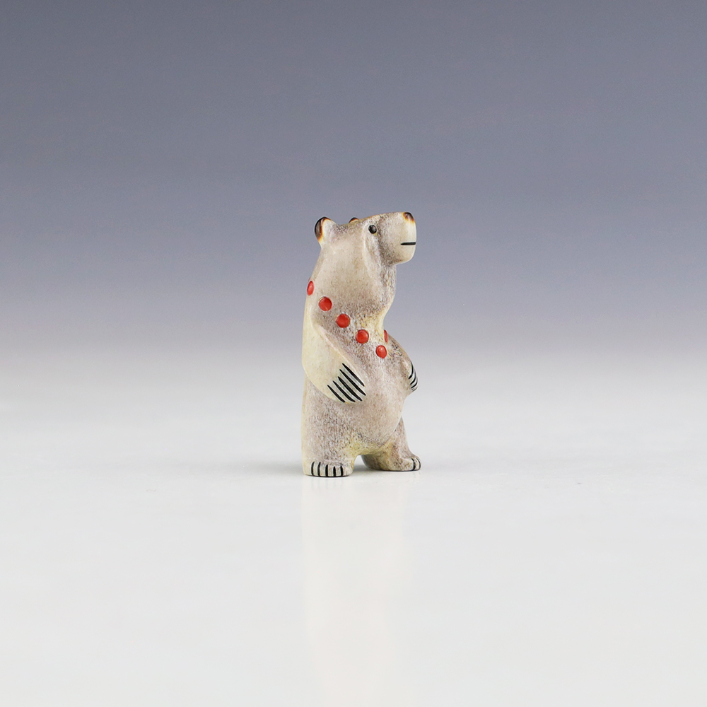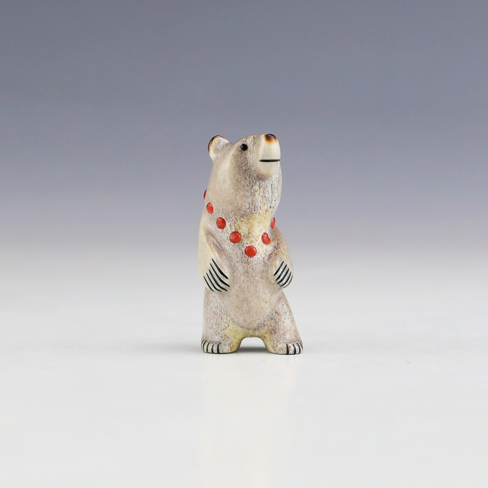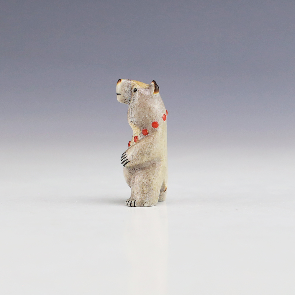 The Bear is the Guardian fetish of the West, and represents healing and strength. This wonderfully carved bear fetish is made out of Antler and inlaid with natural Coral. Zuni artist Gabe Sice is known for this outstanding bears. This carving would make a great addition to your Native American art or Zuni fetish collection. Signed