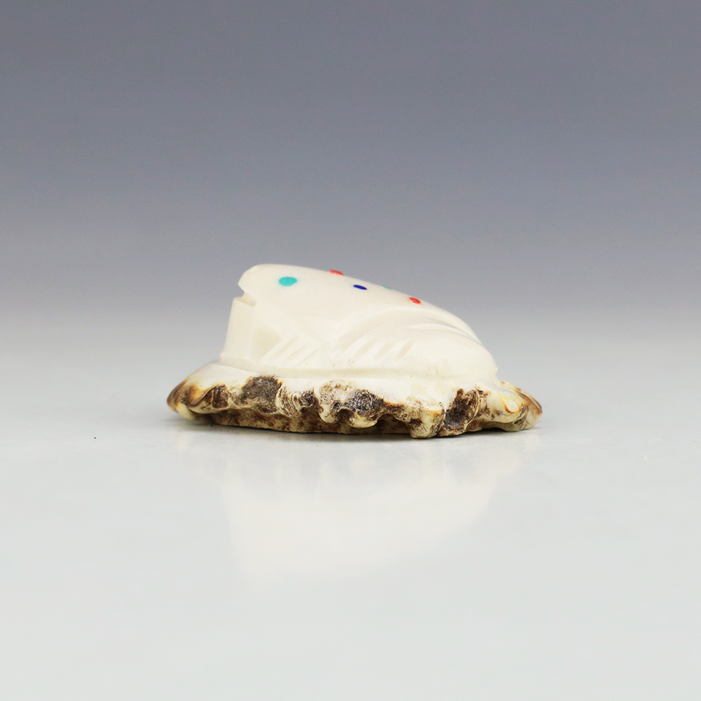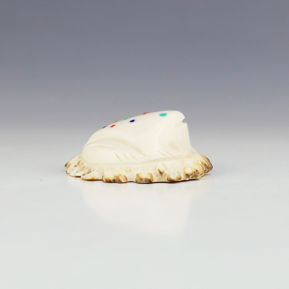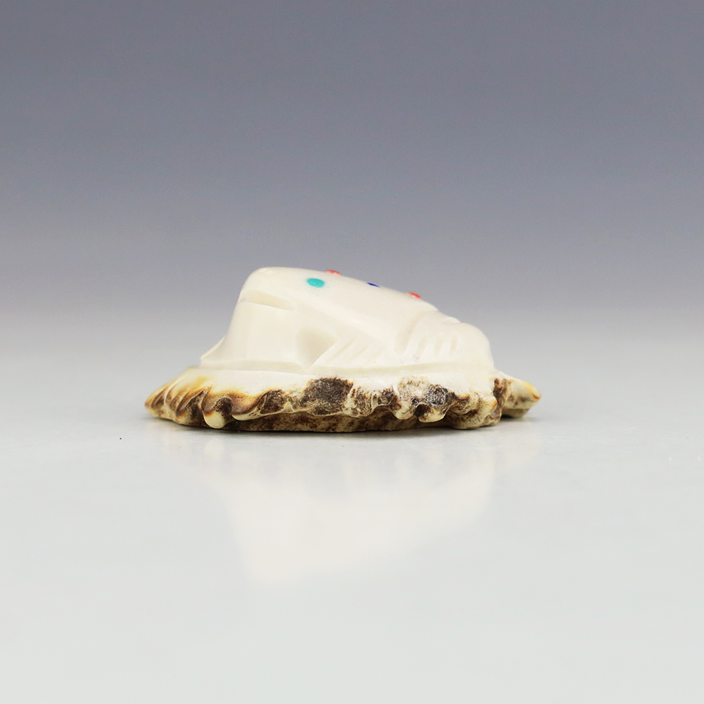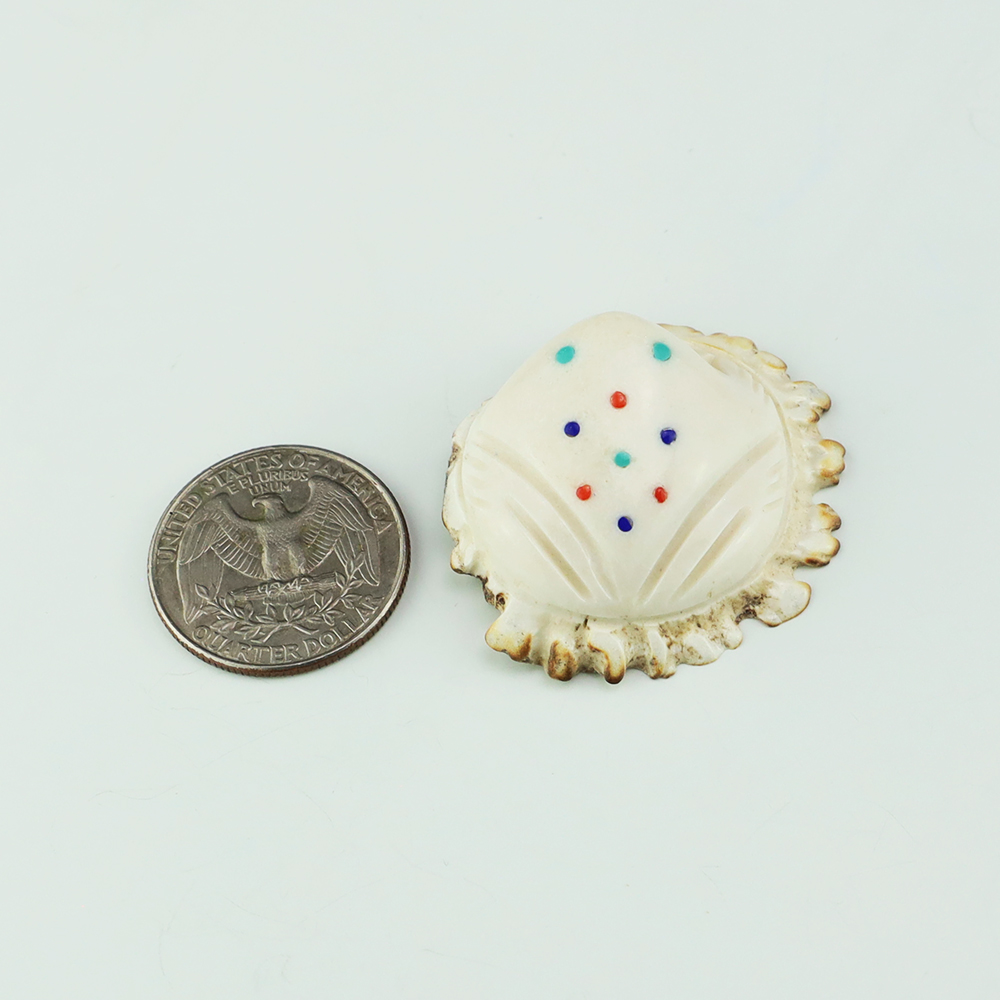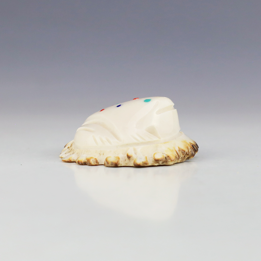 In prehistoric times, frog carvings appeared in jewelry. Zuni frog fetishes are associated with rain, abundance, and fertility. Zuni artist Robert Weahkee made this fabulous Frog fetish. Hand carved out of Antler and inlaid with Coral, Lapis, and Turquoise. This great carving would make a great addition to your Native American art or Zuni fetish collection. Signed