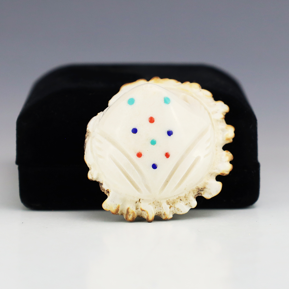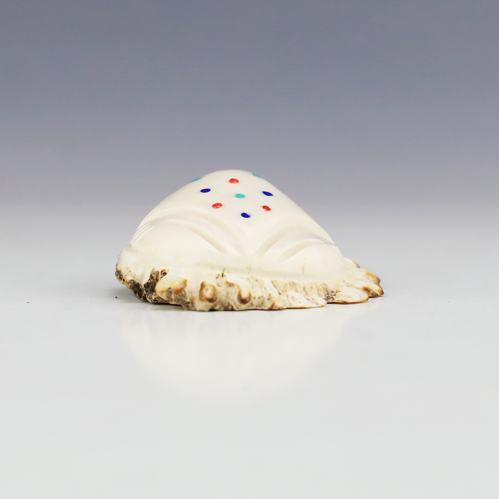 Zuni artist Gabe Sice hand carved this lovely maiden fetish. Made out of antler with intricate detail and inlaid with natural Sleeping Beauty Turquoise, Mediterranean Coral, and Penn Shell. (note-there is natural pits in the antler) This maiden would make a great addition to your Native American or Zuni fetish...