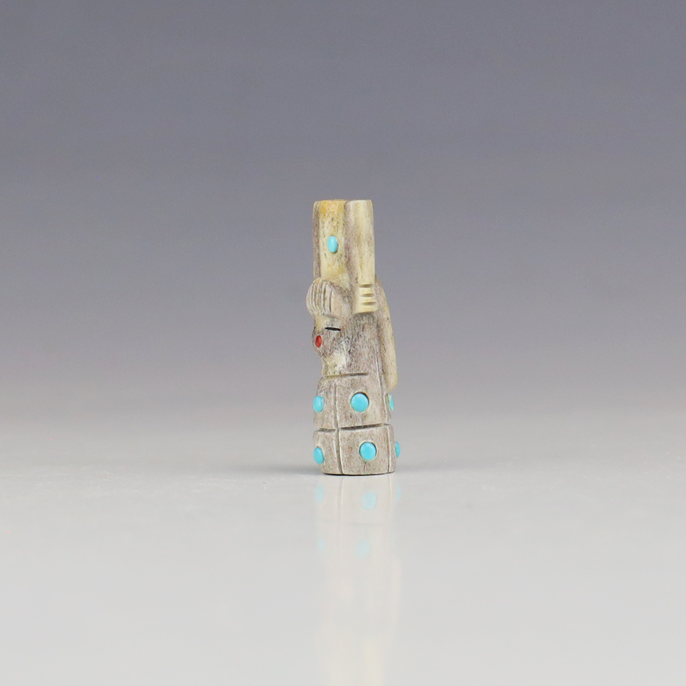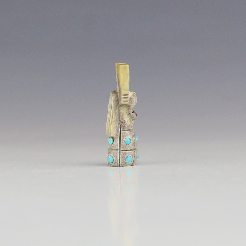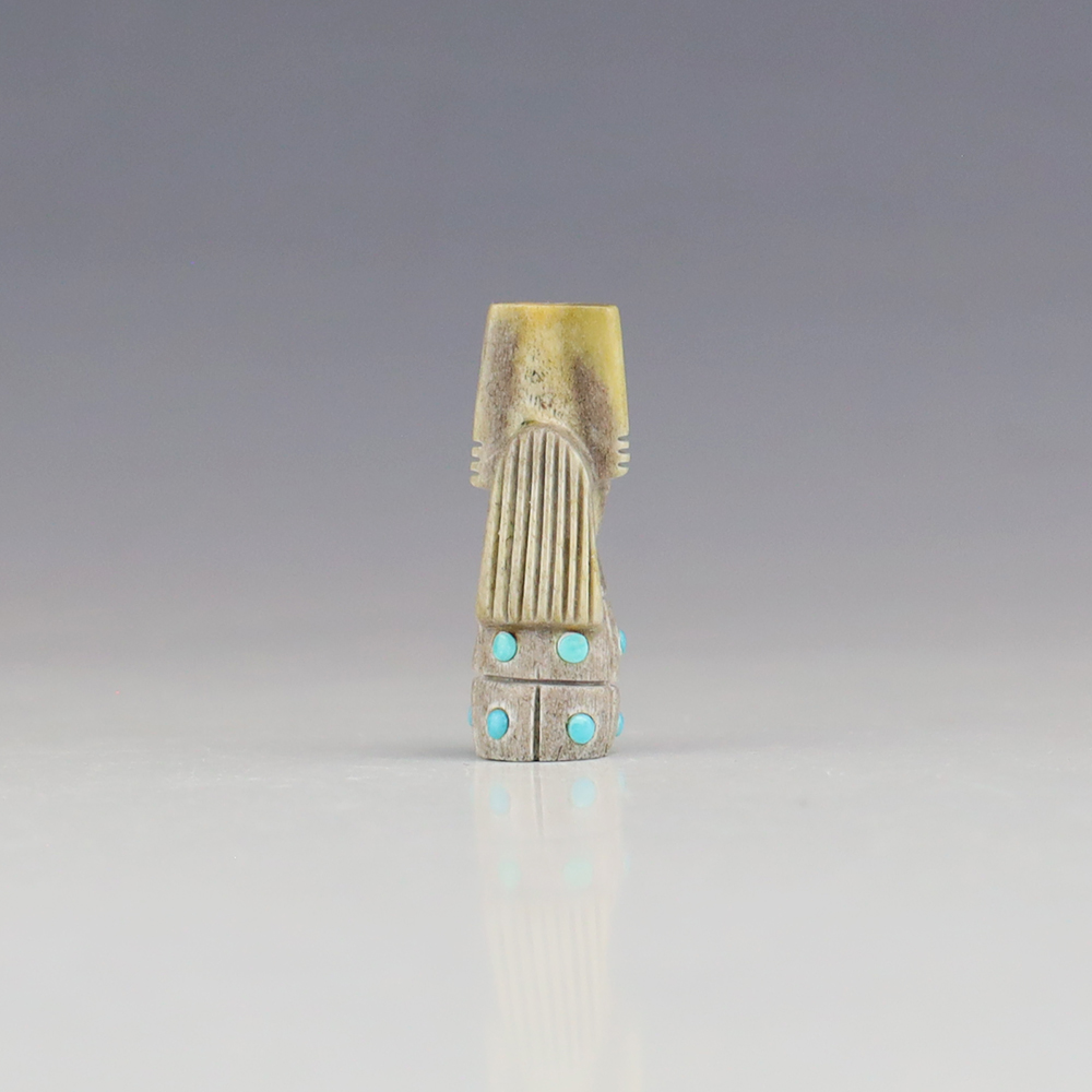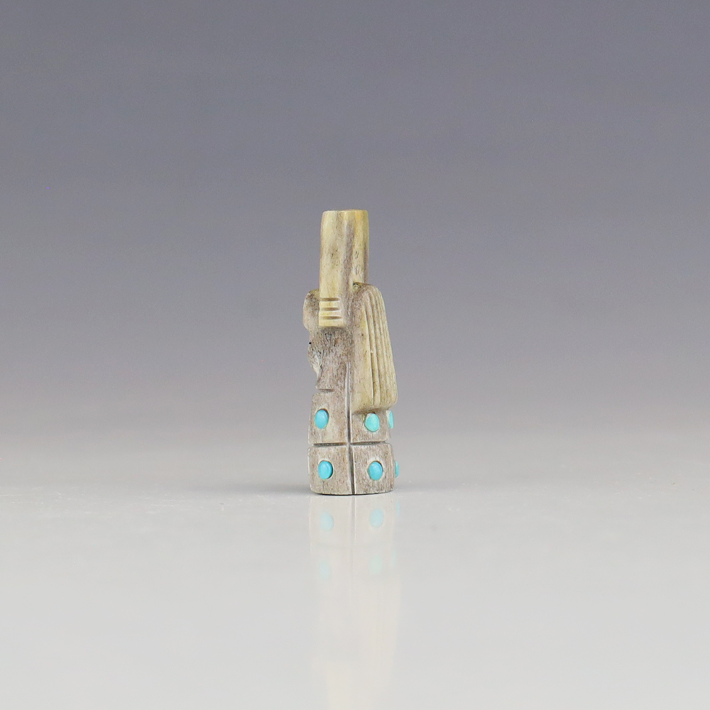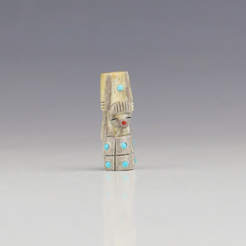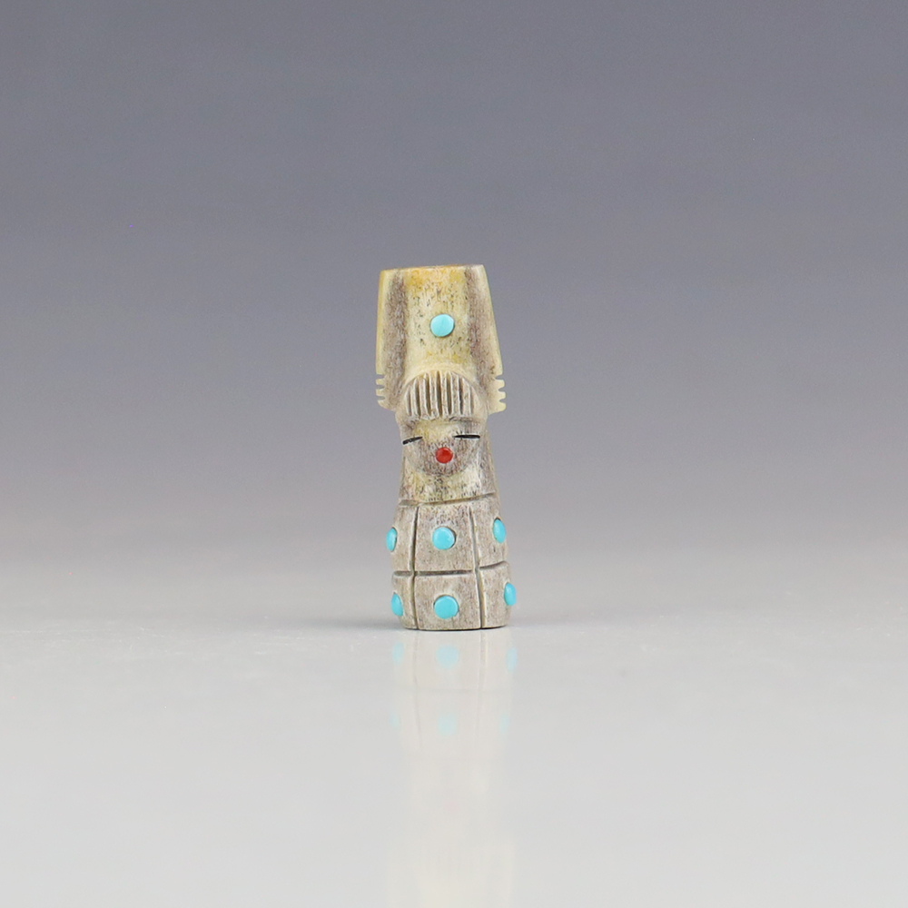 Zuni artist Gabe Sice hand carved this gorgeous maiden fetish. Made out of antler with intricate detail and inlaid with natural Mediterranean Coral, Sleeping Beauty Turquoise, and Penn Shell. This maiden would make a great addition to your Native American or Zuni fetish collection. Signed