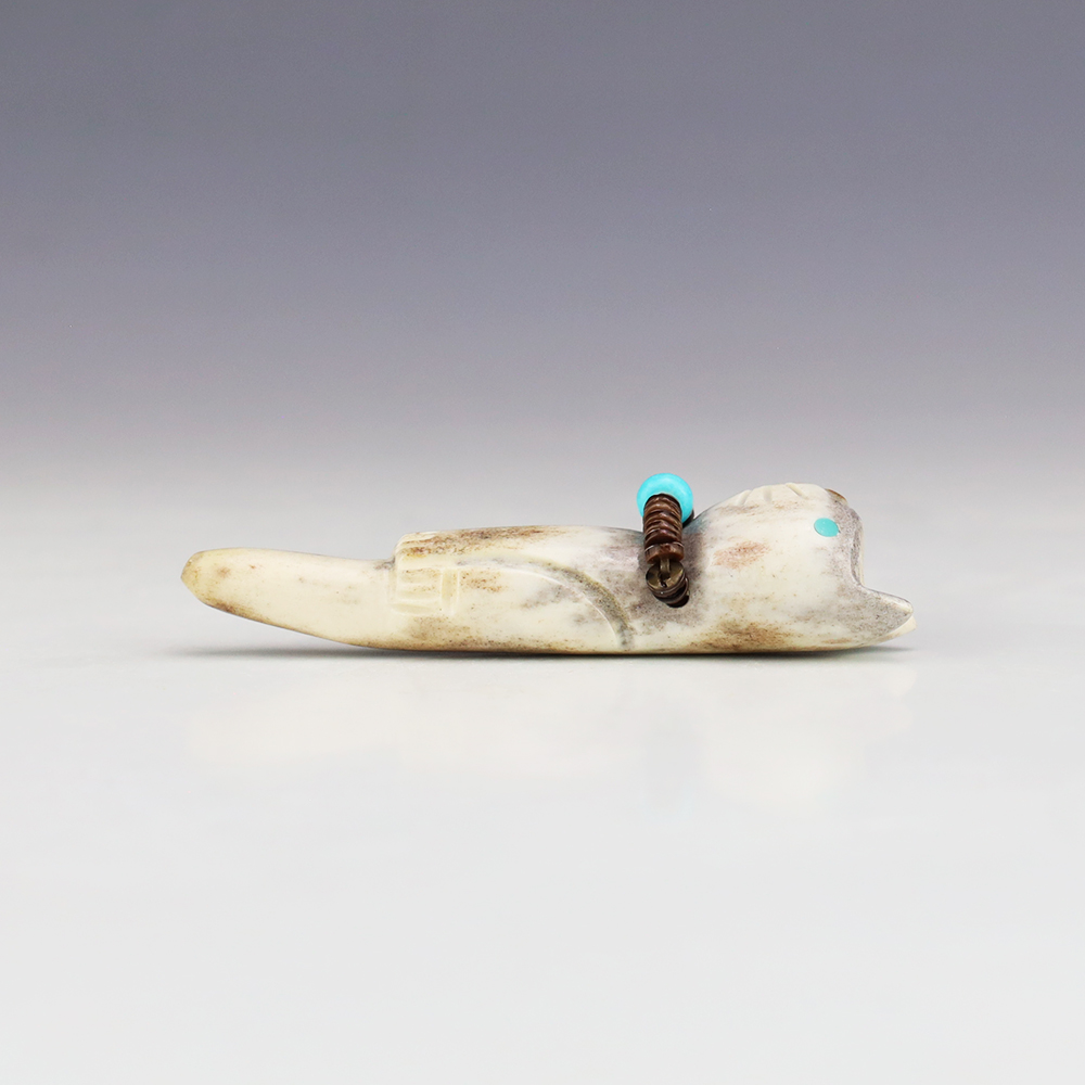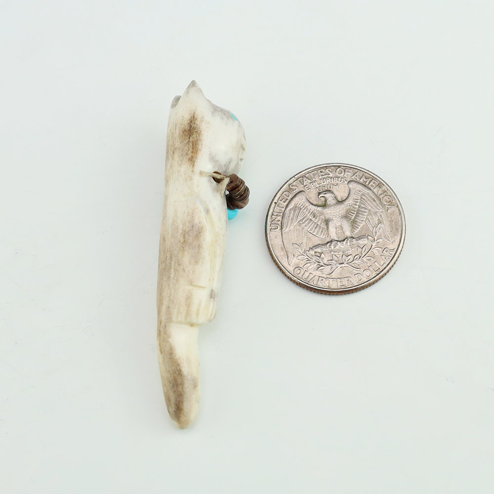 Zuni artist Robert Weahkee made this fabulous otter fetish. Hand carved out of Antler and his eyes are made out of Turquoise. This great carving would make a great addition to your Native American art or Zuni fetish collection.