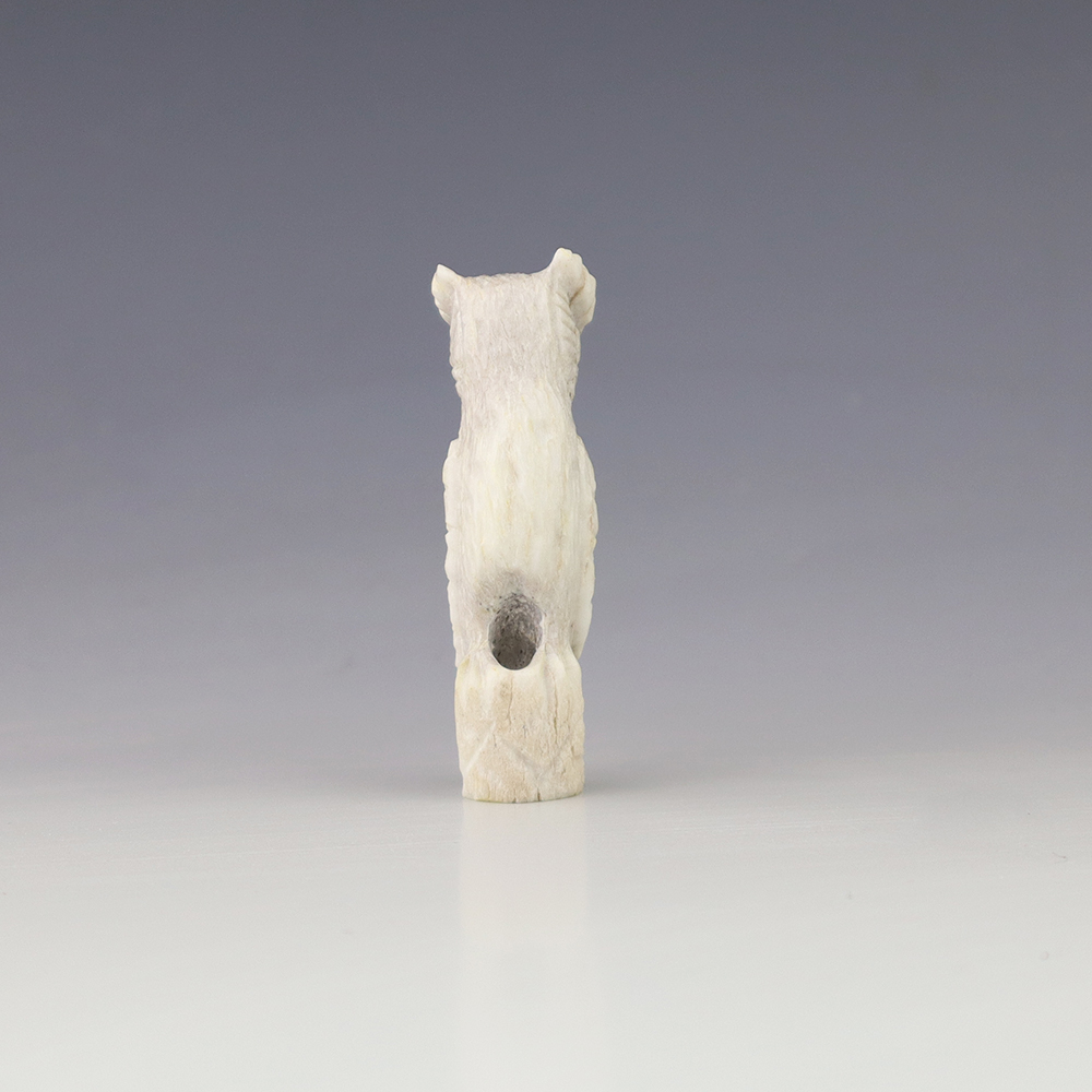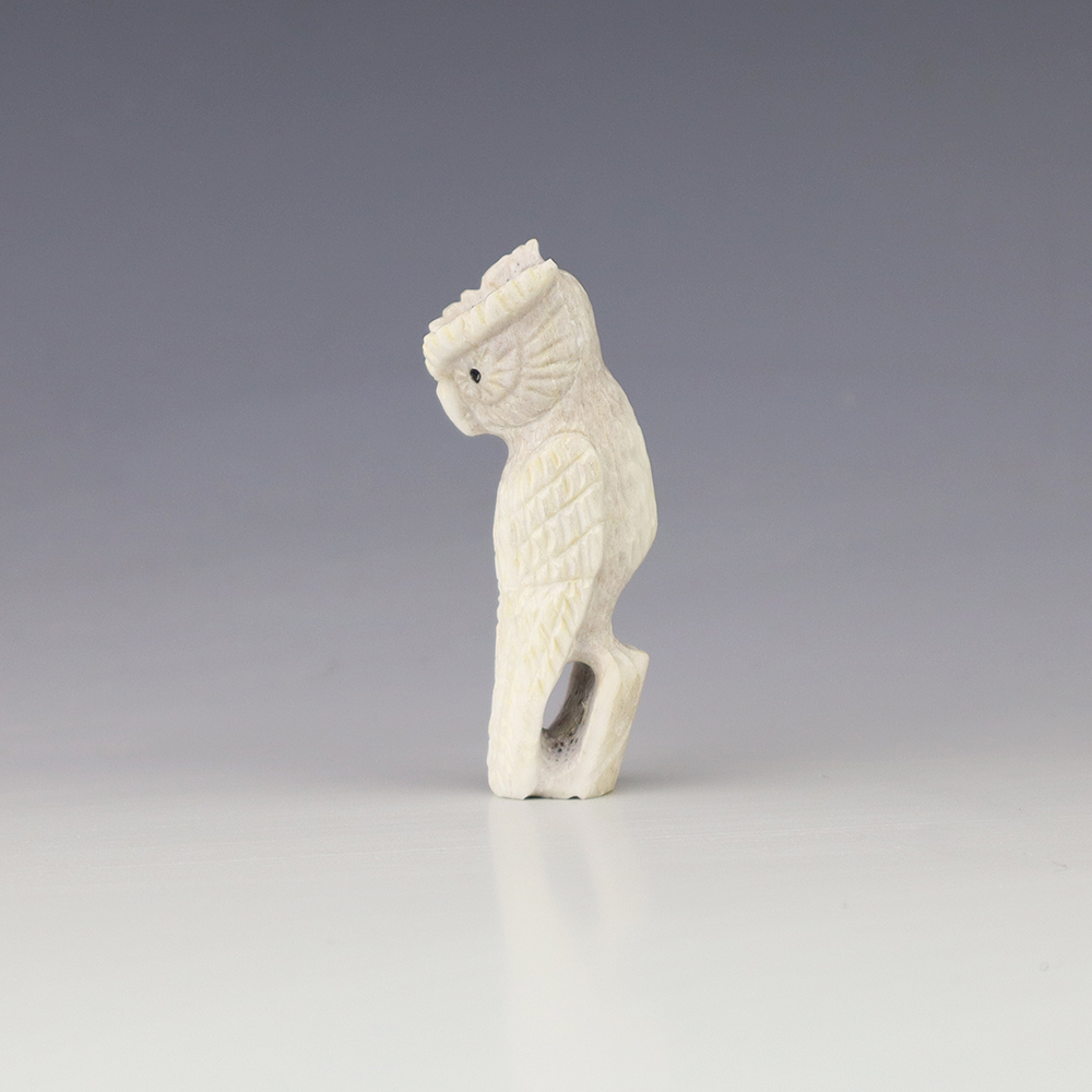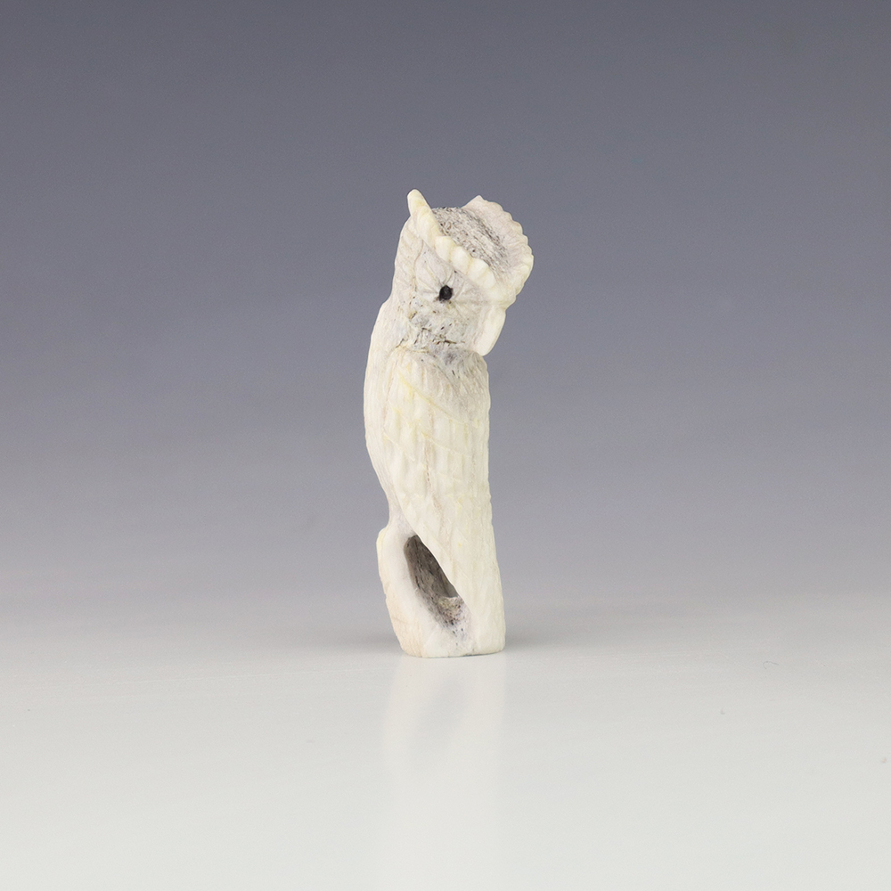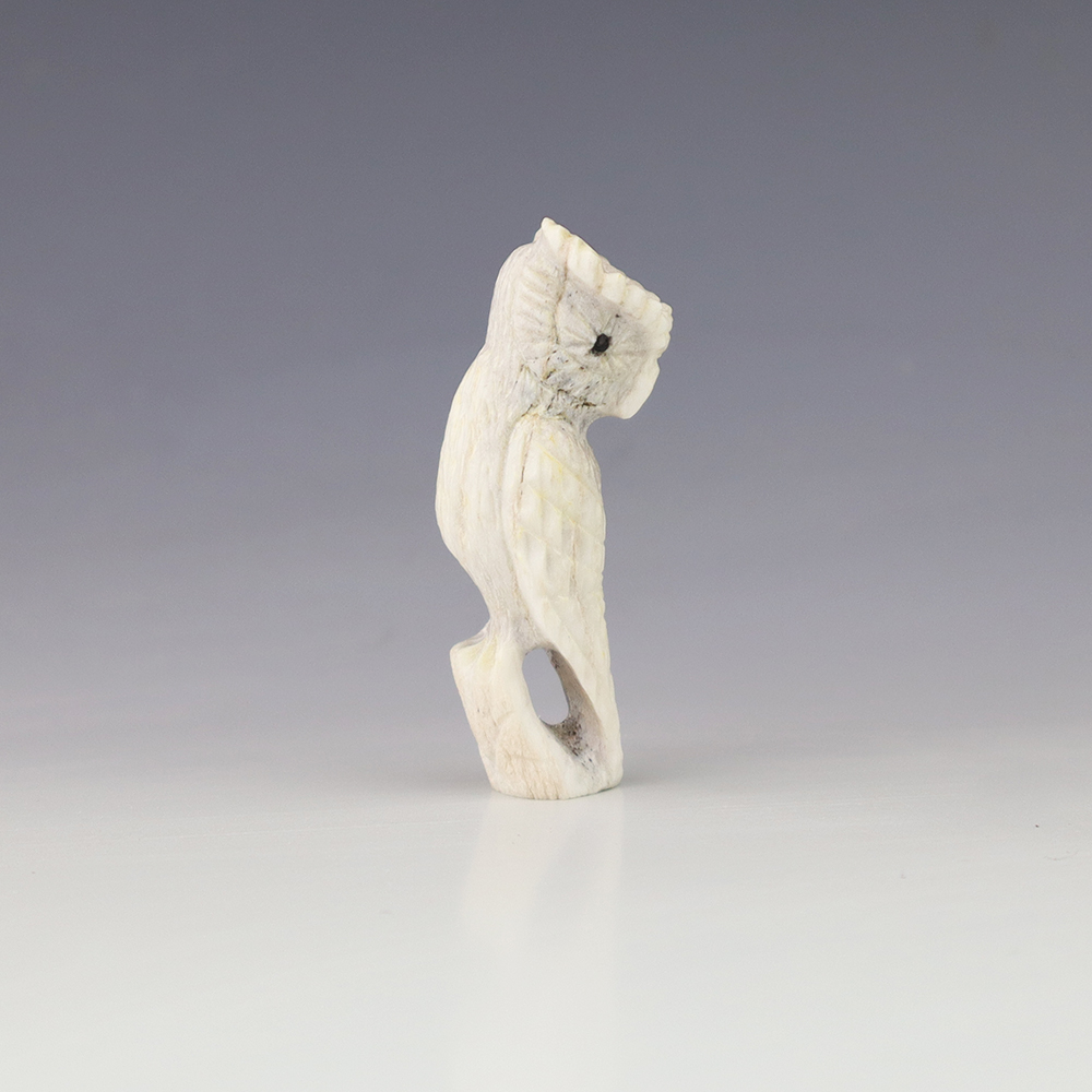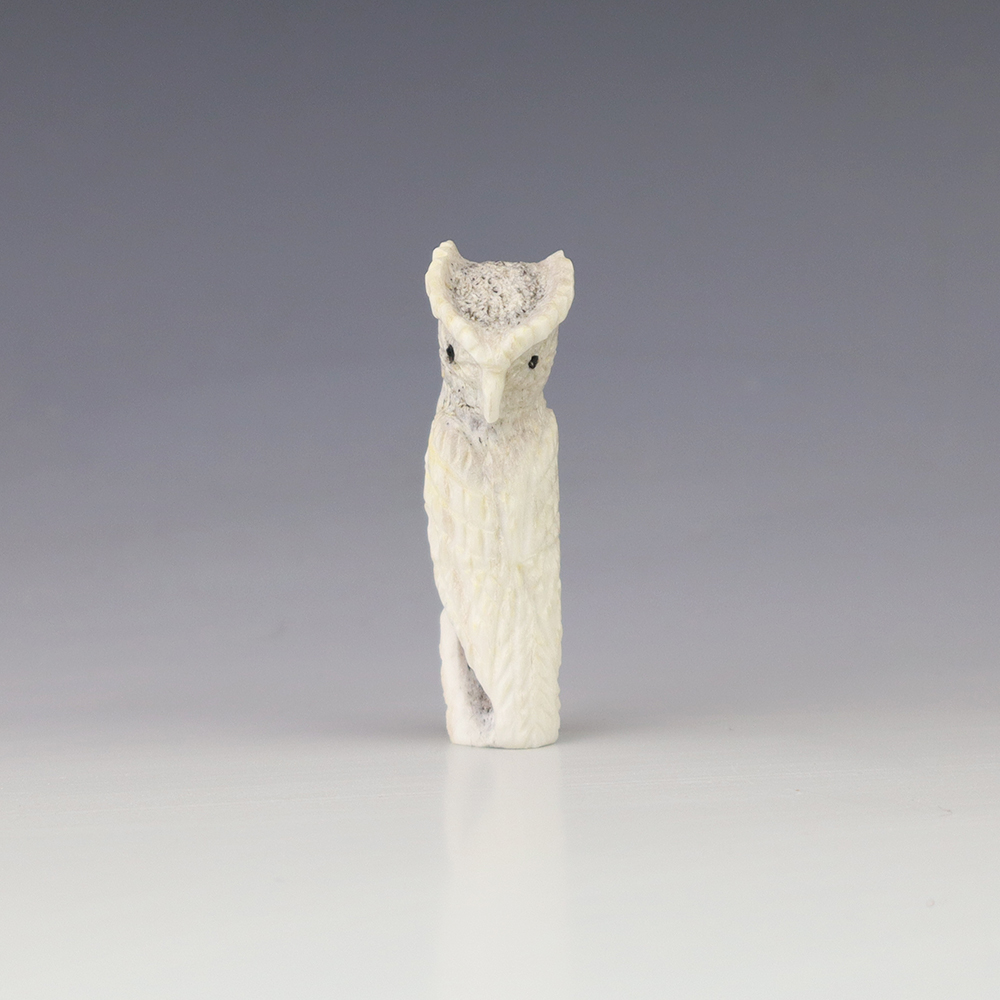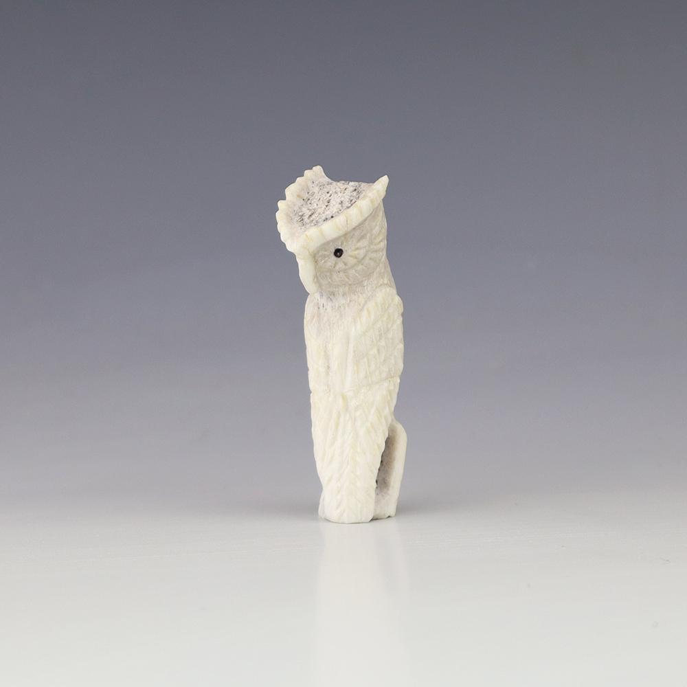 The Owl is the protector of the home. He represents wisdom and truth, and has the ability to see what others cannot. Zuni artist Chris Peina made this marvelous owl fetish. Hand carved out of Antler and Mother of Pearl Shell. This great carving would make a great addition to your Native American art or Zuni fetish collection. Signed