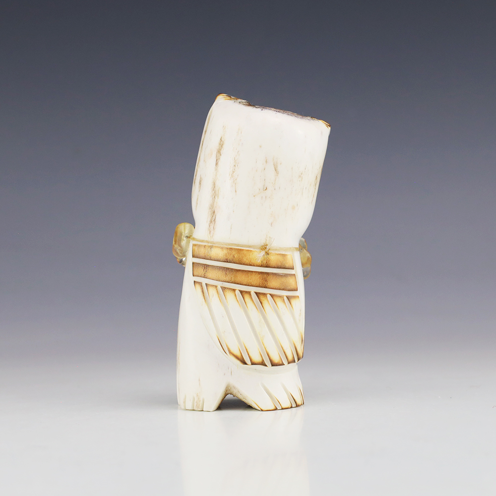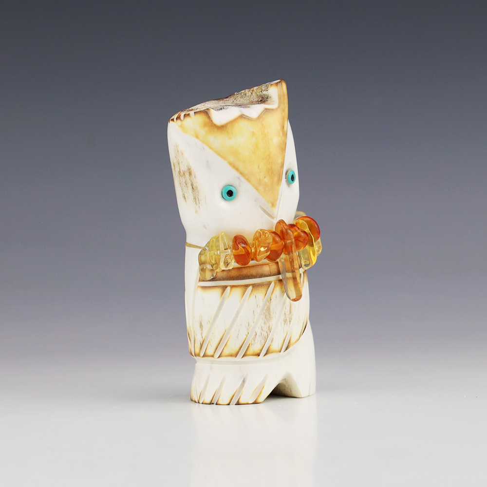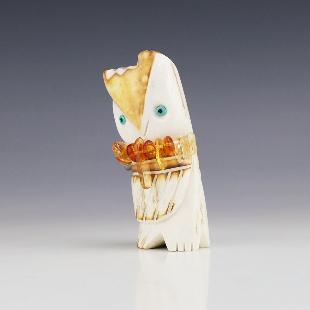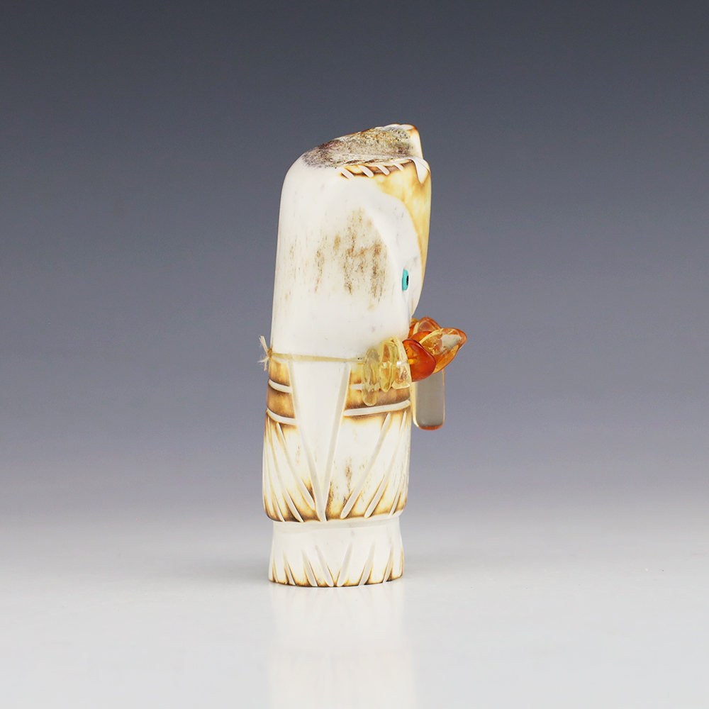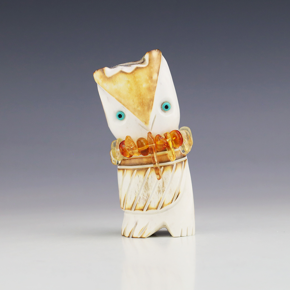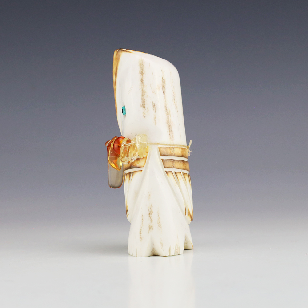 The Owl is the protector of the home. He represents wisdom and truth, and has the ability to see what others cannot. Zuni artist Robert Weahkee made this wonderful owl fetish. Hand carved out of Antler. This great carving would make a great addition to your Native American art or Zuni fetish collection. Signed