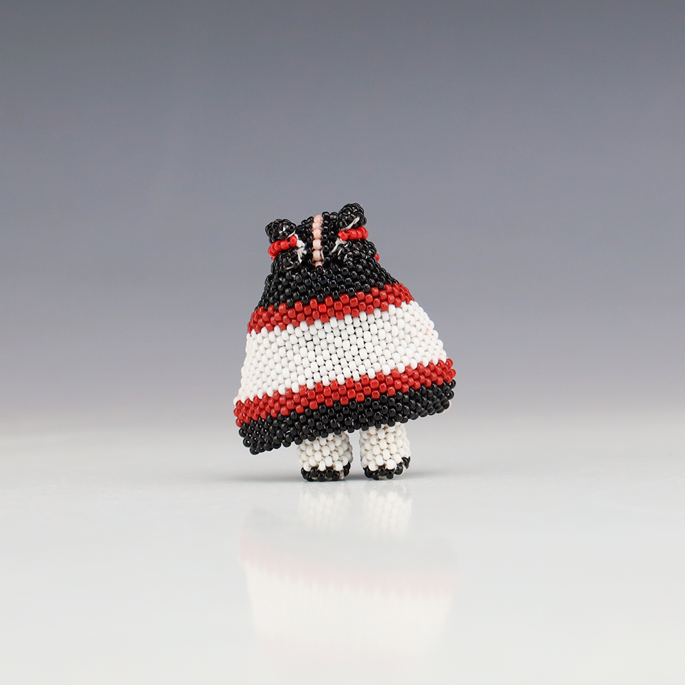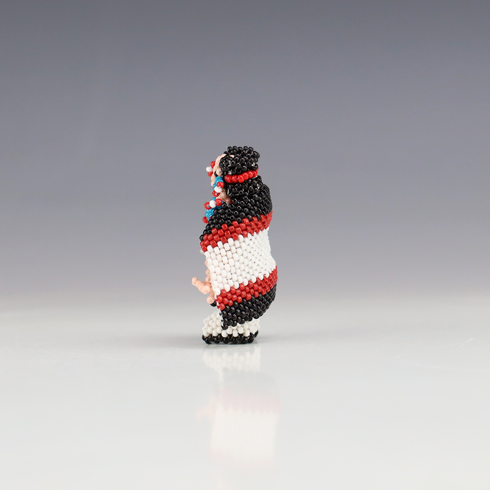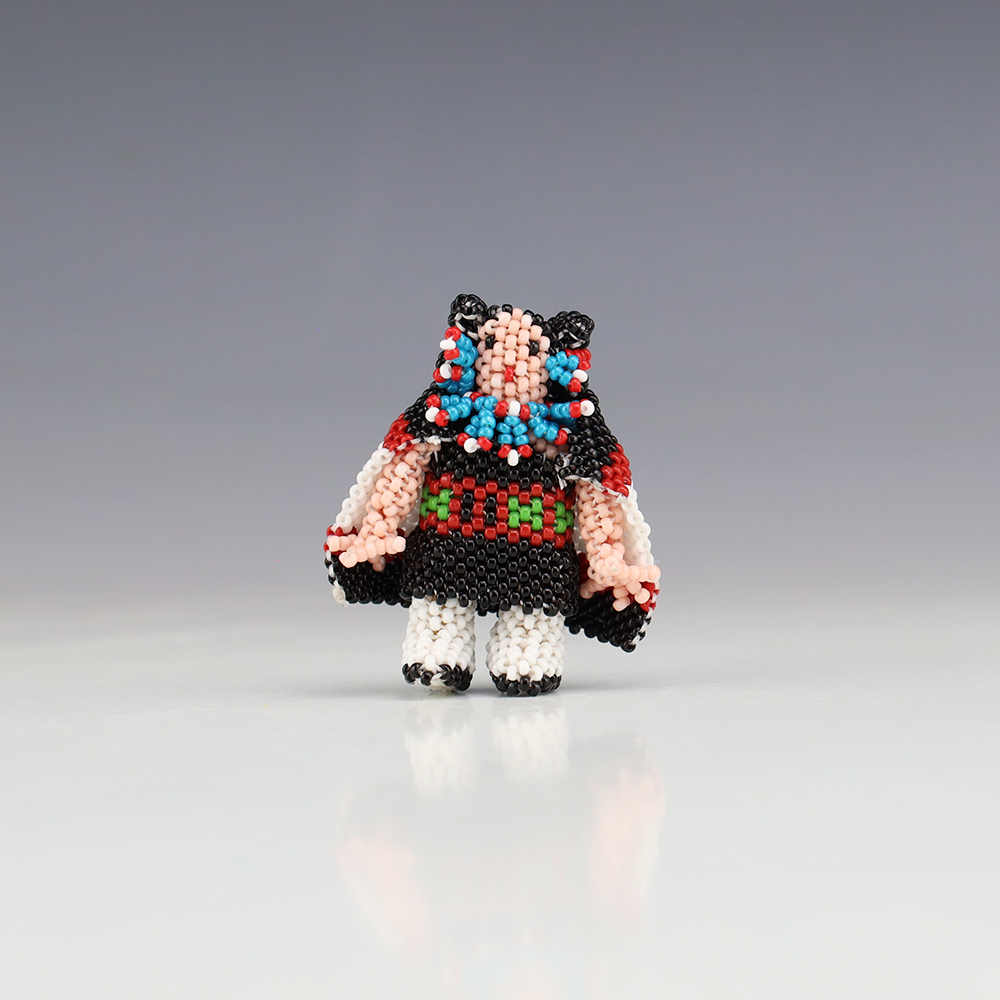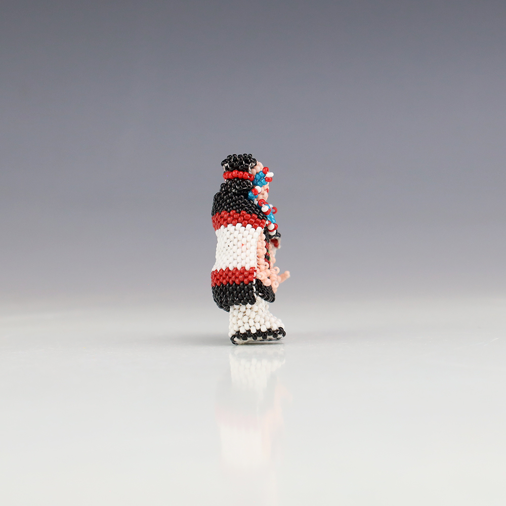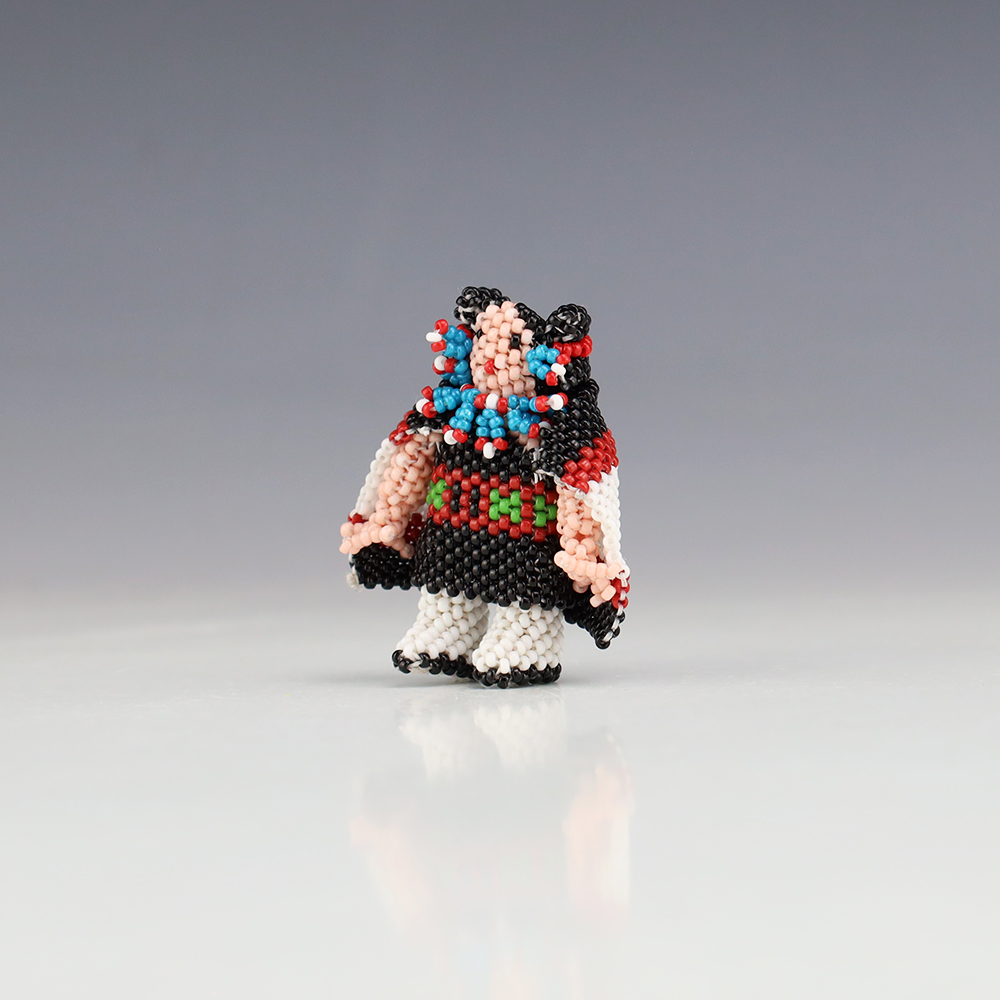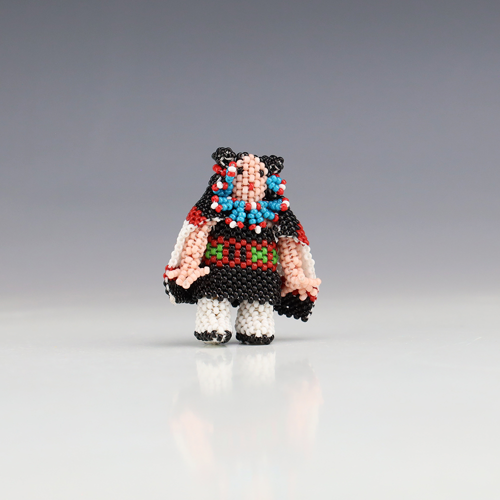 Zuni beadwork has evolved from tourist souvenirs to detailed pieces of folk art. First the Zuni artists carve a wooden form and then they bead over it, using the peyote stitch and seed or glass beads. With a continuous strand, Zuni beaders meticulously create wonderful patterns throughout their beadwork. This beautiful Maiden was hand beaded by award winning artist Alesia Poncho.