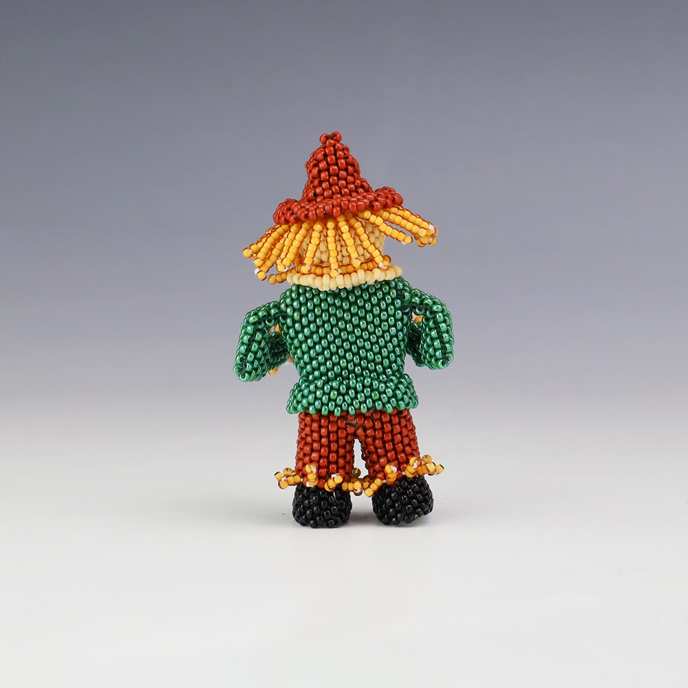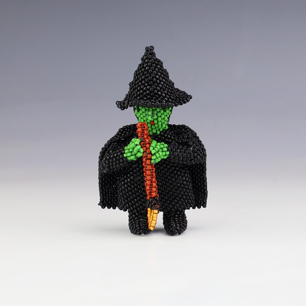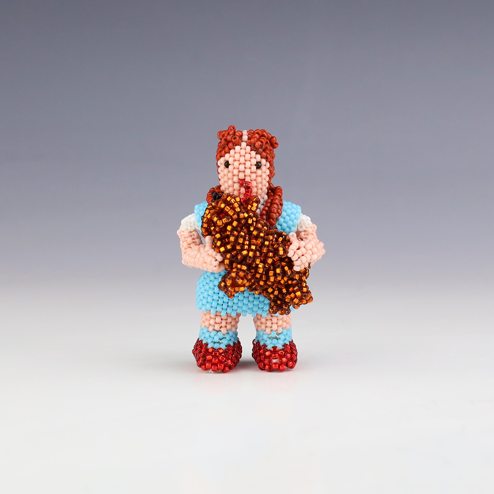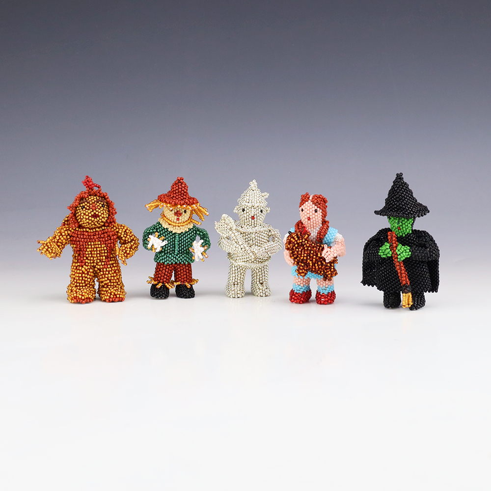 Zuni beadwork has evolved from tourist souvenirs to detailed pieces of folk art. First the Zuni artists carve a wooden form and then they bead over it, using the peyote stitch and seed or glass beads. With a continuous strand, Zuni beaders meticulously create wonderful patterns throughout their beadwork. This exquisite Wizard of Oz set was hand beaded by award winning artist Alesia Poncho. Alesia used tiny beads (size 11) to capture the details in the characters. Signed