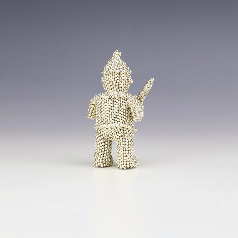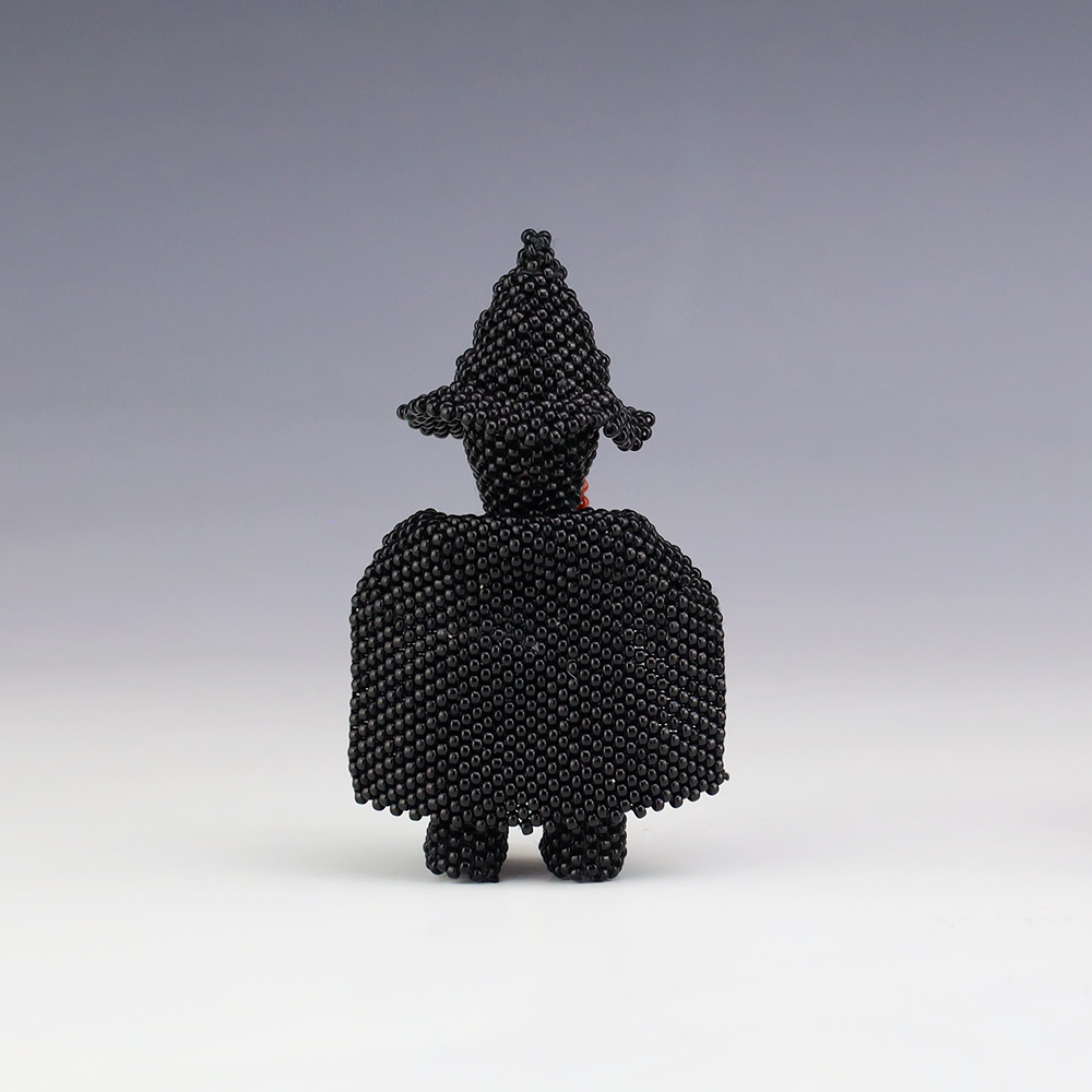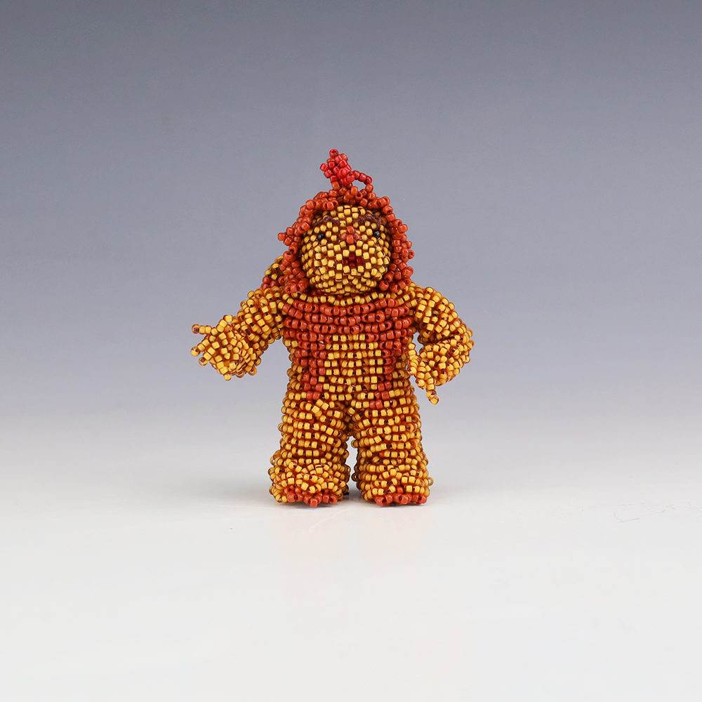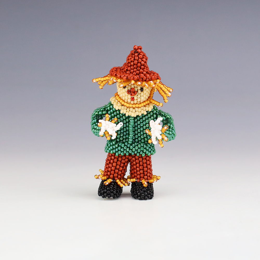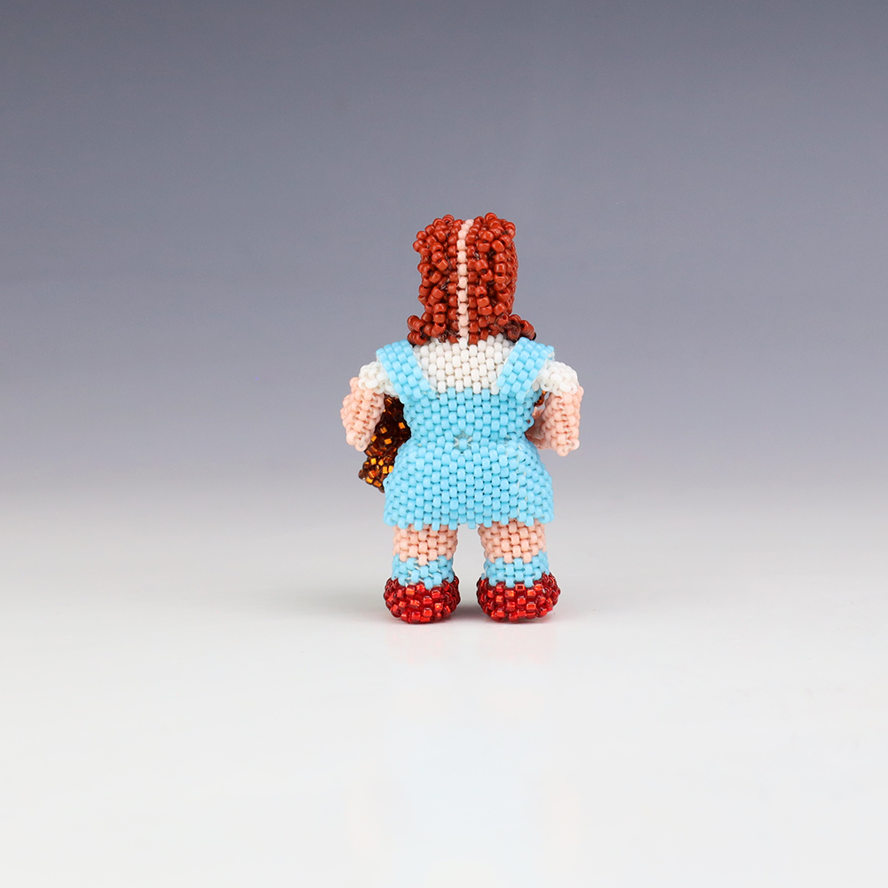 Zuni beadwork has evolved from tourist souvenirs to detailed pieces of folk art. First the Zuni artists carve a wooden form and then they bead over it, using the peyote stitch and seed or glass beads. With a continuous strand, Zuni beaders meticulously create wonderful patterns throughout their beadwork. This exquisite Wizard of Oz set was hand beaded by award winning artist Alesia Poncho. Alesia used tiny beads (size 11) to capture the details in the characters. Signed