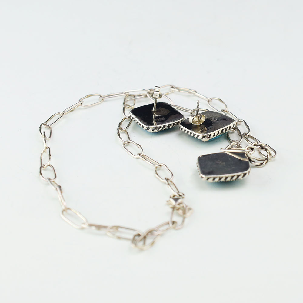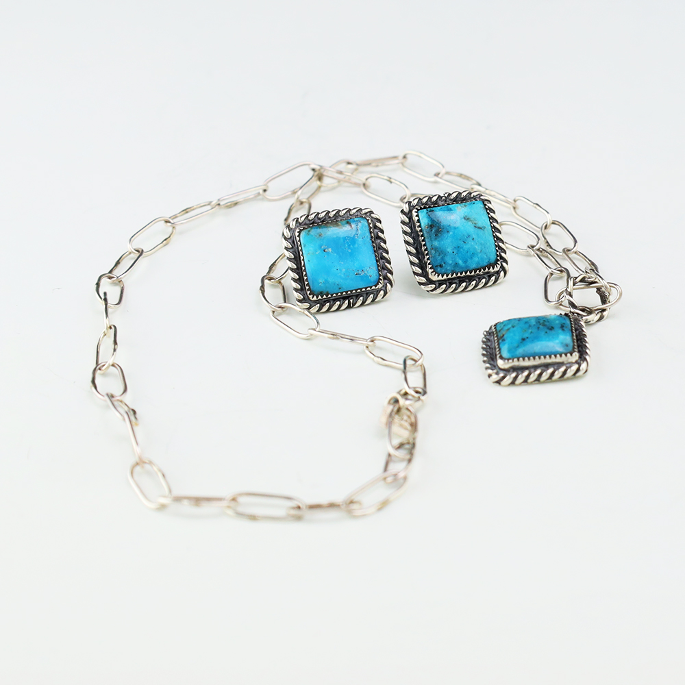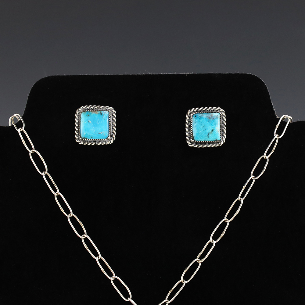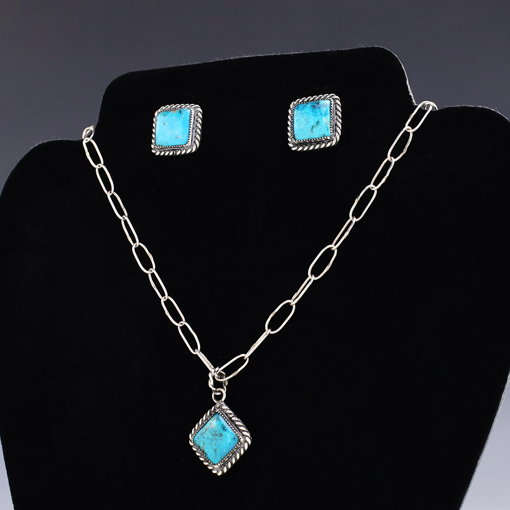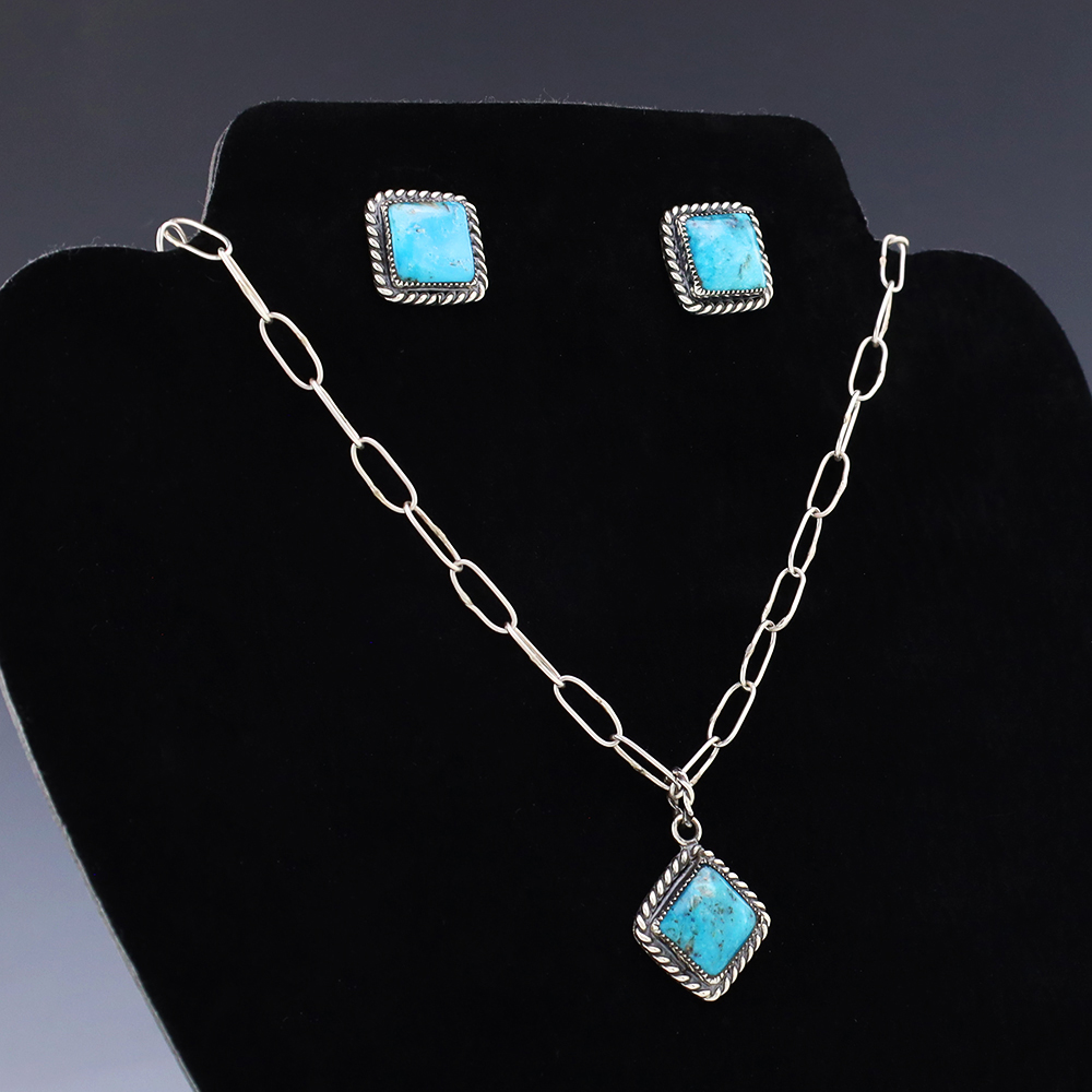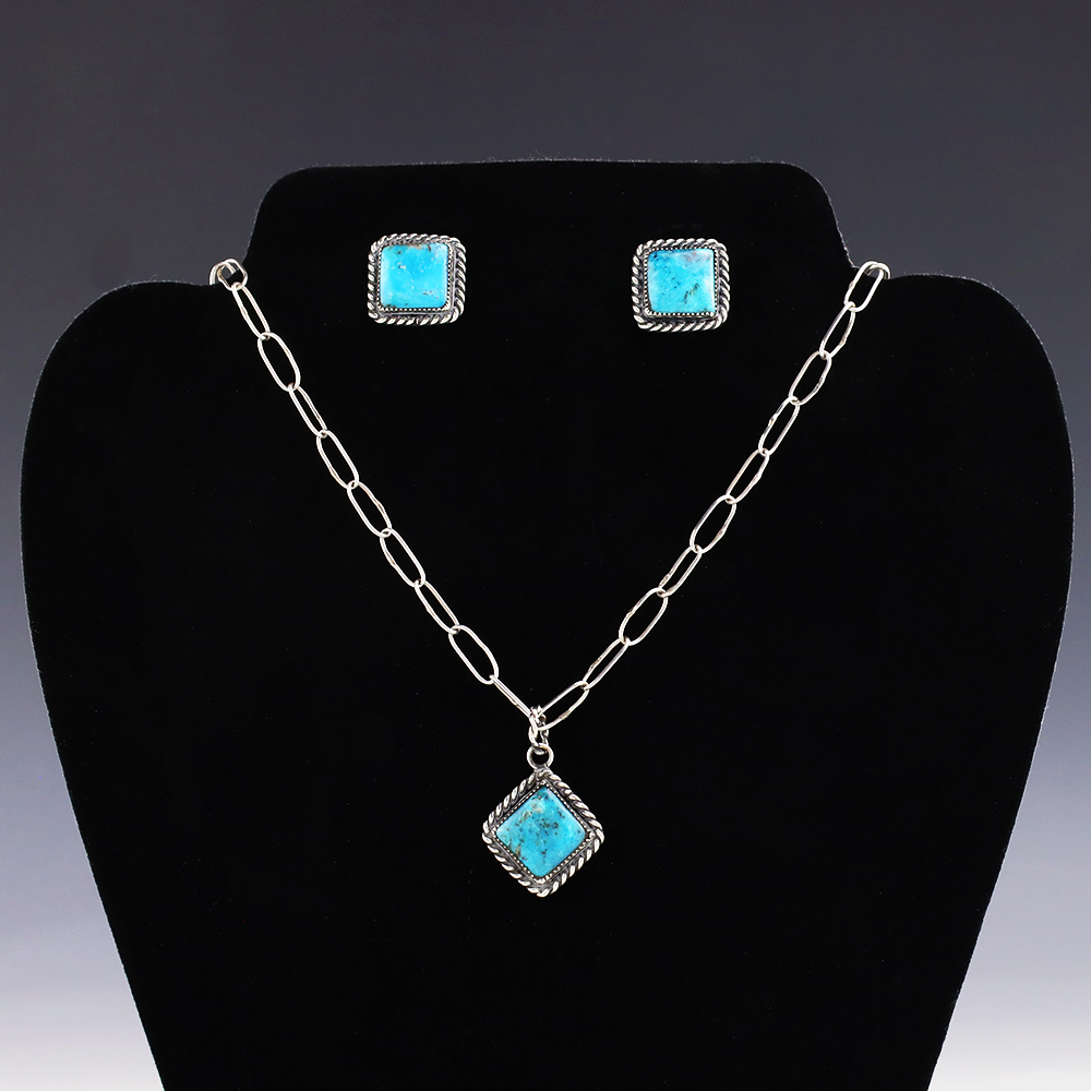 Zuni artist Carlo Lonjose made this beautiful necklace and earring set. Sterling silver and set with natural Blue Gem Turquoise. An exquisite statement piece that you will enjoy for many years. The necklace weighs 12 grams. The earrings weighs 8 grams. Signed