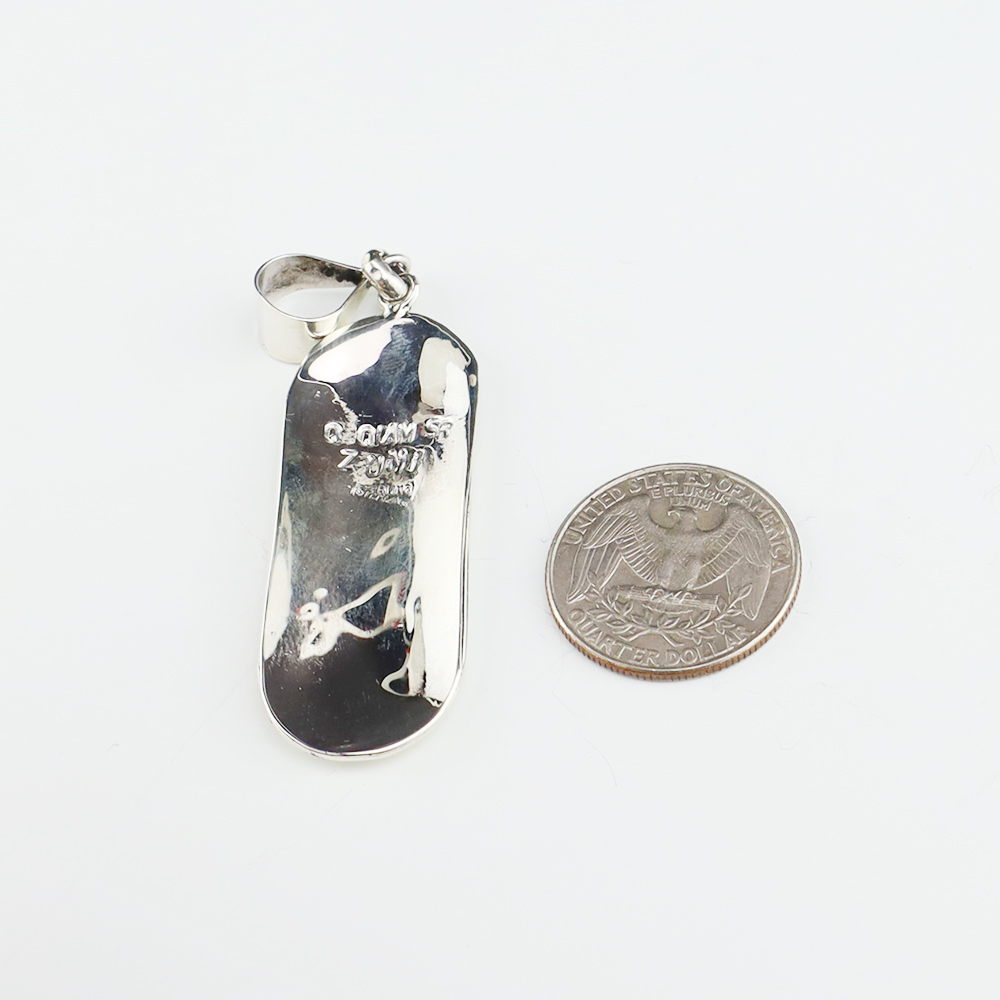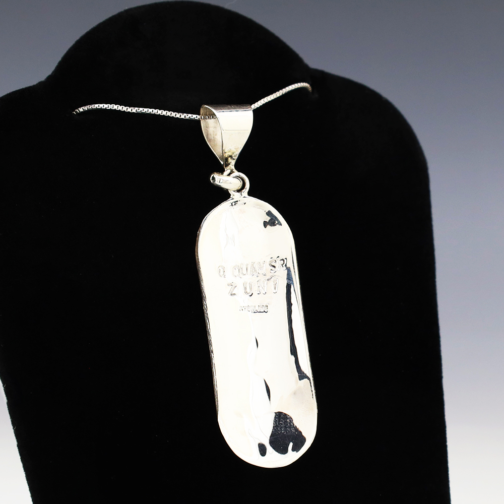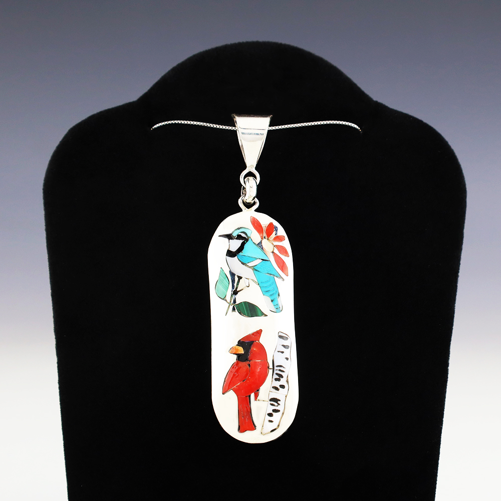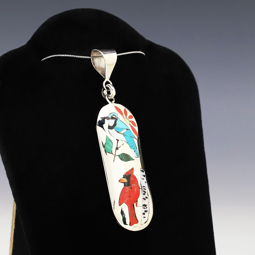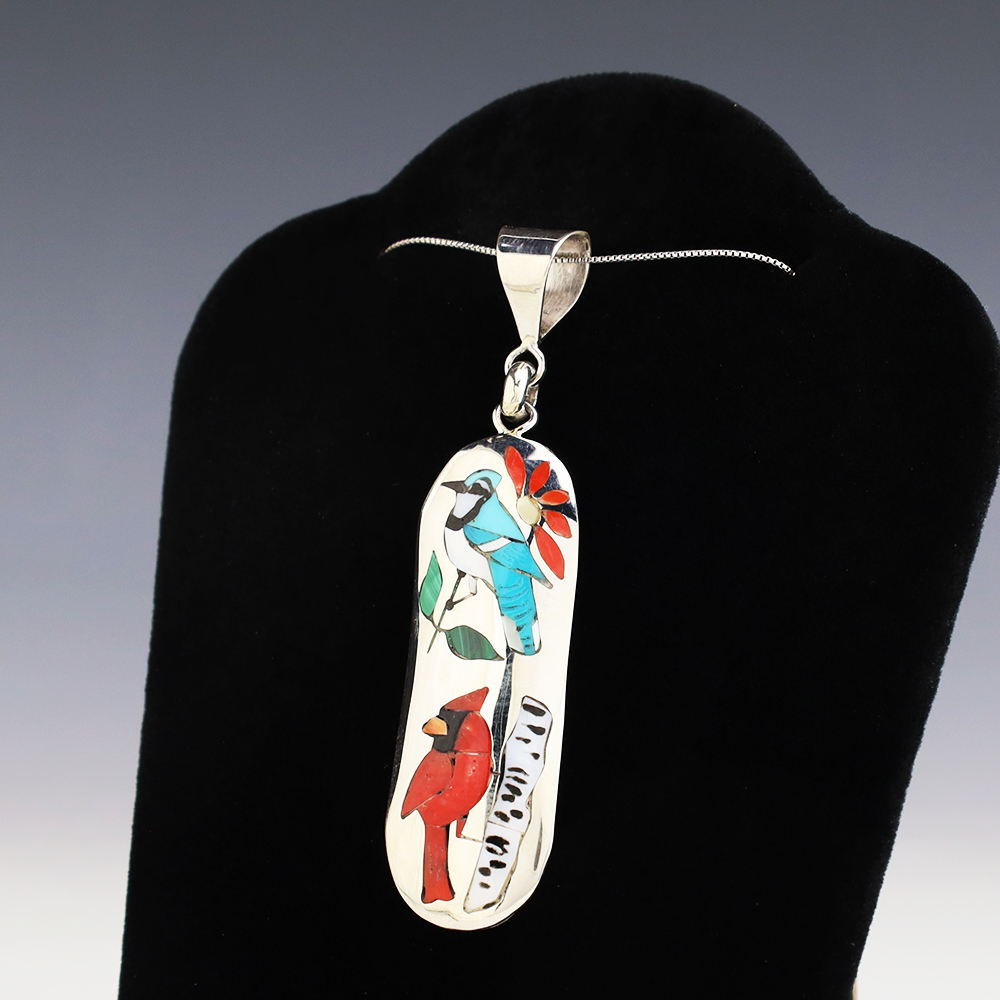 Zuni artist Quintin Quam hand made this beautiful pendant depicting a Blue Jay and a Cardinal. The sterling silver pendant is intricately inlaid with Coral, Spiny Oyster, Turquoise, Jet, Malachite, and Mother of Pearl Shell. Amazing detail! Weighs 10 grams. (Chain not included) Signed