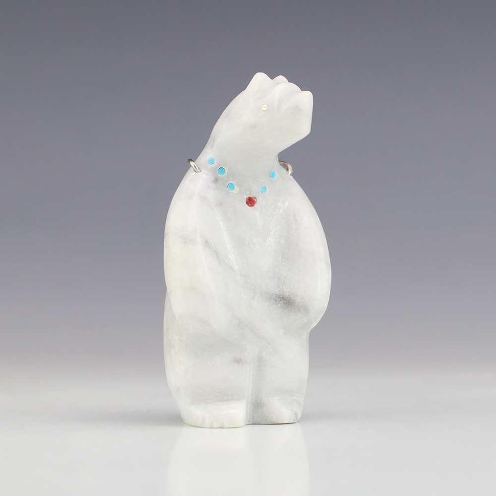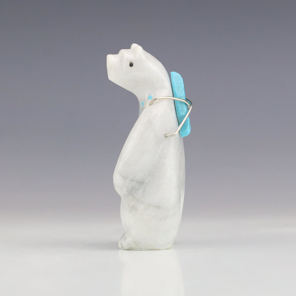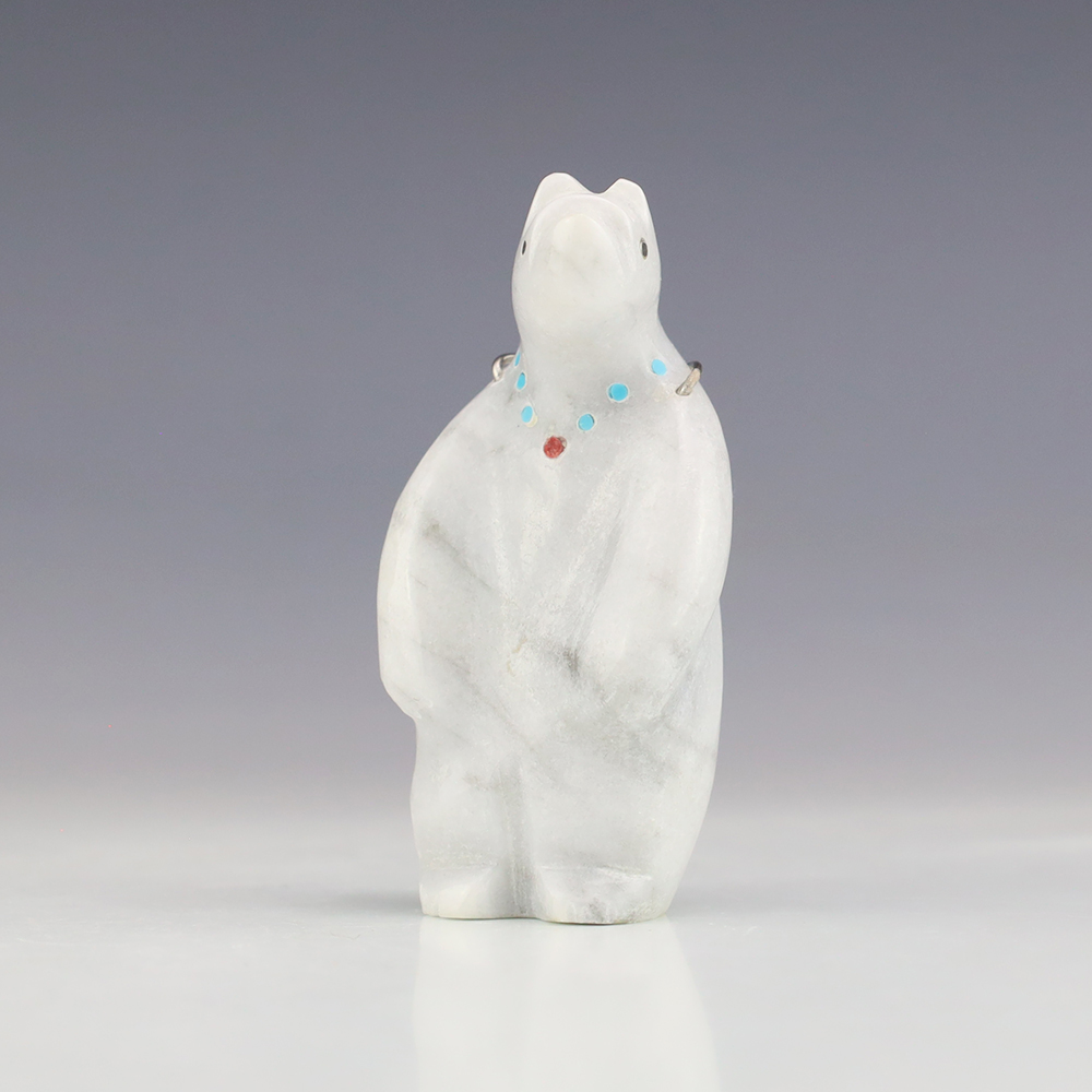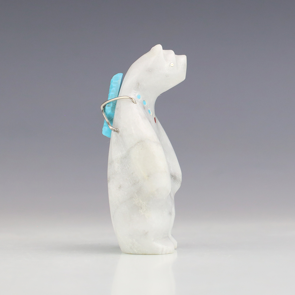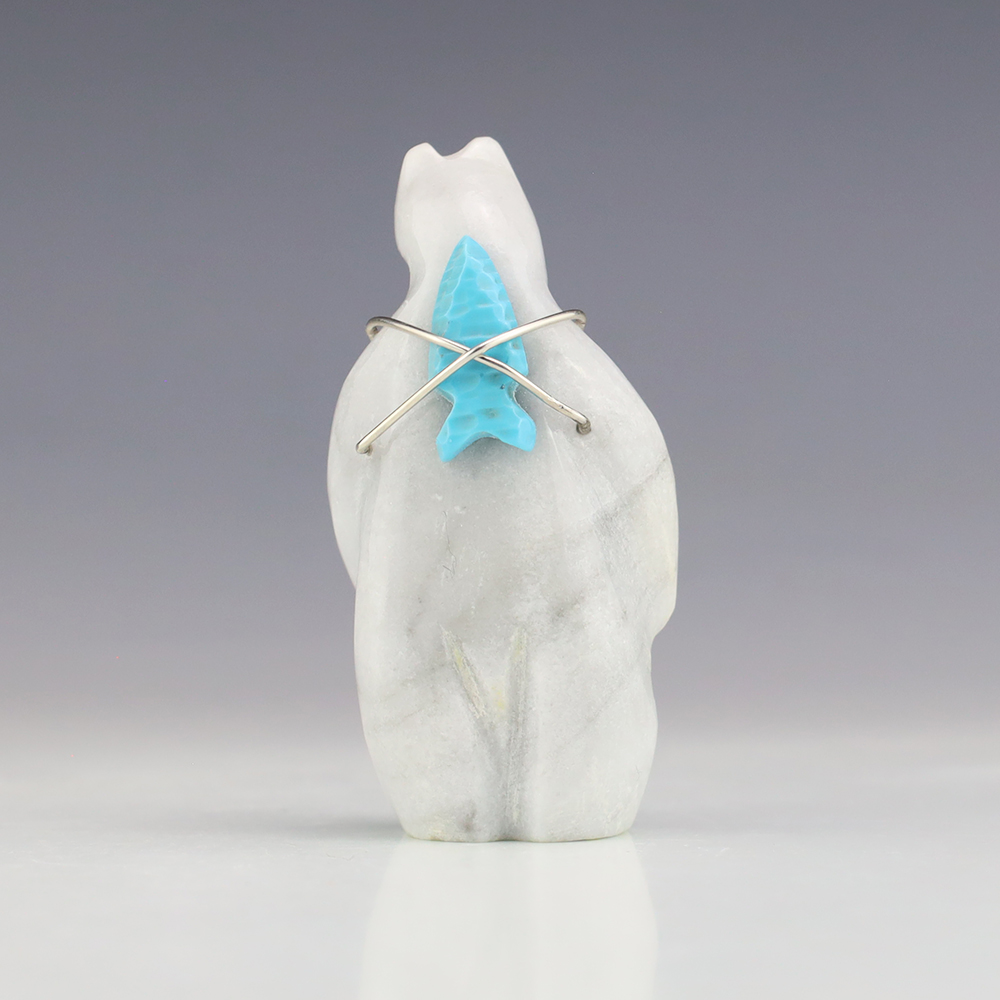 Zuni bear fetishes represent healing and strength. This wonderful bear fetish is made out of Carrara Marble by Zuni artist Todd Westika. It is adorned with Turquoise, Coral, and silver. This fetish showcases the graceful lines and sculptural quality of Todd’s carvings. A great addition to your Native American or Zuni fetish collection. Signed