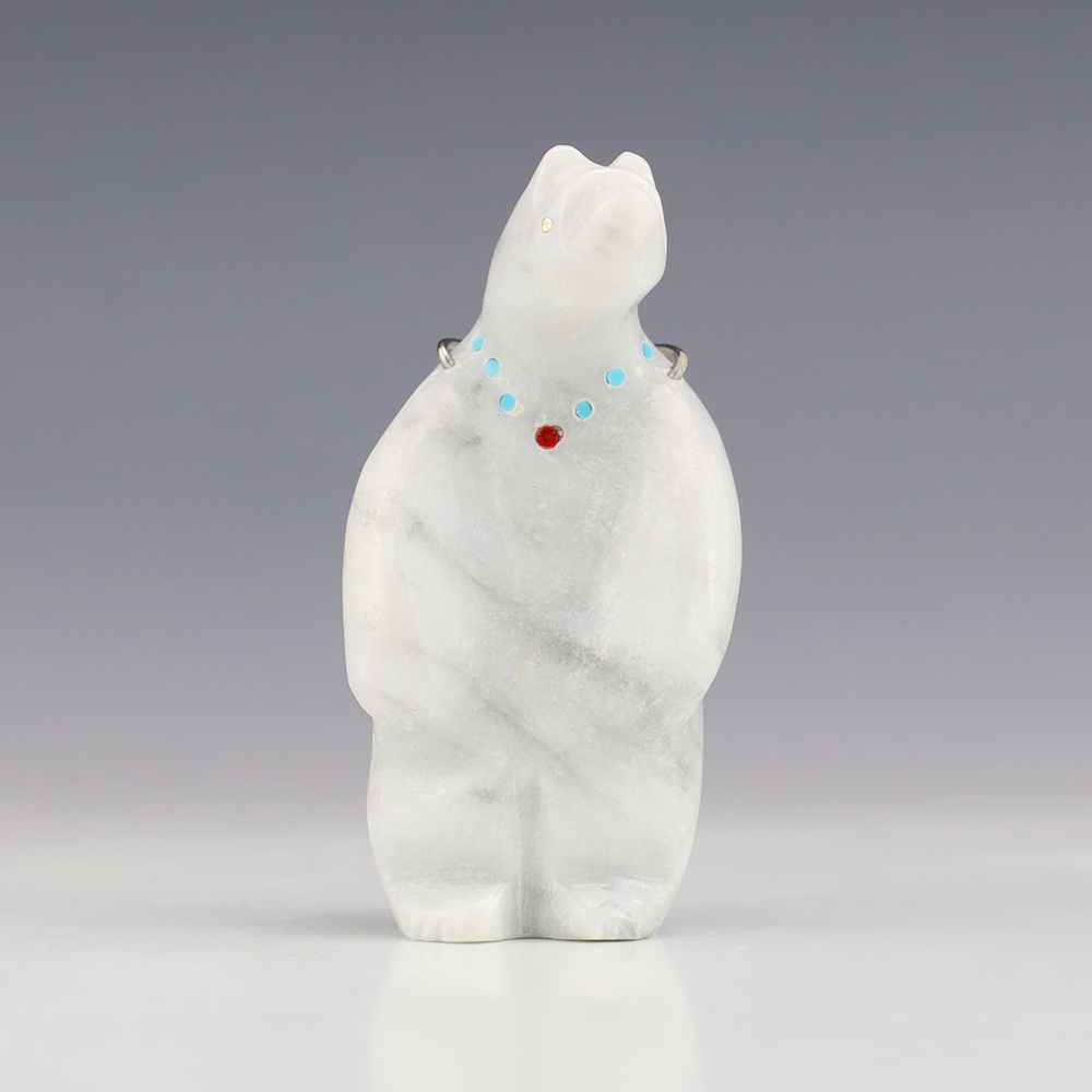 Zuni bear fetishes represent healing and strength. This wonderful bear fetish is made out of Carrara Marble by Zuni artist Todd Westika. It is adorned with Turquoise, Coral, and silver. This fetish showcases the graceful lines and sculptural quality of Todd’s carvings. A great addition to your Native American or Zuni fetish collection. Signed