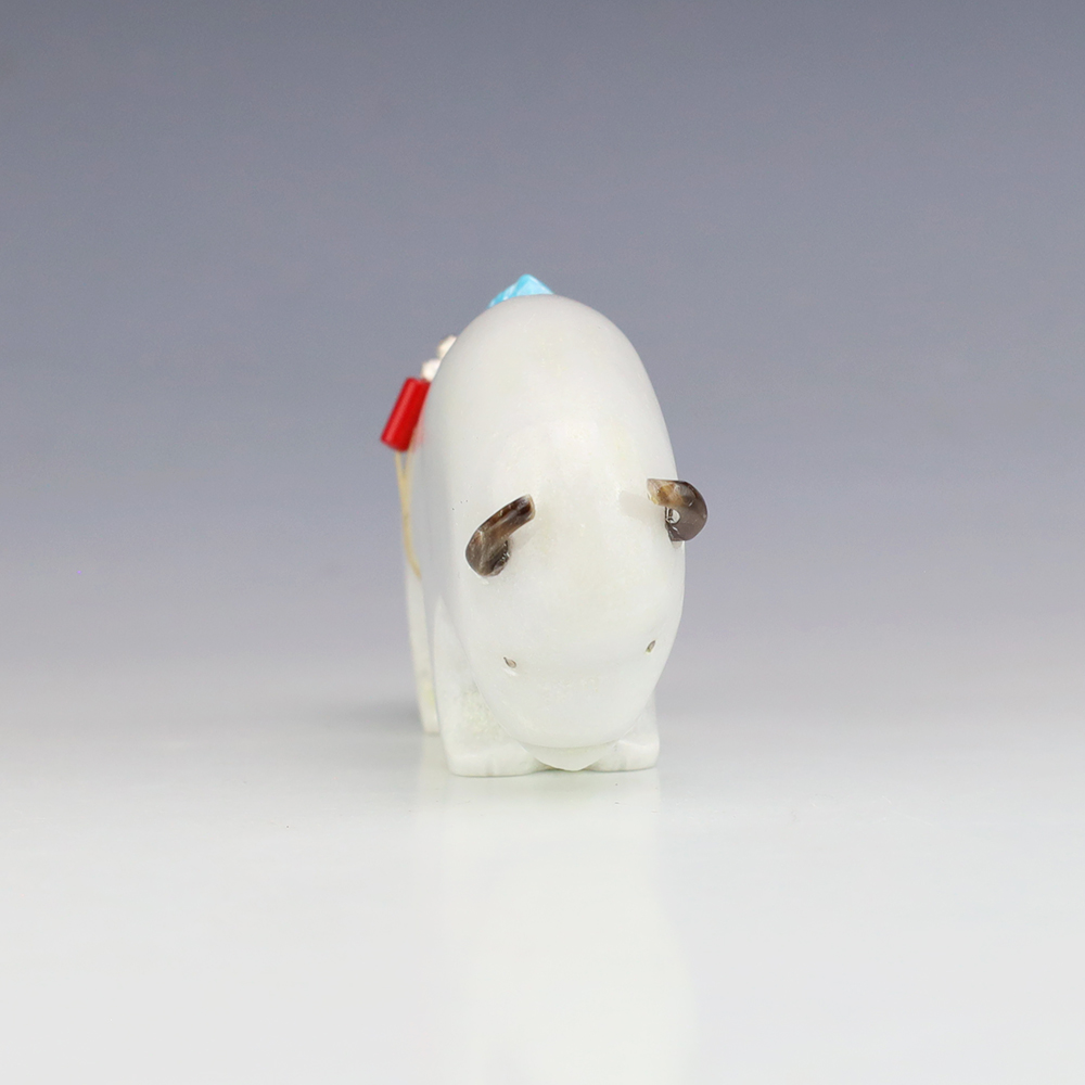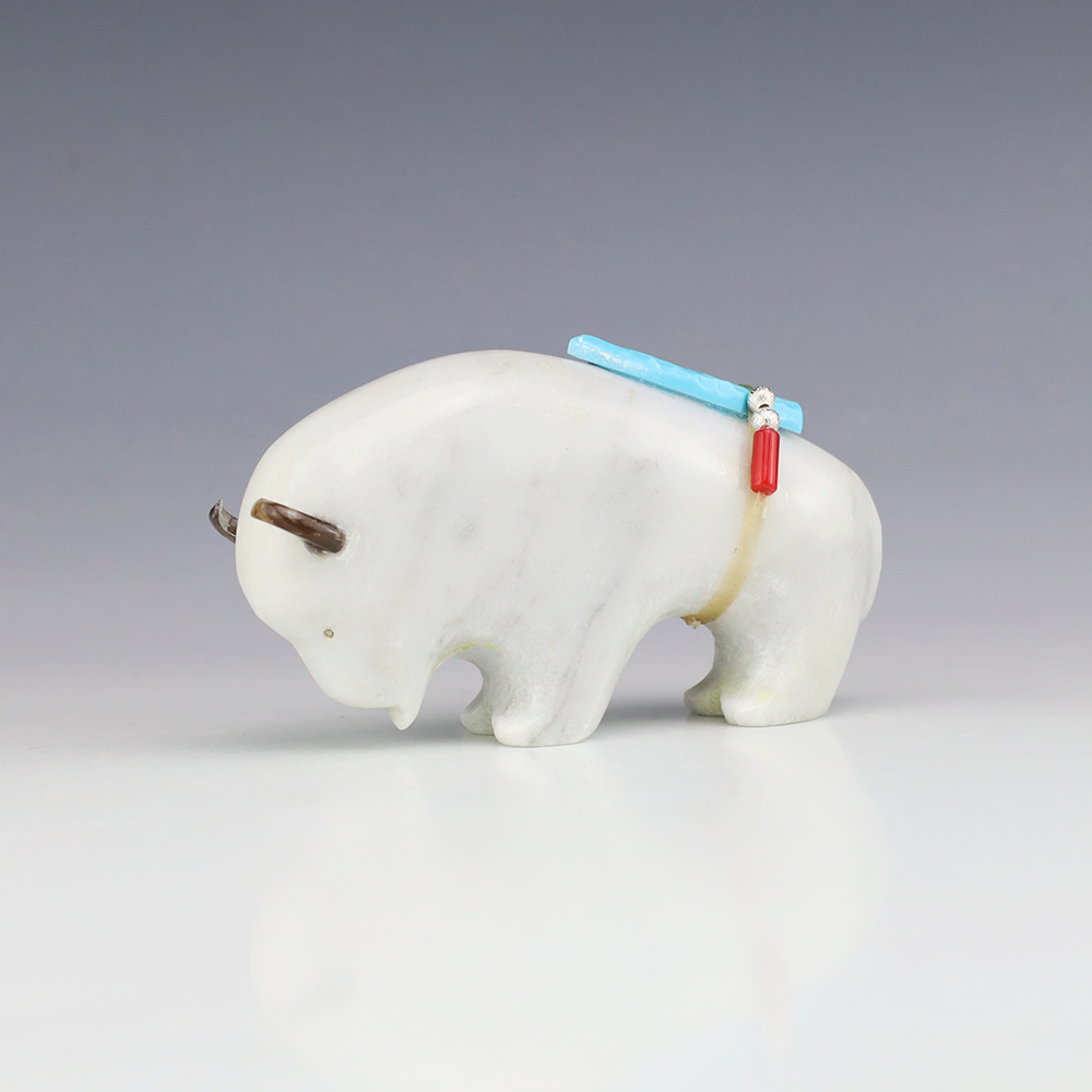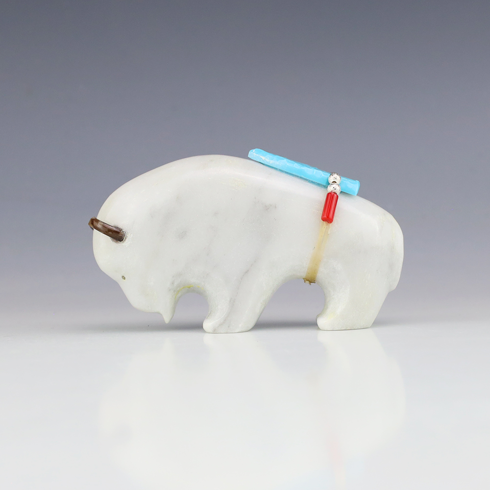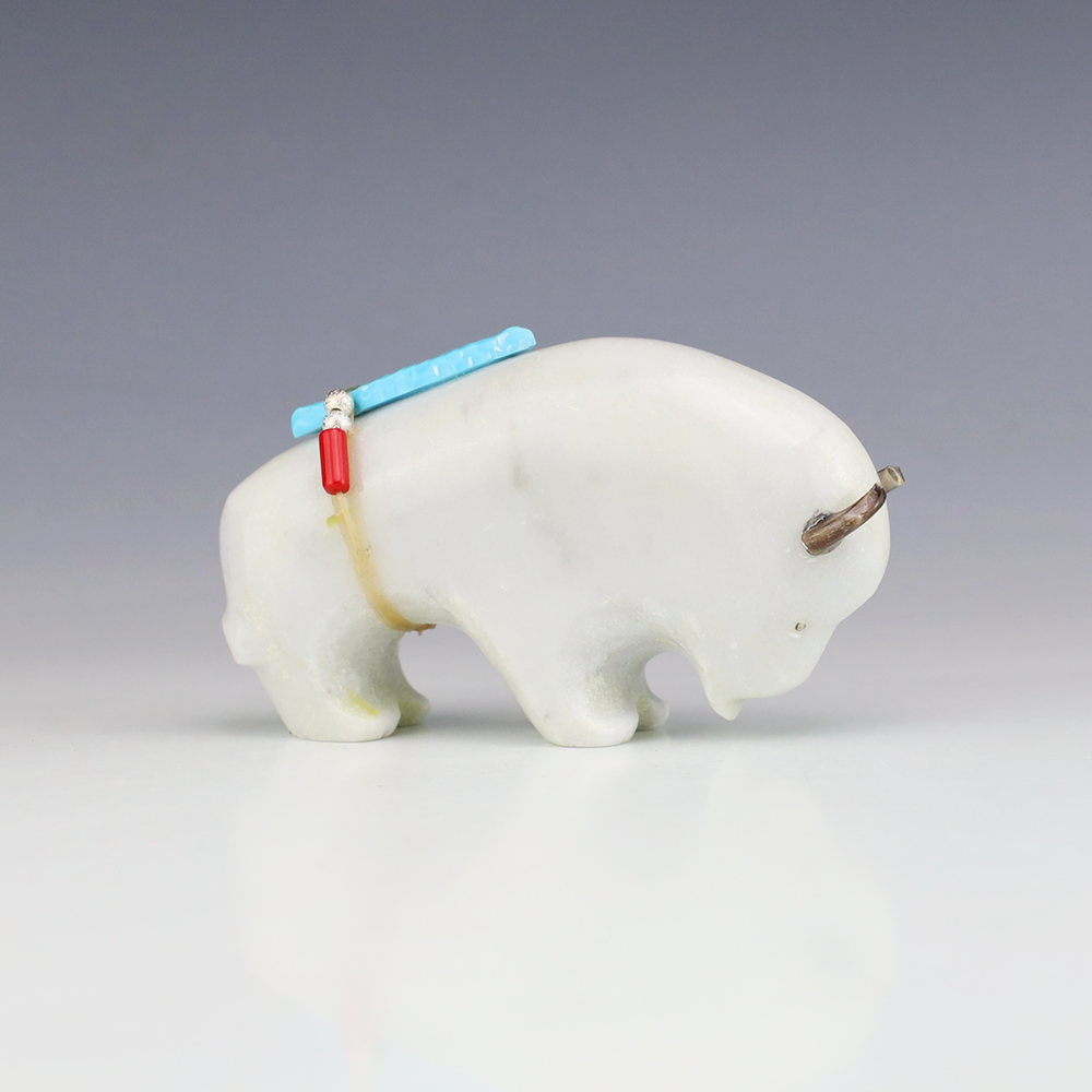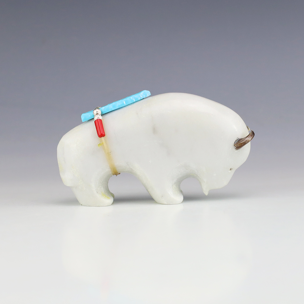 Zuni fetish artist Todd Westika hand carved this magnificent buffalo fetish out of Carrara Marble and is bundled with Turquoise, Coral, and silver. Bold form that gives this buffalo fetish a sense of strength and endurance. Signed