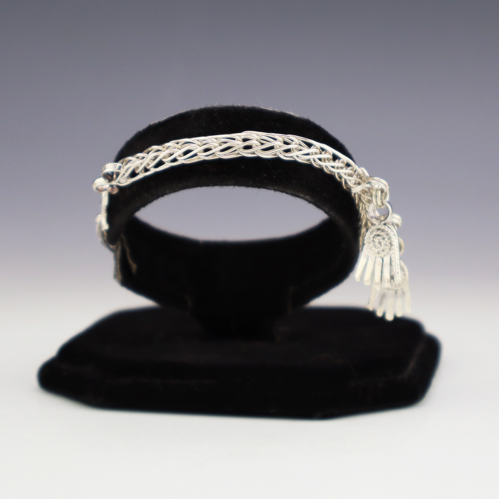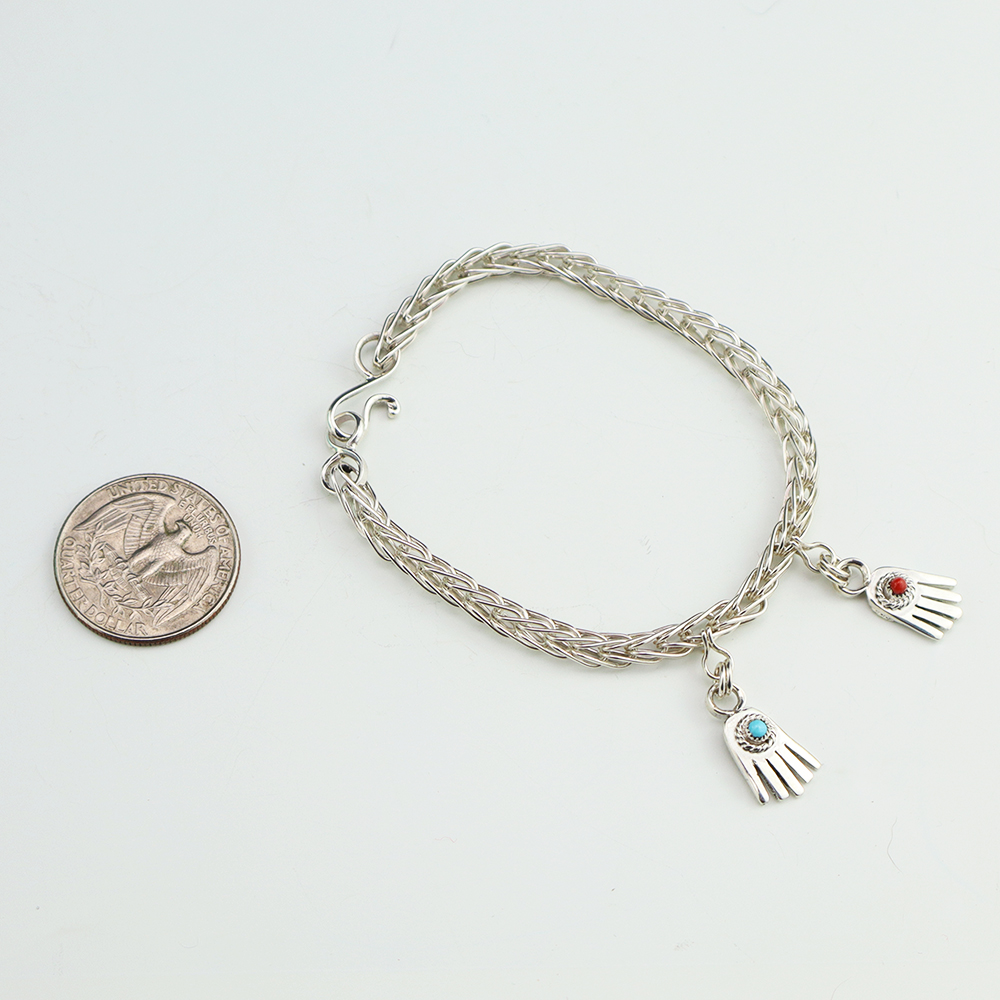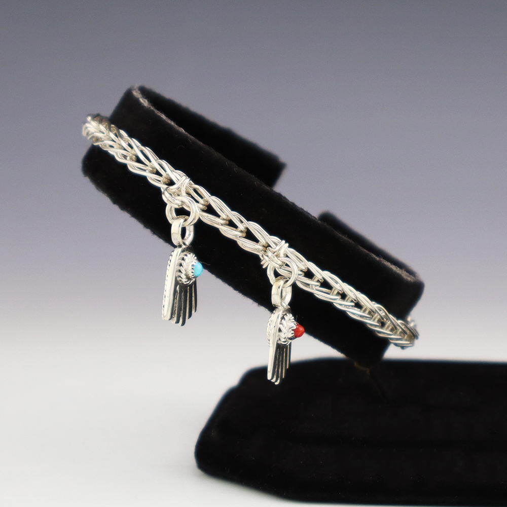 Zuni jeweler Smokey Gchachu hand crafted this marvelous woven chain bracelet. The bracelet is made out of sterling silver, Coral, and Turquoise. Weighs 12 grams.