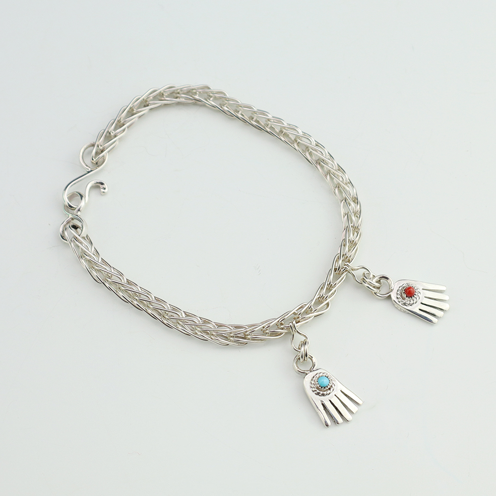 Zuni jeweler Smokey Gchachu hand crafted this marvelous woven chain bracelet. The bracelet is made out of sterling silver, Coral, and Turquoise. Weighs 12 grams.