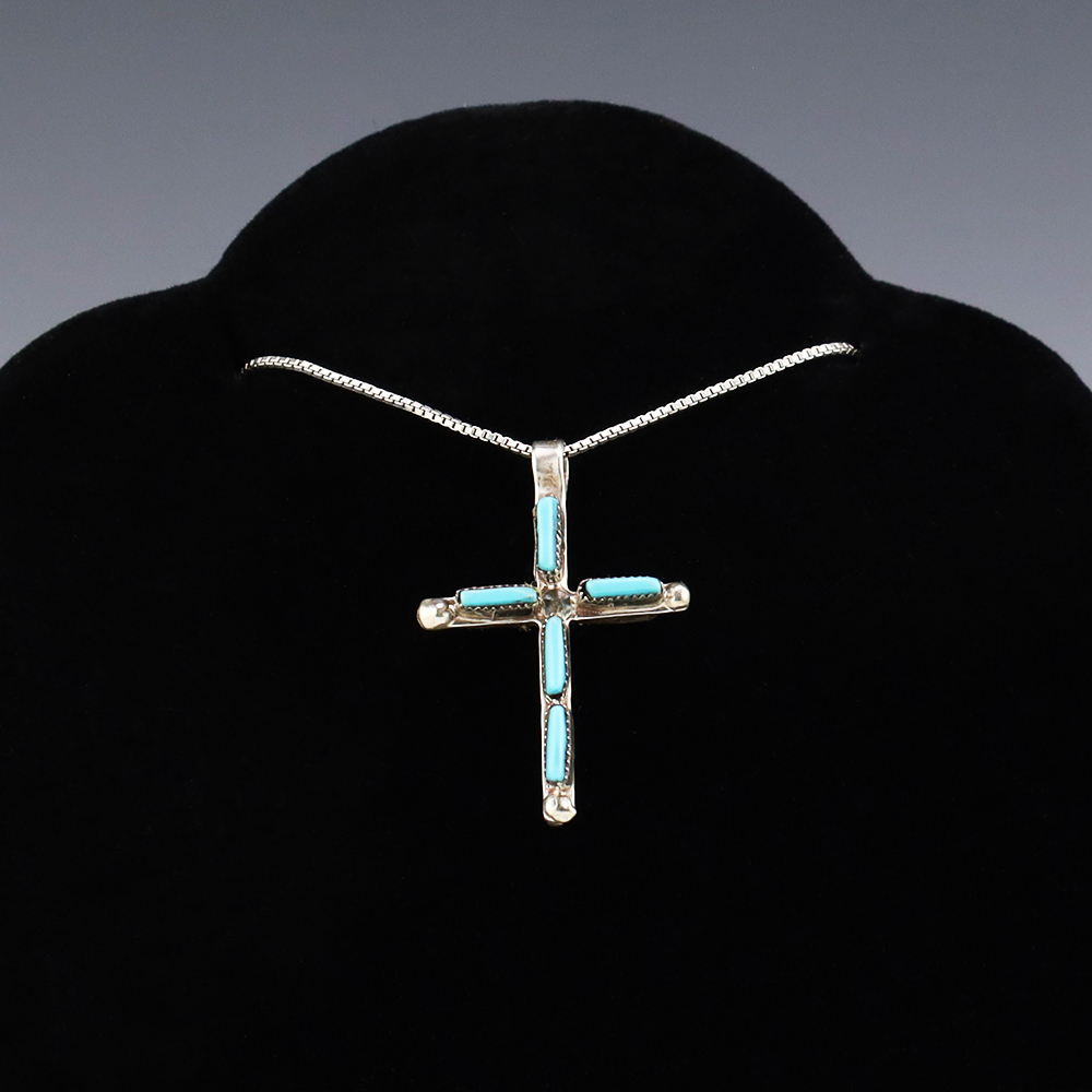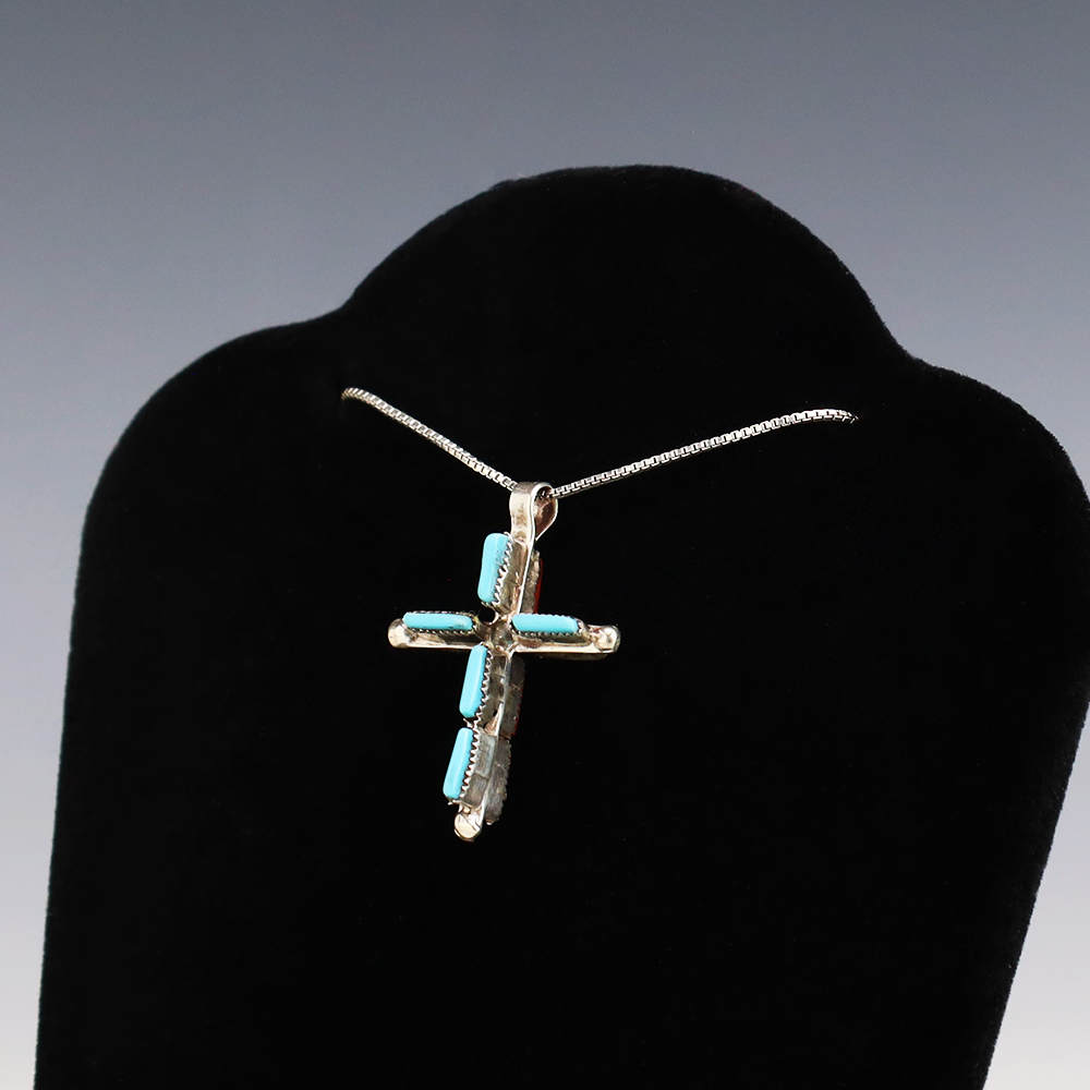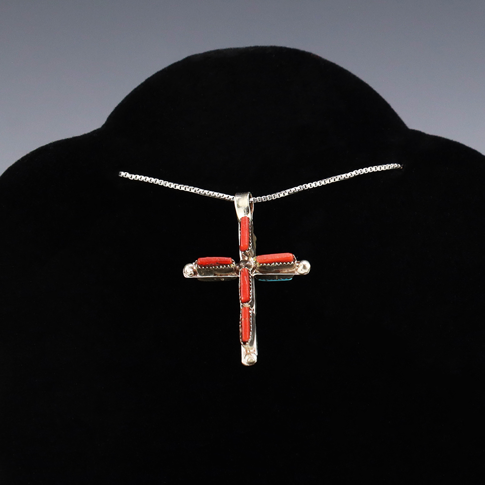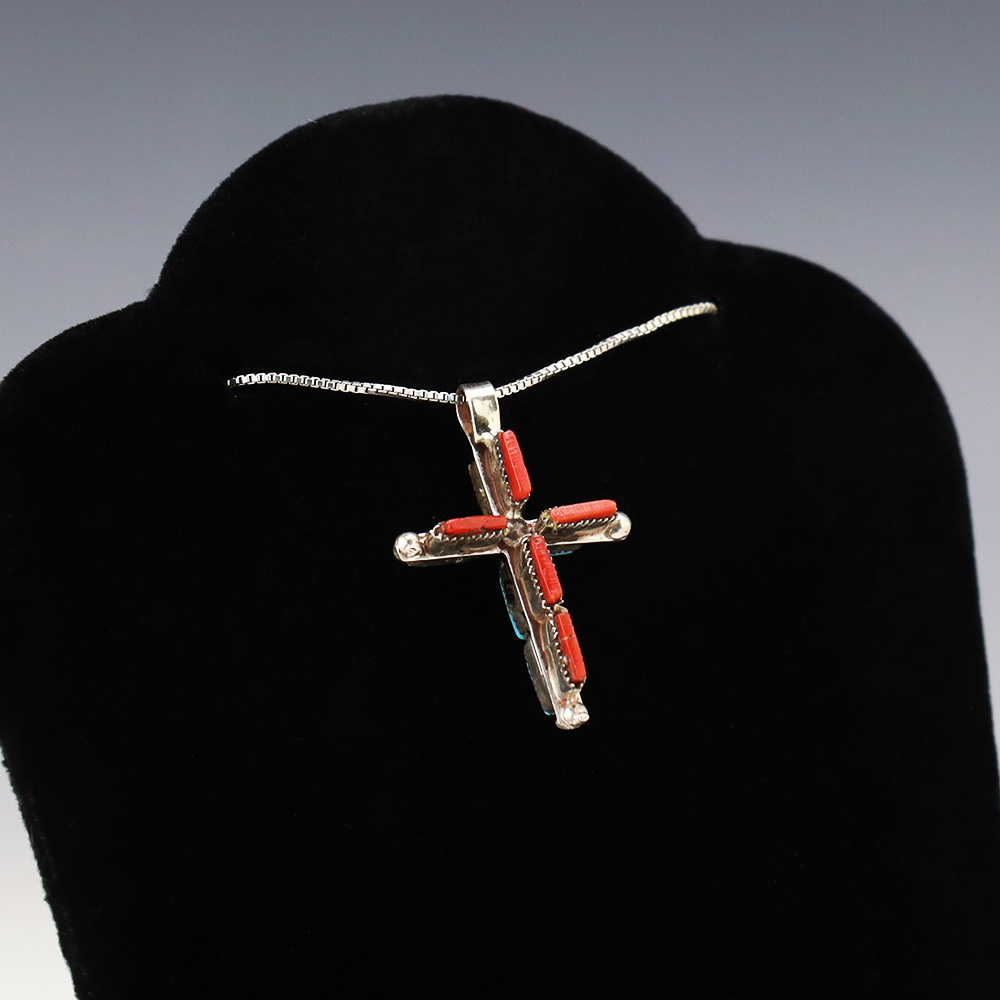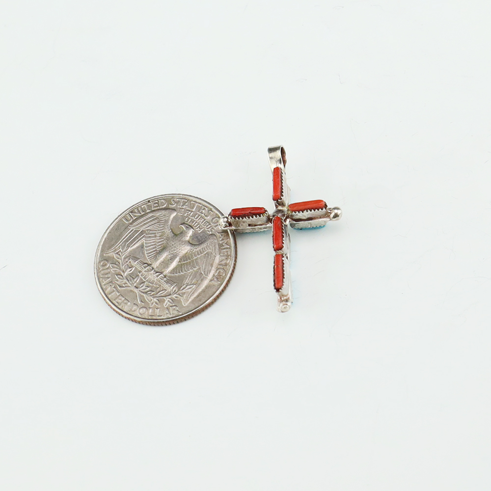 Beautiful cross pendant. One side is set with Coral and the other side is set with Turquoise. Zuni artists are known for their fine lapidary skills. Each stone is hand cut, polished, and set into a sterling silver setting. Weighs 2 grams. (Chain not included)