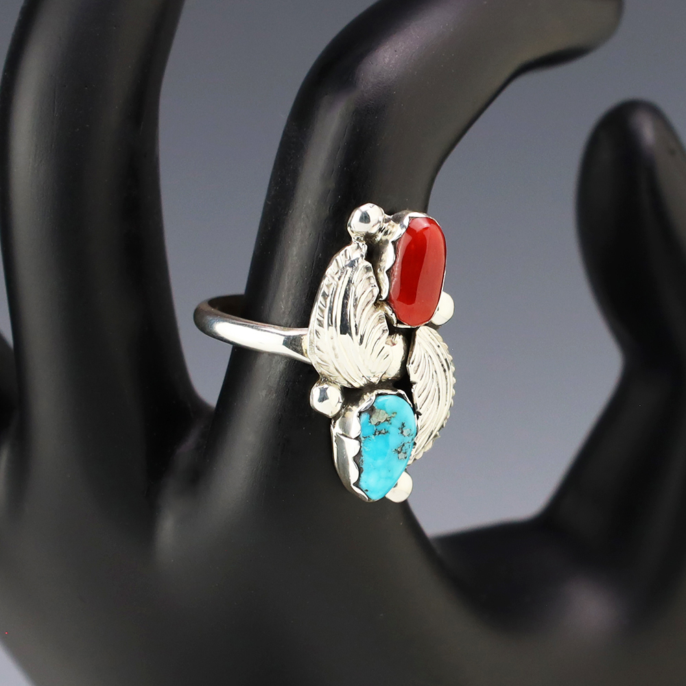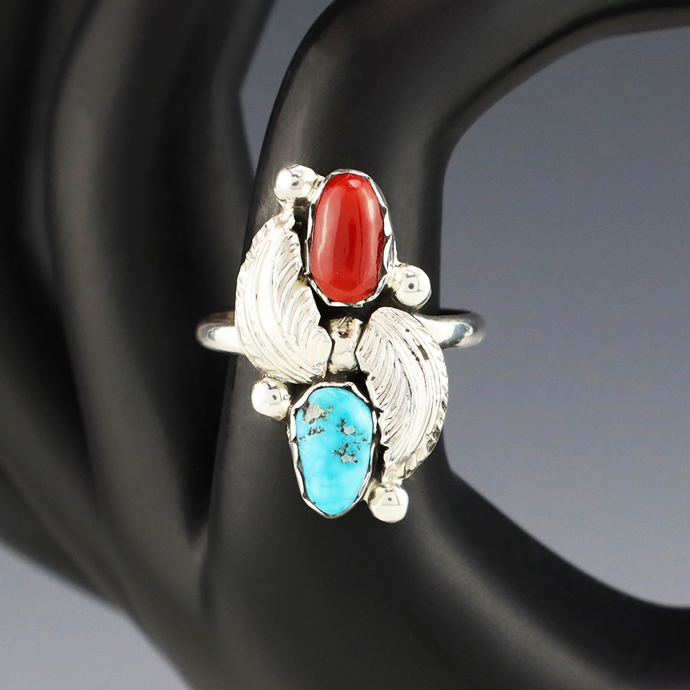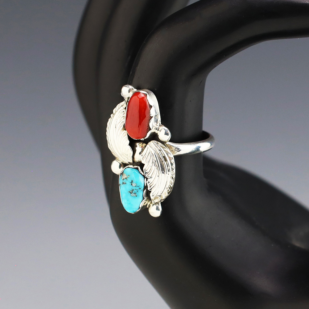 Zuni jeweler Lydia Simplicio made this lovely ring. Zuni artists are known for their fine lapidary skills. Each stone is hand cut, polished, and set into a sterling silver setting. The ring is set with a Turquoise and a Coral stone . Weighs 4 grams. Size 8 1/2. Signed